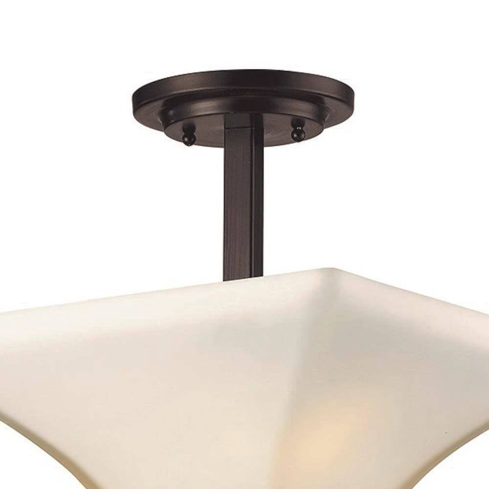 The Cameo Collection from Bel Air combines transitional design themes with functionality for a family of interior lights designed to coordinate seamlessly with your home’s decor and existing fixtures while providing ample illumination for your daily needs. The Cameo semi flush mount is a decorative piece that works well in hallways, entryways, bedrooms, living spaces, and more. Use as a single unit for accent lighting in smaller spaces, or purchase as a set for use in larger rooms where additional task lighting is needed. The sleek ceiling light is constructed of a frosted glass shade with a square shape, flared sides that reach towards the ceiling, and a decorative rubbed oil bronze finial cap at the bottom of the glass. The glass is suspended by a fixed height extension rod that connects to a round ceiling canopy. The top of the fixture remains open to allow easy access to change the bulbs, as well as to allow light to pour out from above the glass. Shop the Cameo Collection for additional interior lighting pieces to coordinate throughout your home.