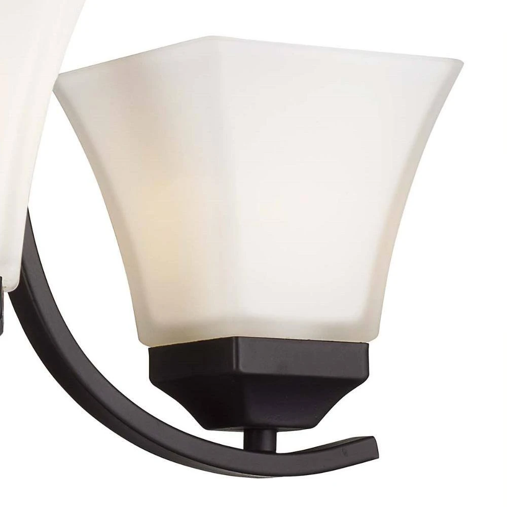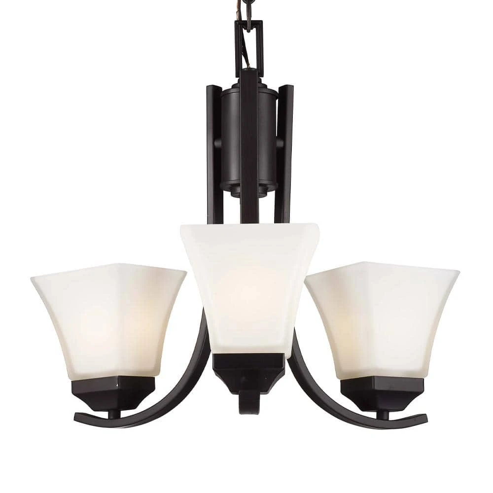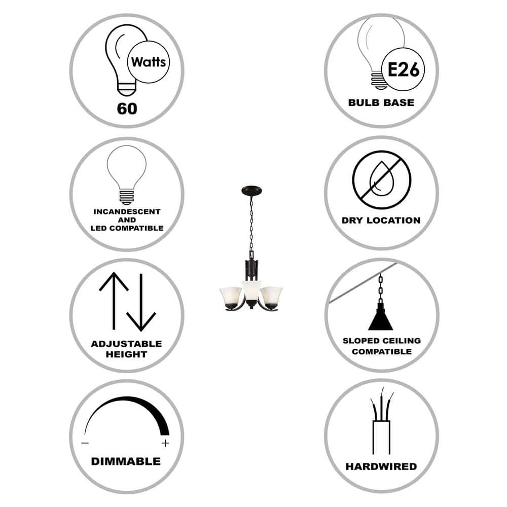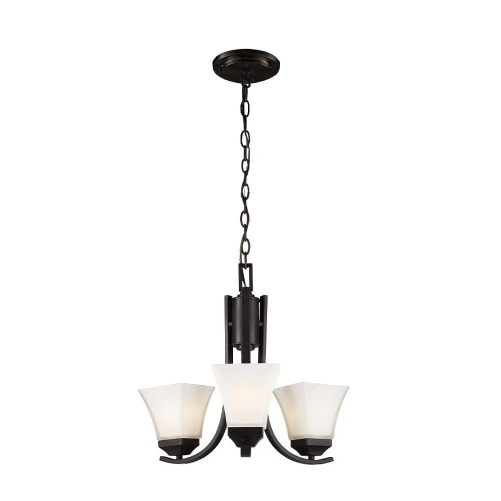 The Cameo Collection from Bel Air exhibits transitional style interior lighting designed to add decorative, functional lighting to your home’s foyer entryways and dining areas. The hallmark of the family is its clean sharp lines, geometric contours, and discretely futuristic appeal. The Cameo 17.25 inch round single tier chandelier is a versatile piece that works well in small to medium sized rooms. The piece includes three white frosted glass shades that compliment the rubbed oil bronze finish, and a matching bronze chain for hanging. Each of the flared shades houses a single 60-watt light bulb, and LED bulbs can be used for energy efficiency. The Cameo chandelier is height adjustable, and can be hung from a sloped ceiling.