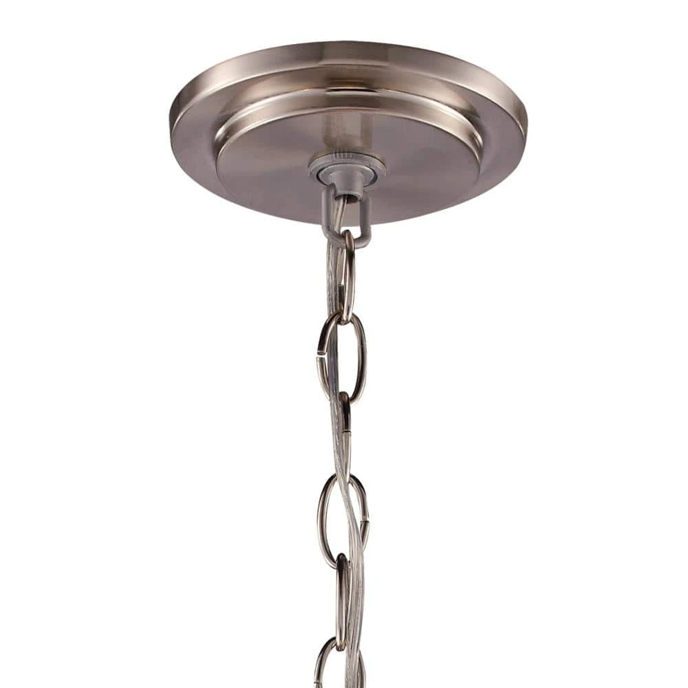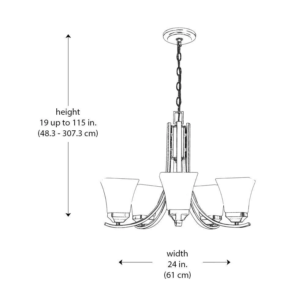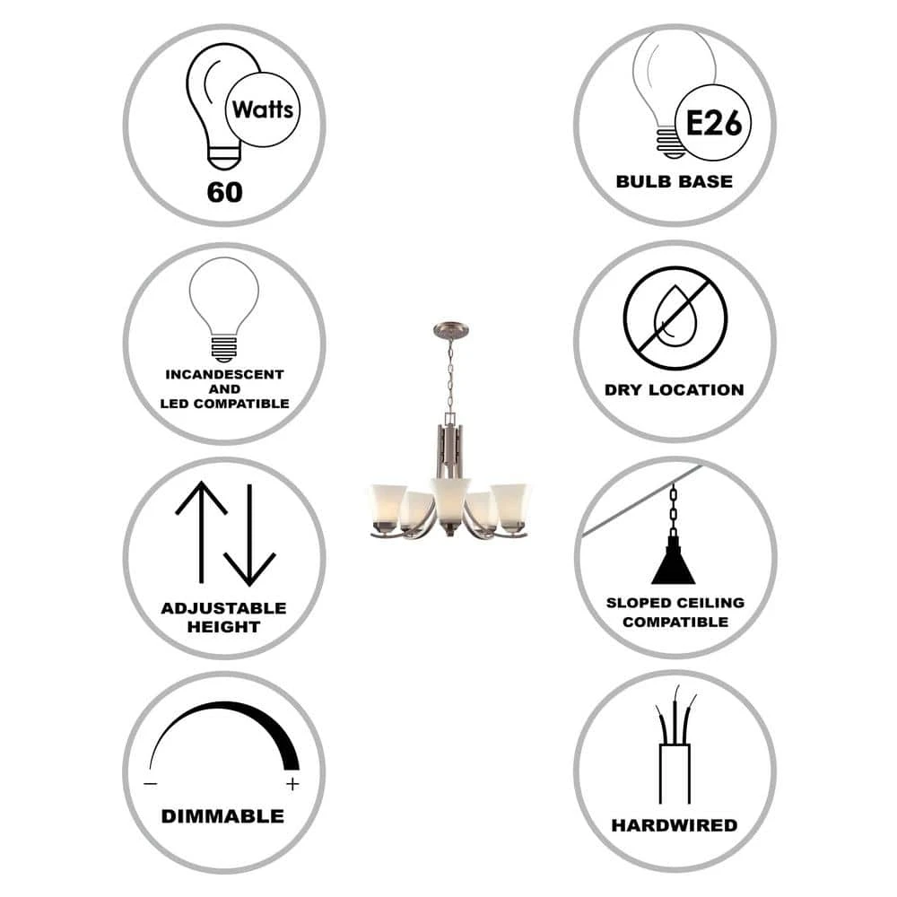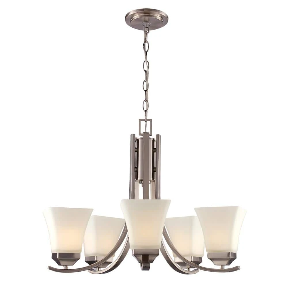 The Cameo Collection from Bel Air exhibits transitional style interior lighting designed to add decorative, functional lighting to your home’s foyer entryways and dining areas. The Cameo 24 in. round single tier chandelier is a versatile piece that works well in medium to larger sized rooms. The piece includes 5 flared glass shades that compliment the brushed nickel finish, and a matching nickel chain for hanging. Each of the white glass shades houses a single 60-Watt light bulb, and LED bulbs can be used for energy efficiency. The Cameo chandelier is height adjustable, and can be hung from a sloped ceiling.
