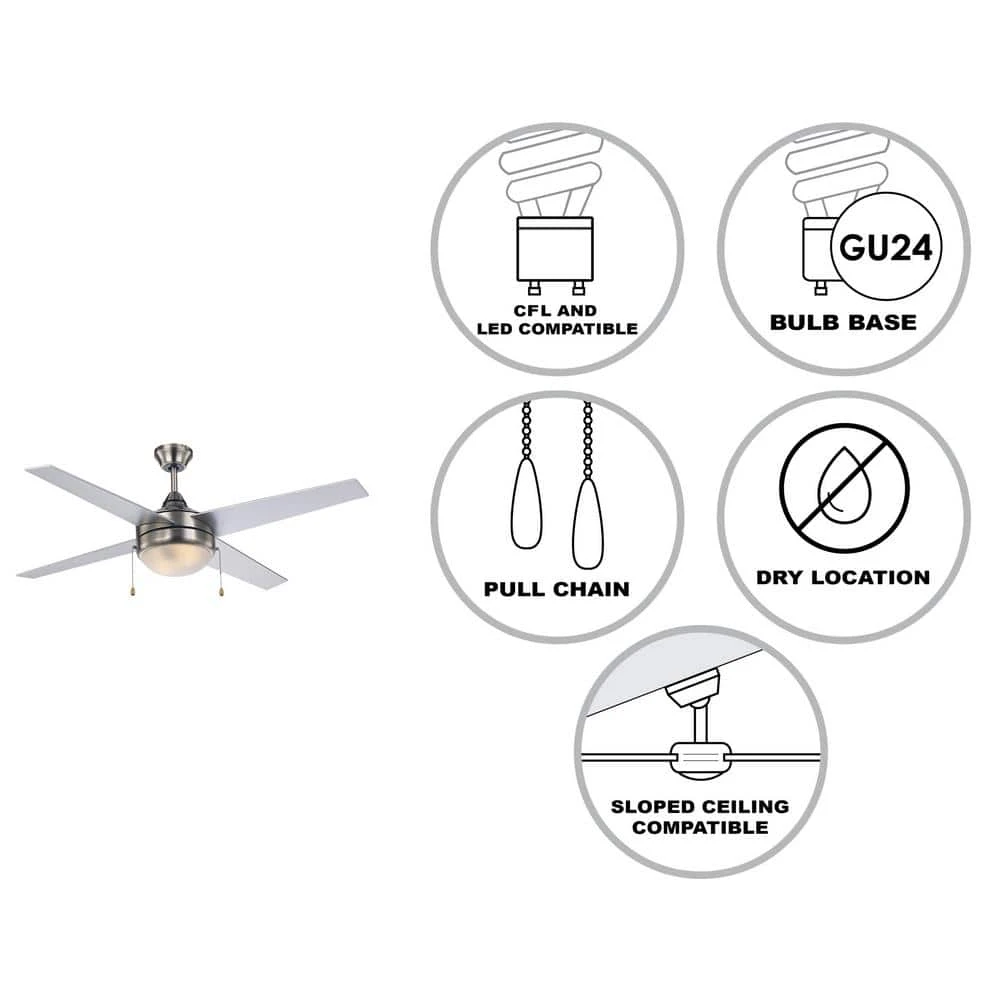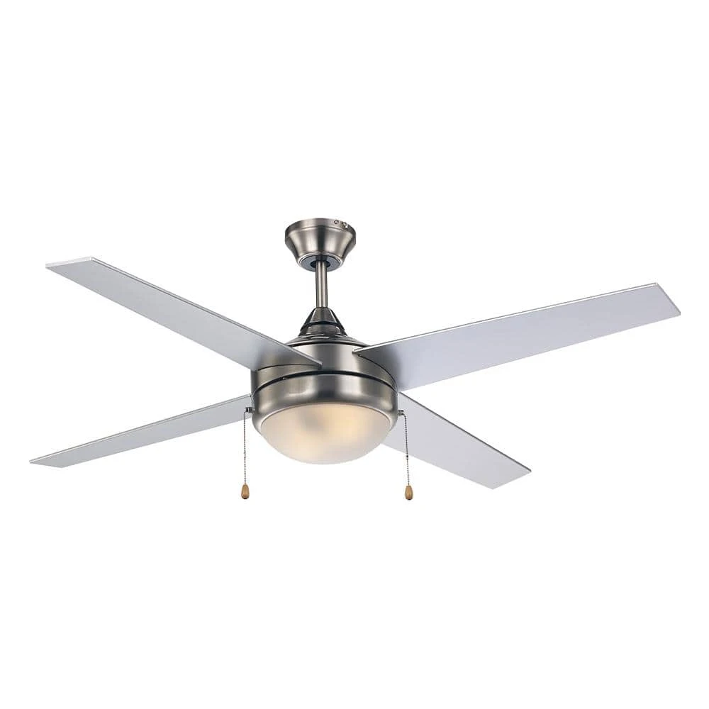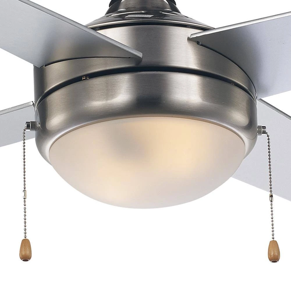 The Cappleman family of ceiling fans are designed to add elegance to your home while providing refreshing air circulation, ample illumination and a pleasing design. This 52-inch round ceiling fan is featured in a metallic brushed nickel finish and includes 4 matching brushed nickel blades. The light kit takes energy saving bi-pin CFL bulbs and is shaded by a white frosted glass globe. Separate pull-chains are included to turn the lights on/off and cycle through the 3-speeds of the fan motor. The combination of metallic nickel and white glass create a contemporary feel that lends itself well to modern and transitional styled homes. This ceiling fan mounts with a fixed-height downrod for a semi-flush design or can be mounted directly to the round ceiling canopy for a flush mounted installation. This unit is ideal for use in home offices, living rooms, bedrooms and more.