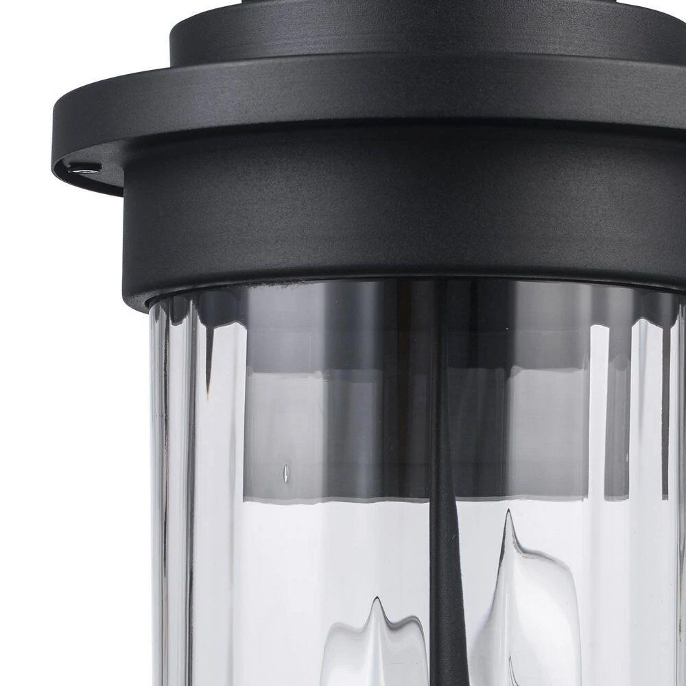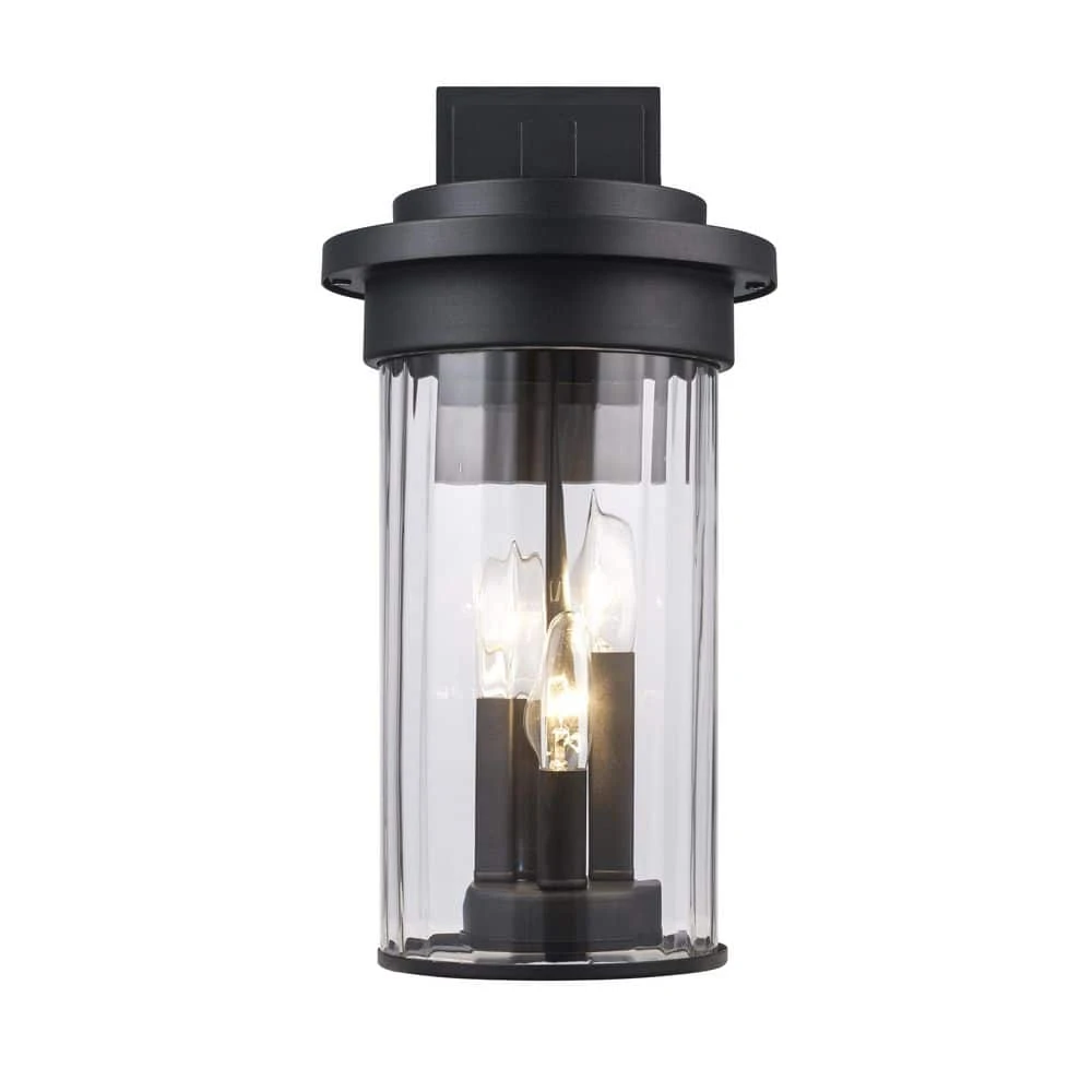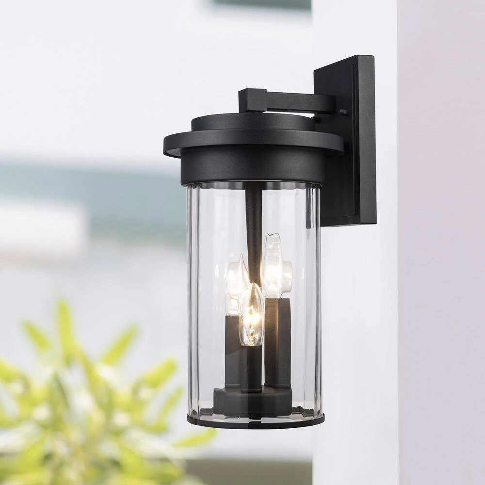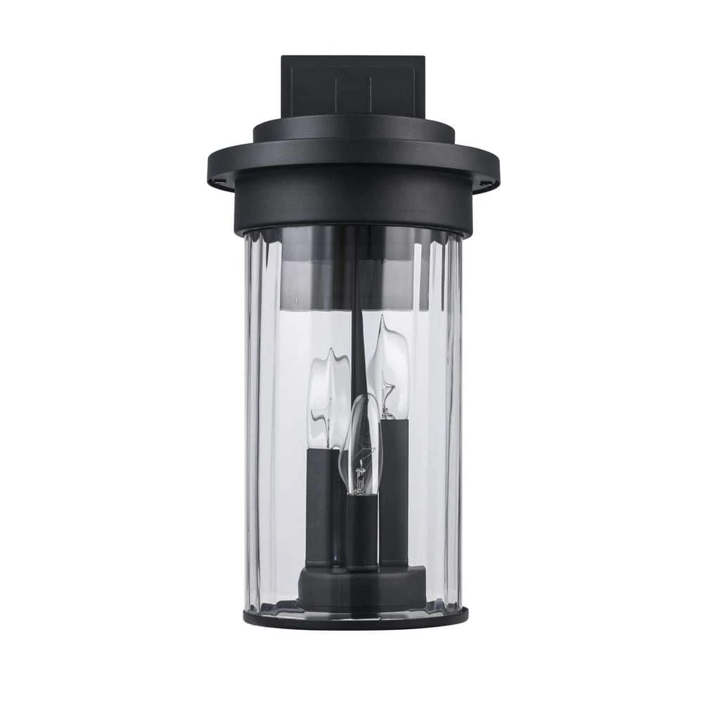 The Carmel Collection from Bel Air exhibits transitional outdoor lights that are ideal for adding area lighting to a variety of exterior living spaces. The Carmel medium-sized wall light is inspired by a lantern design and features a cylindrical frame and rectangular wall plate that attaches firmly to any exterior wall. The fixture is constructed of metal and a clear glass shade with a decorative fluted design. The sconce is finished in black to coordinate with a variety of exterior home styles and with existing black-finished fixtures and hardware. Install the Carmel wall light on either side of a garage door to light up your home’s driveway, near porch entryways and access points or along outdoor pathways and steps. Shop the Carmel collection for coordinating hanging and post top fixtures.