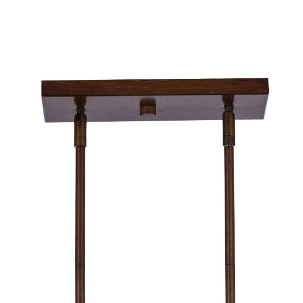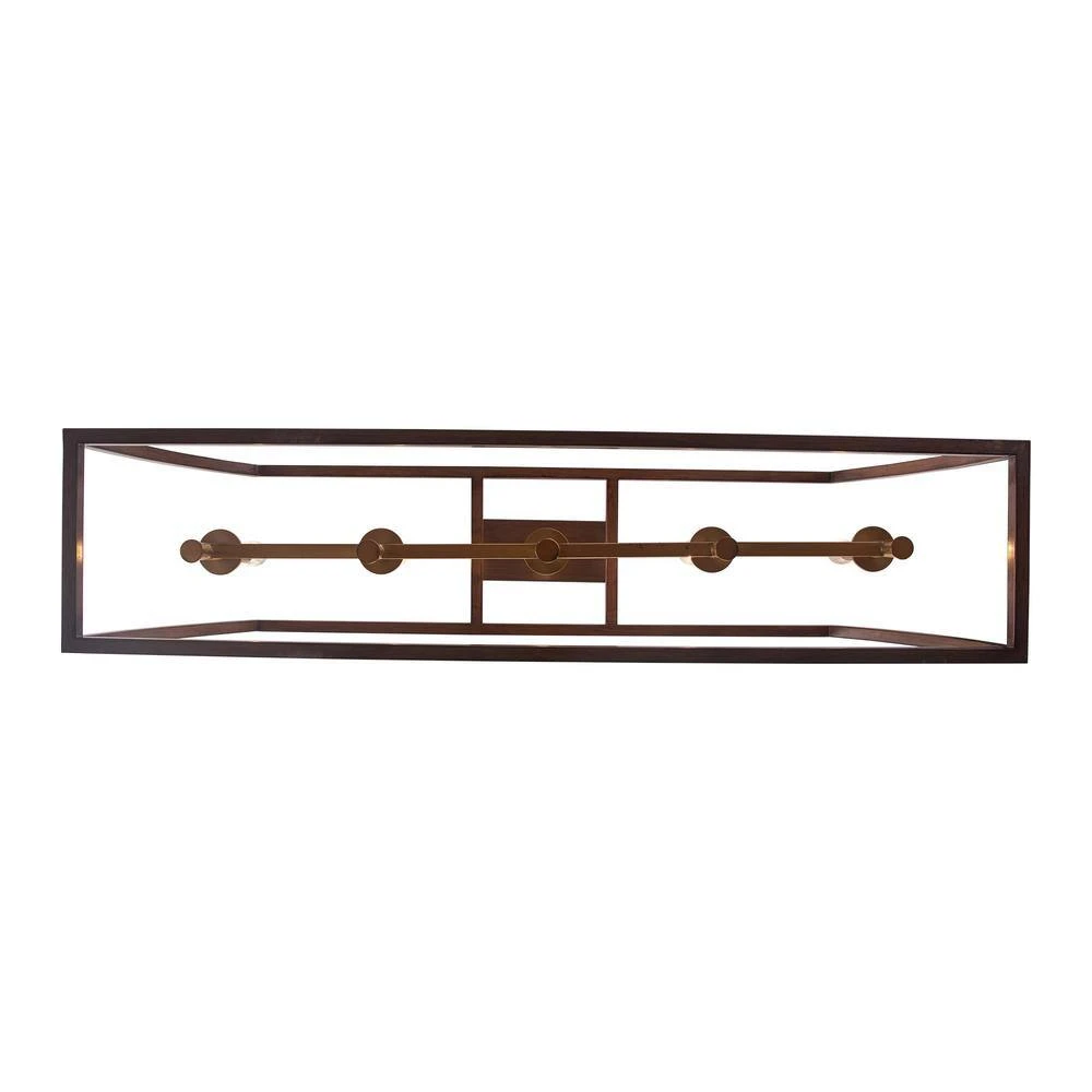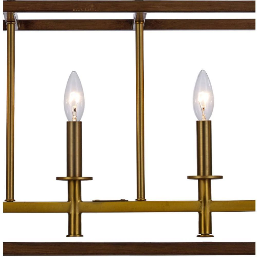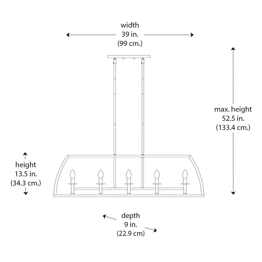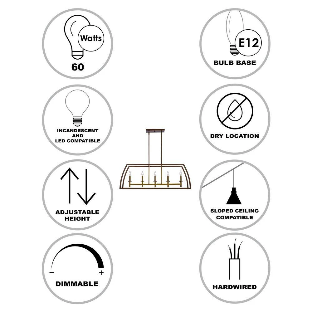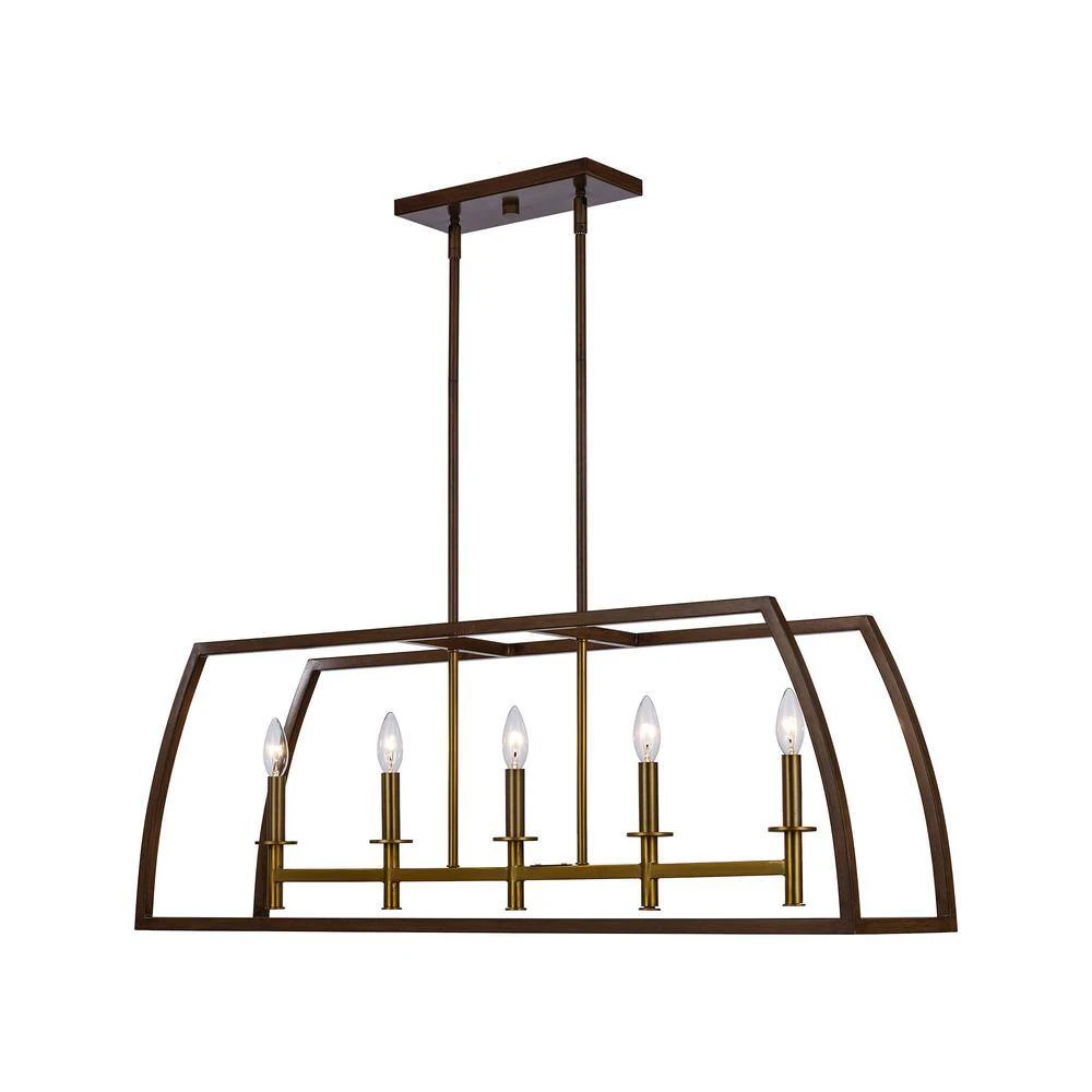 The Carmen Too Collection features industrial farmhouse indoor lighting with curved, clean lines. The Carmen Too island chandelier is offered in a beautiful antique gold finish with a brushed brown metal shade. The two-toned style capitalizes on the rustic, farmhouse trend while the open metal cage supports industrial design themes. The 5 candelabra light bulbs are fully visible inside the shade, ensuring maximum illumination in any indoor space. This linear chandelier is ideal for use over kitchen islands, as well as in dining rooms spaces over formal dining tables. The open cage-style is suspended by two sets of metal downrods that are adjustable for a customized hanging height.