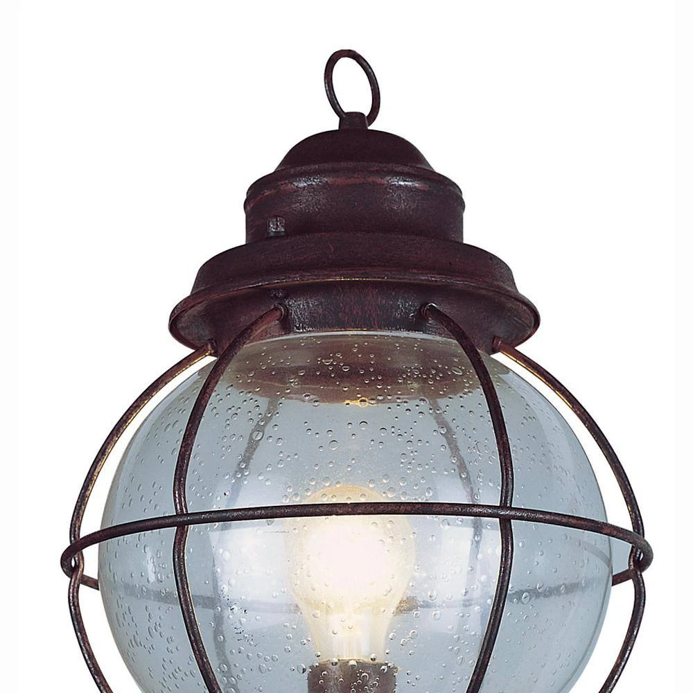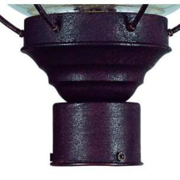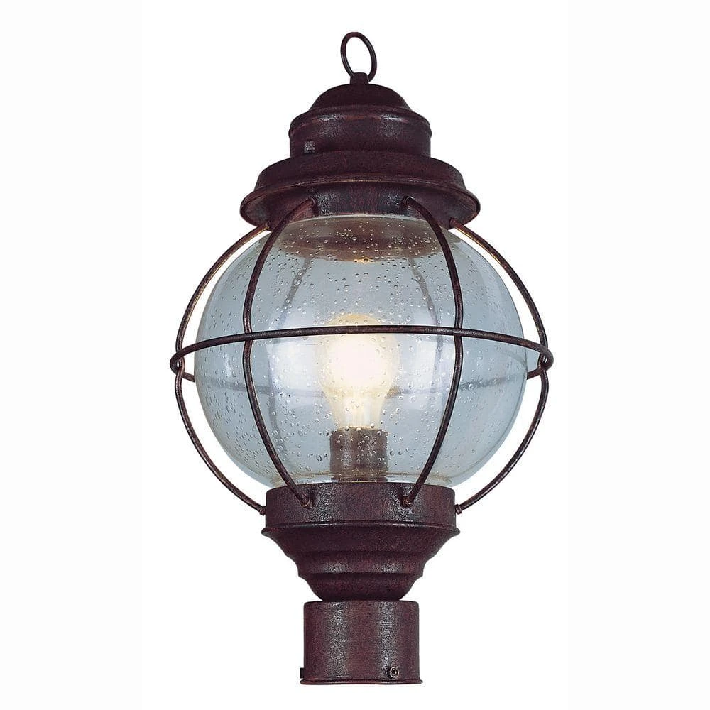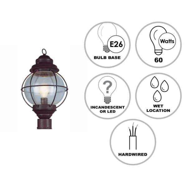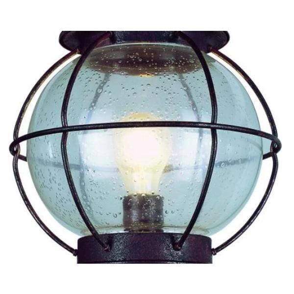 The Catalina Collection exhibits exterior lighting reminiscent of midcentury nautical design. Each piece in the Catalina family is fully enclosed and features a seeded glass globe shade encased in a wire metal frame. The translucent glass ensures the maximum amount of light is output by the single bulb inside, while the seeded texture adds style and an interesting design. The Catalina 9 inch round post mounted lantern is the smallest post light in the collection, and is designed to bring ample illumination to walkways and landscape areas. The piece is finished in a rustic oiled bronze to coordinate with a variety of home decor styles. The lantern fits standard 3 to 3.5 inch light poles and pier mount adapters, and includes a decorative ring hook finial on the top of the frame to coordinate with other pieces in the Catalina Collection.