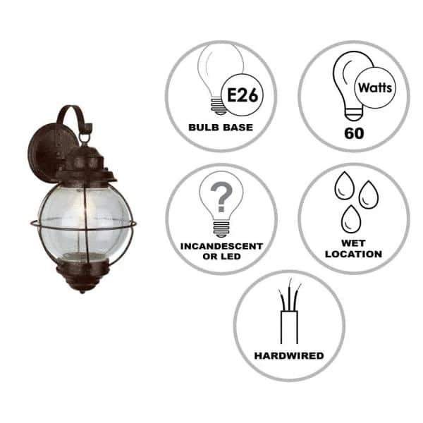 The Catalina Collection exhibits exterior lighting reminiscent of midcentury nautical design. Each piece in the Catalina family is fully enclosed and features a seeded glass globe shade encased in a wire metal frame. The translucent glass ensures the maximum amount of light is output by the single bulb inside while the seeded texture adds style and an interesting design. The Catalina 15 inch tall outdoor wall light is the medium-sized sconce in the collection and includes a matching round backplate and decorative scroll arm with ring hook detail. The lantern is securely fastened to the wall plate, ensuring the fixture will hold up in harsh weather conditions. The piece is finished in a rustic bronze, designed to coordinate well with a variety of home decor styles. Mount this wall light in porch entryways, back patio spaces, or on either side of a garage door to illuminate driveway spaces.