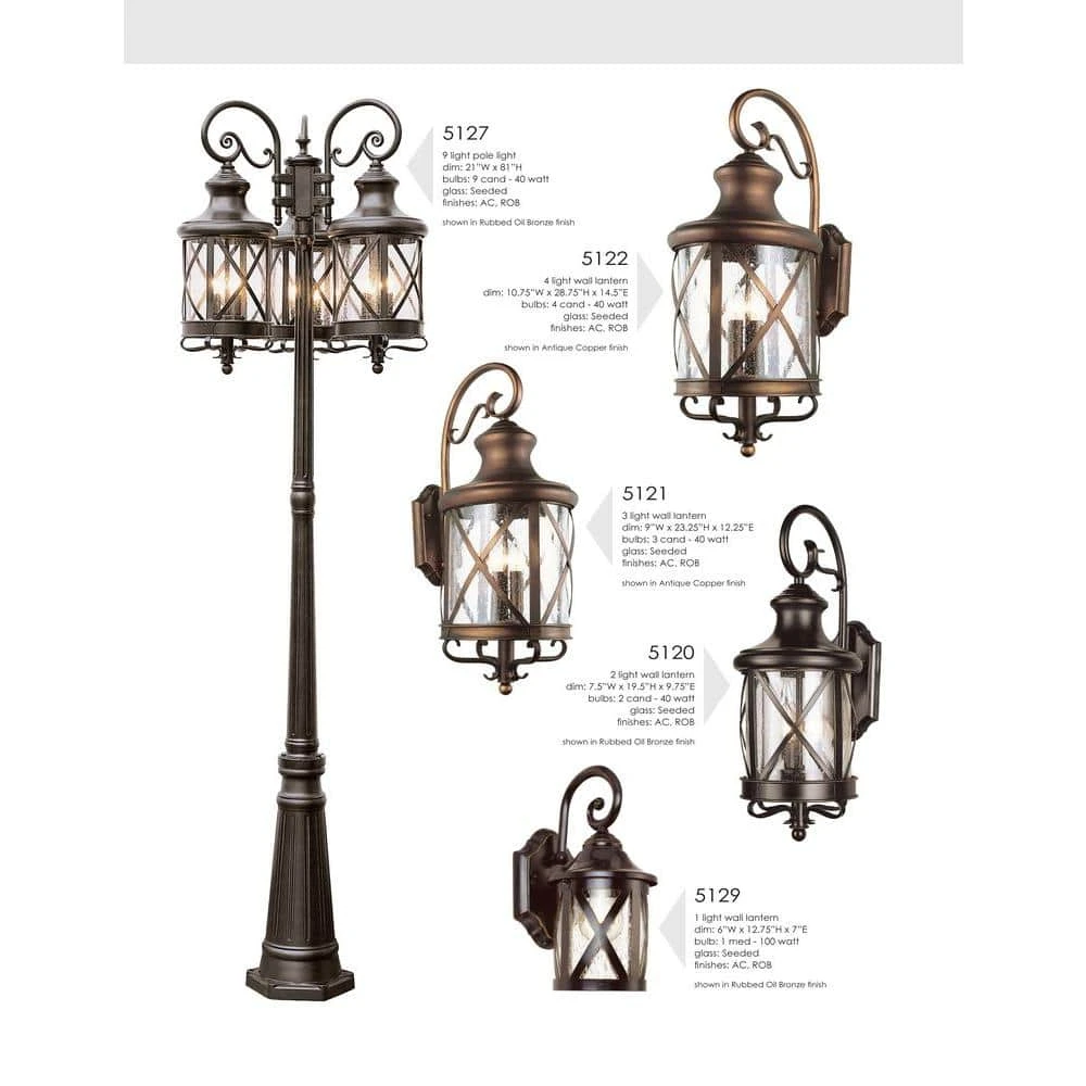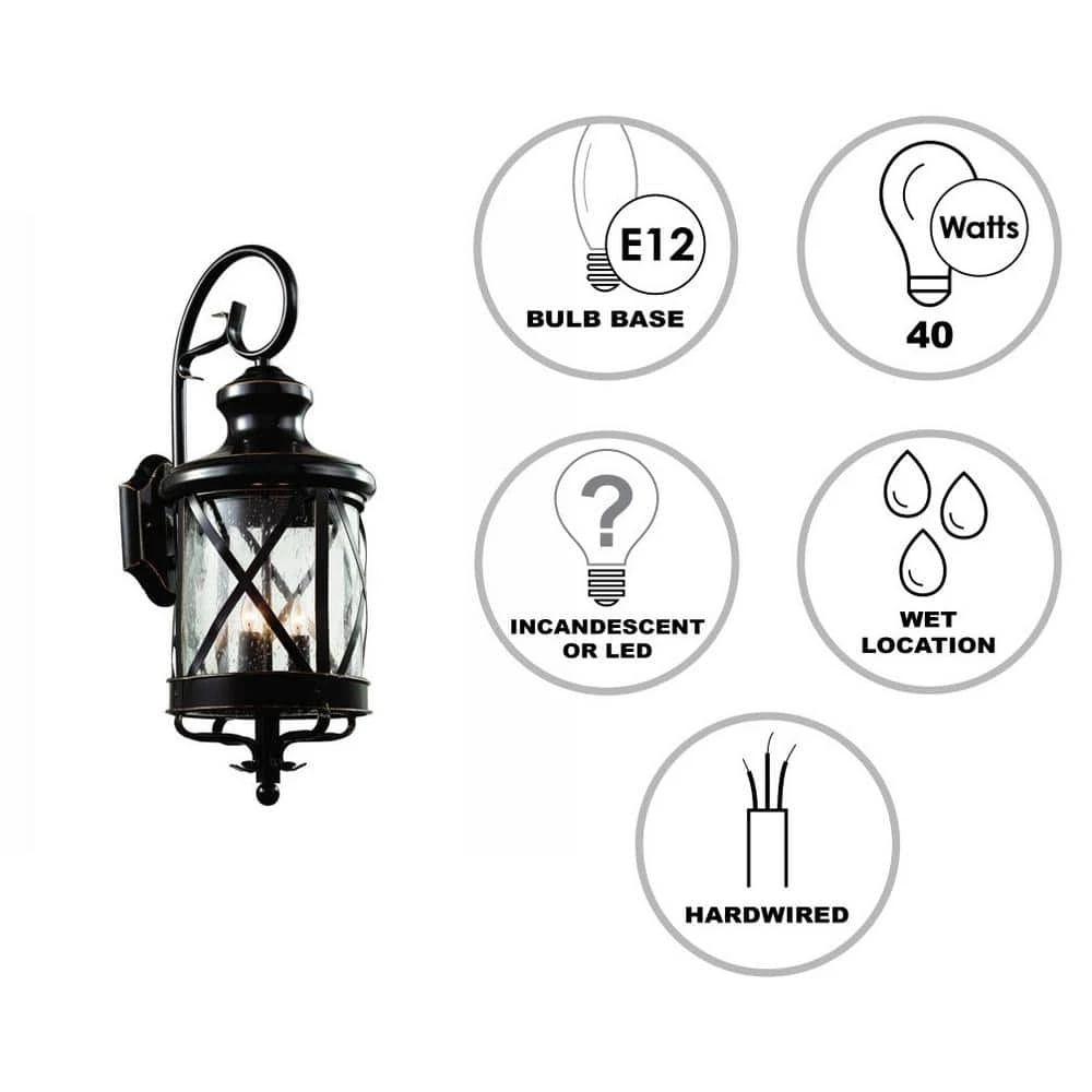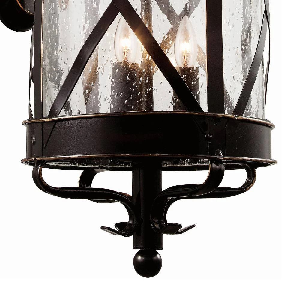 The Chandler Collection features rustic style outdoor lighting with dark, oil rubbed bronze finishes and cylindrical seeded glass shades. Each piece in the Chandler Collection features a unique criss-cross metal detail along the shade, preventing the glass from breakage and allowing the fixtures to hold up in harsh weather conditions. The Chandler 28.75 inch tall outdoor wall light is the largest in the collection and appeals to a variety of home styles, providing both area and accent lighting to porches, walkways, and exterior entryways. Four up-light candelabra bulbs are housed in the fixture and emit ample illumination, allowing for directional lighting through the open bottom below. The wall lantern hangs from a decorative scroll arm, and is firmly attached to the matching shaped wall plate. The complete Chandler Collection includes wall lighting, ceiling lights, and post mount lanterns.