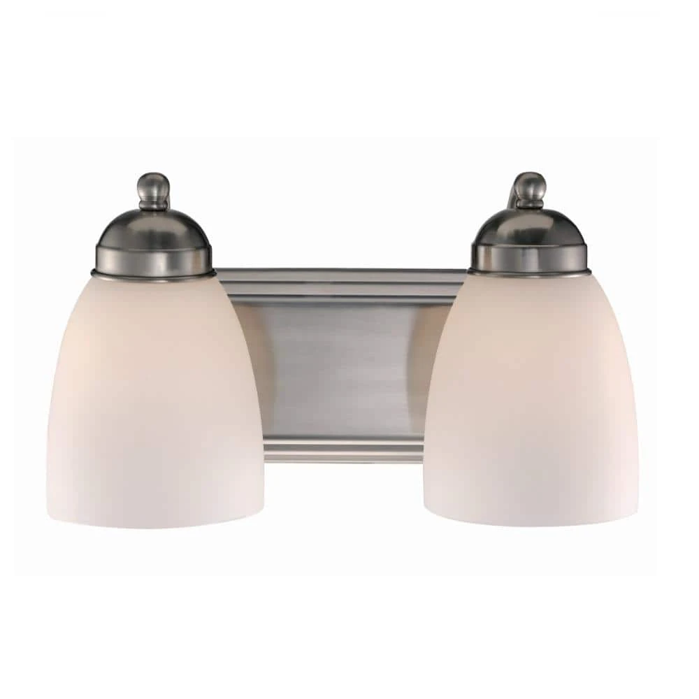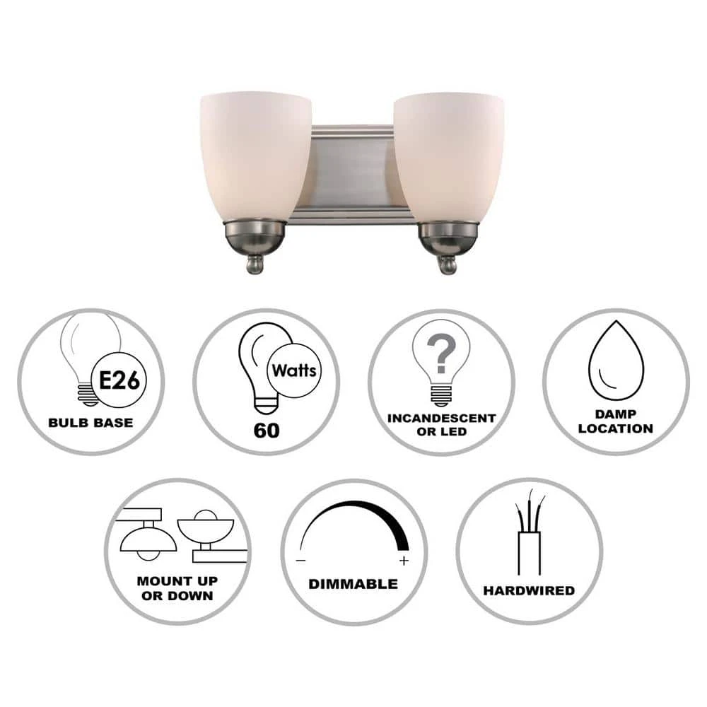 The Clayton Collection is a decorative way to bring light into your bathroom or powder room. The Clayton 14 inch wide vanity fixture offers both accent lighting and task lighting as it stands out and showcases your home’s interior. This two light fixture has white frosted glass shades that are open at the bottom to allow easy access to the 60-watt bulbs inside. The classic brushed nickel finish is easy to coordinate with existing hardware and nickel finishes. The Clayton wall light mounts to a matching oval shaped wall plate and is easy to install with the shades in the up or down position for directional light.