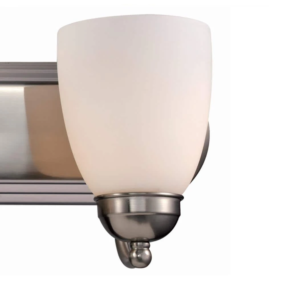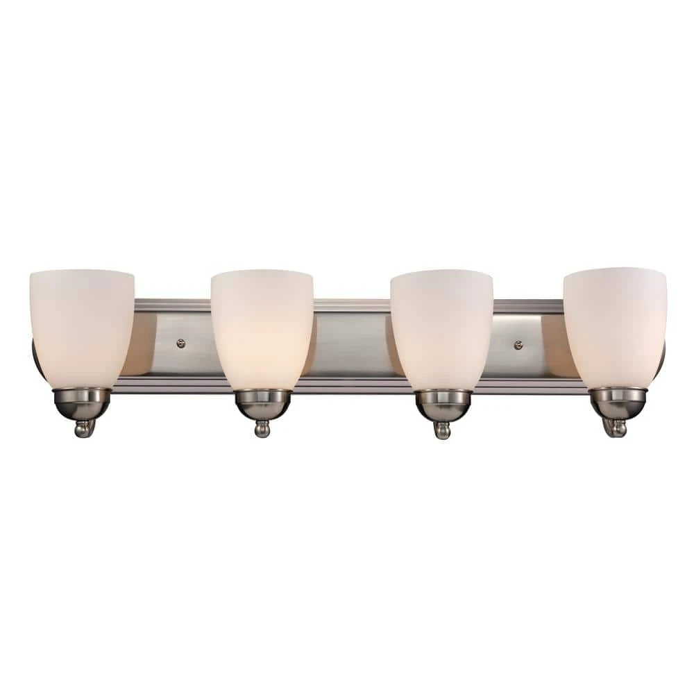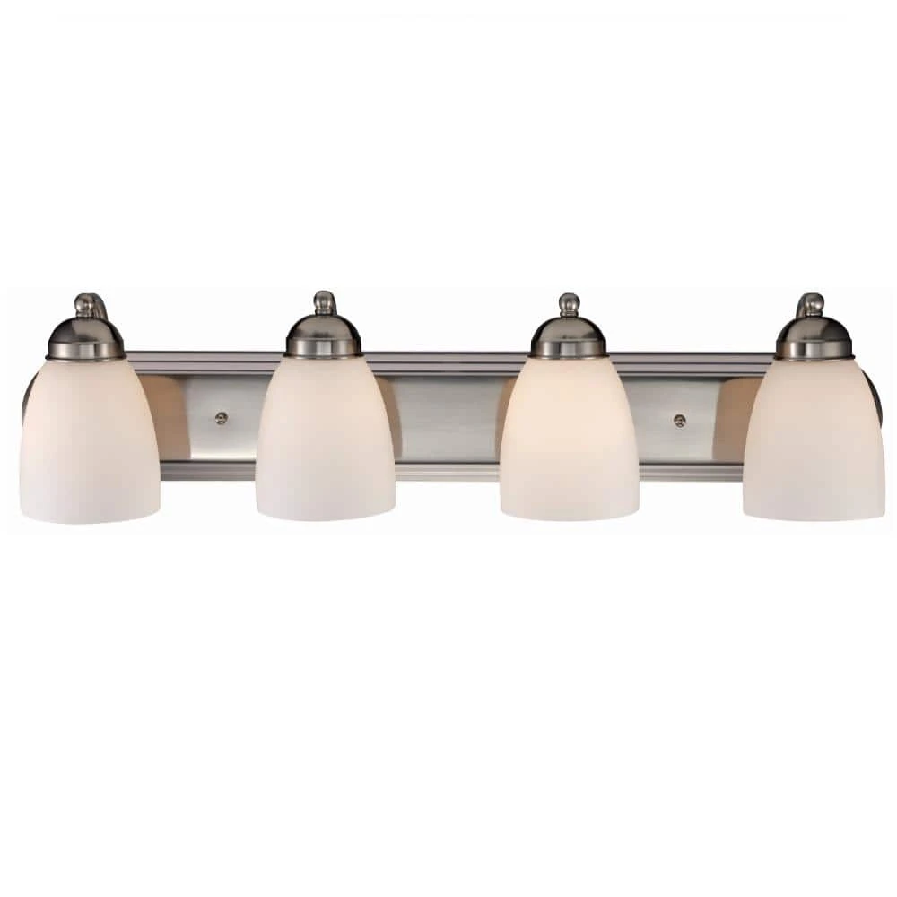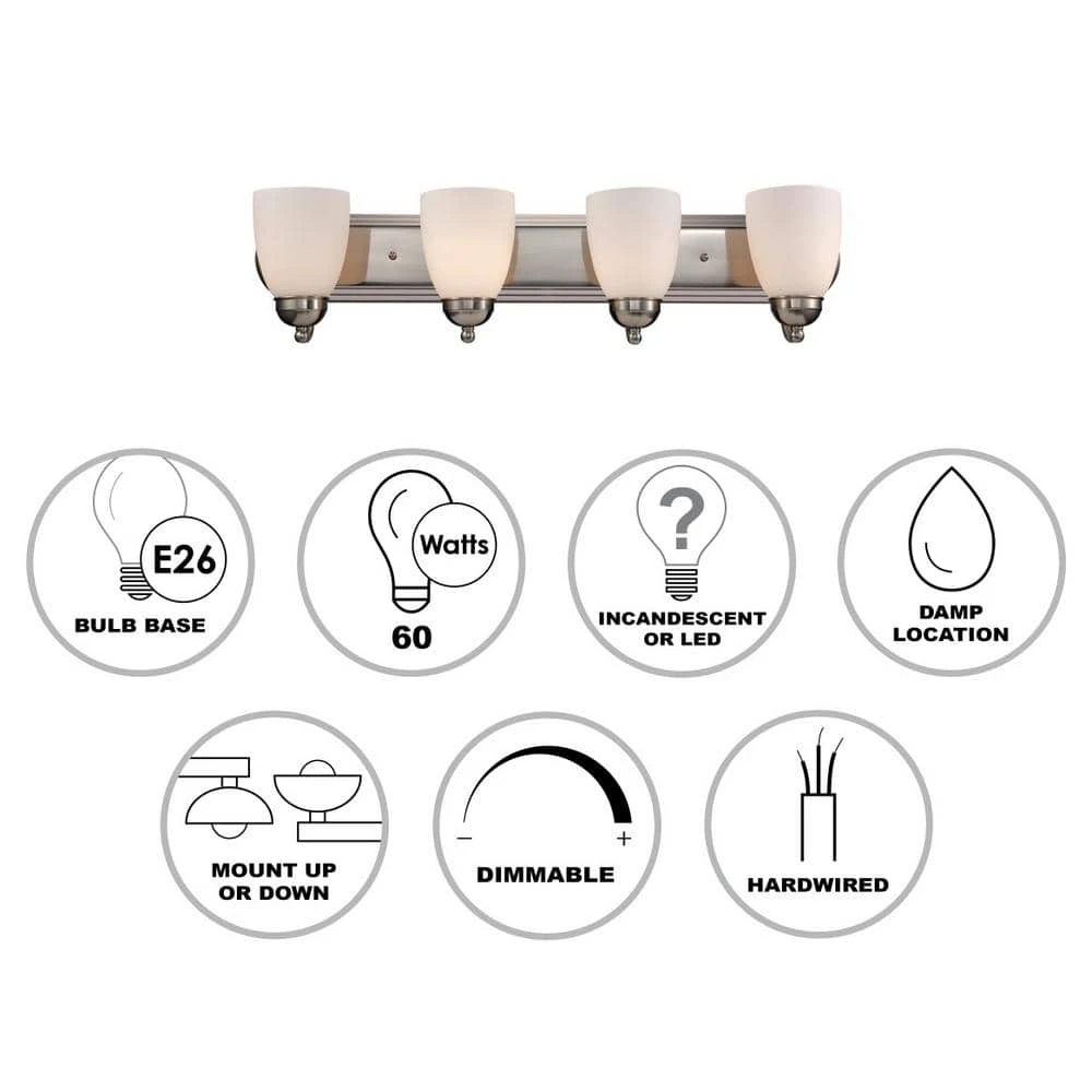 The Clayton Collection is a decorative way to bring light into your bathroom or powder room. The Clayton 30 inch wide vanity fixture offers both accent lighting and task lighting as it stands out and showcases your home’s interior. This four light fixture has white frosted glass shades that are open at the bottom to allow easy access to the 60-watt bulbs inside. The classic brushed nickel finish is easy to coordinate with existing hardware and nickel finishes. The Clayton wall light mounts to a matching oval shaped wall plate and is easy to install with the shades in the up or down position for directional light.
