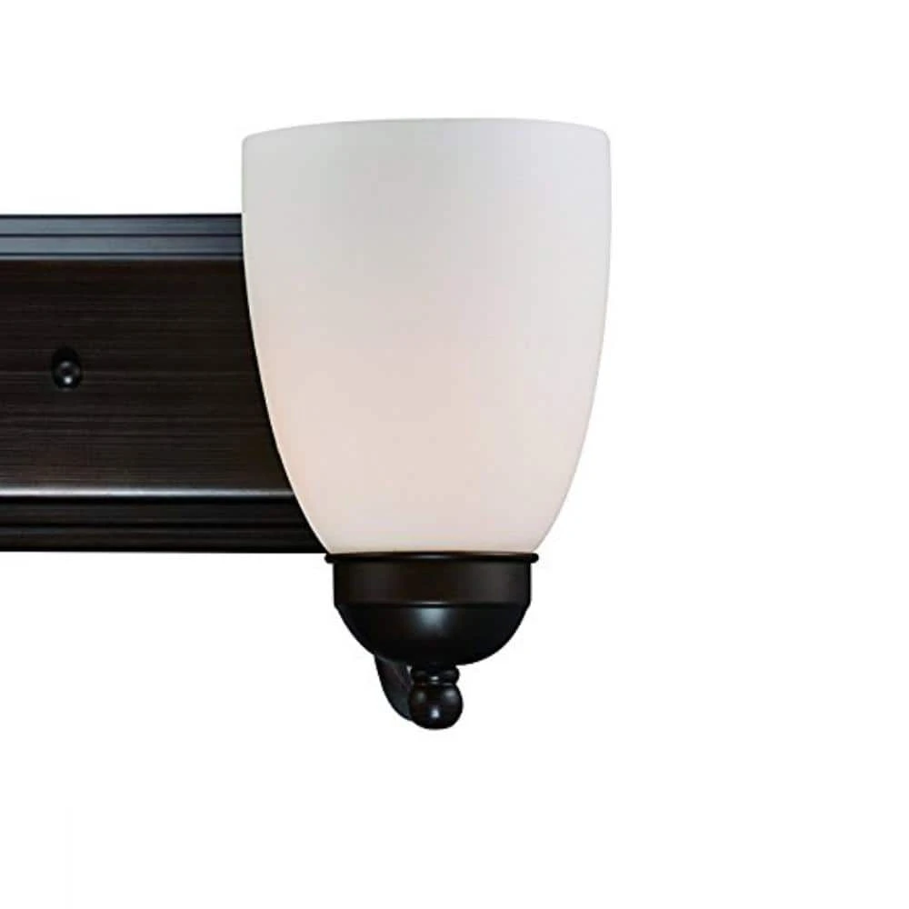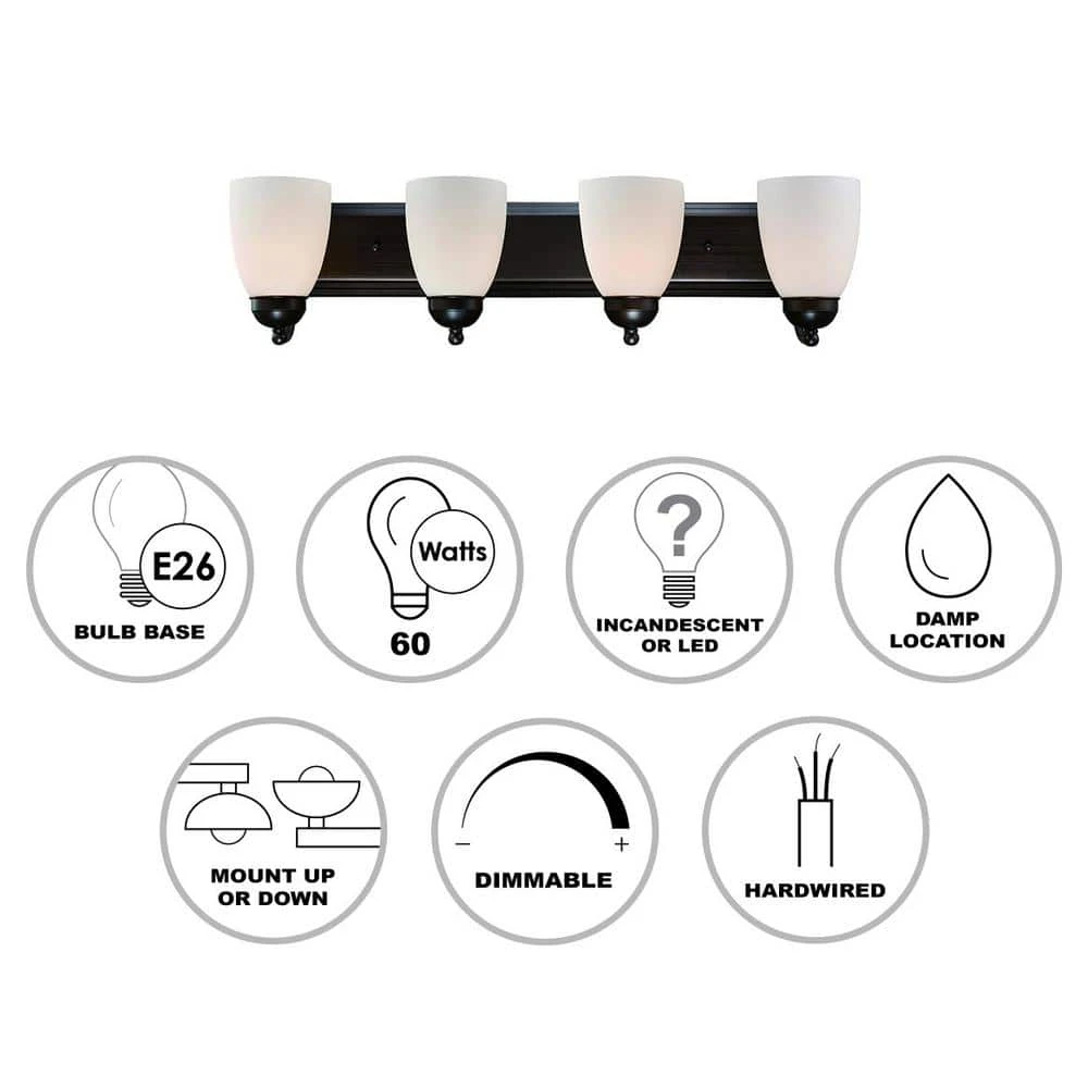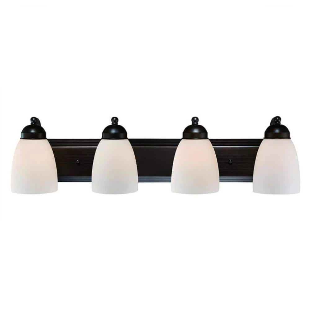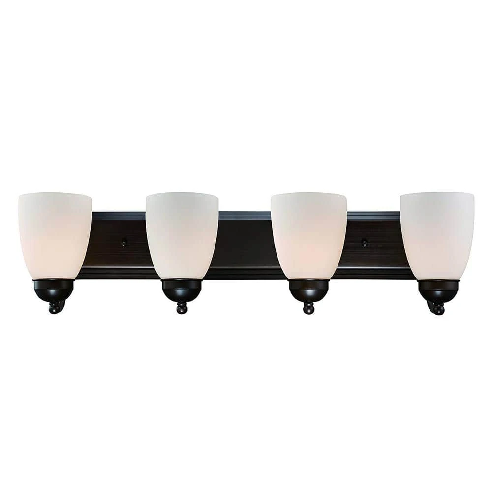 The Clayton Collection is a decorative way to bring light into your bathroom or powder room. The Clayton 30 inch wide vanity fixture offers both accent lighting and task lighting as it stands out and showcases your home’s interior. This four light fixture has white frosted glass shades that are open at the bottom to allow easy access to the 60-watt bulbs inside. The warm rubbed oil bronze finish is easy to coordinate with existing hardware and bronze finishes. The Clayton wall light mounts to a matching oval shaped wall plate and is easy to install with the shades in the up or down position for directional light.