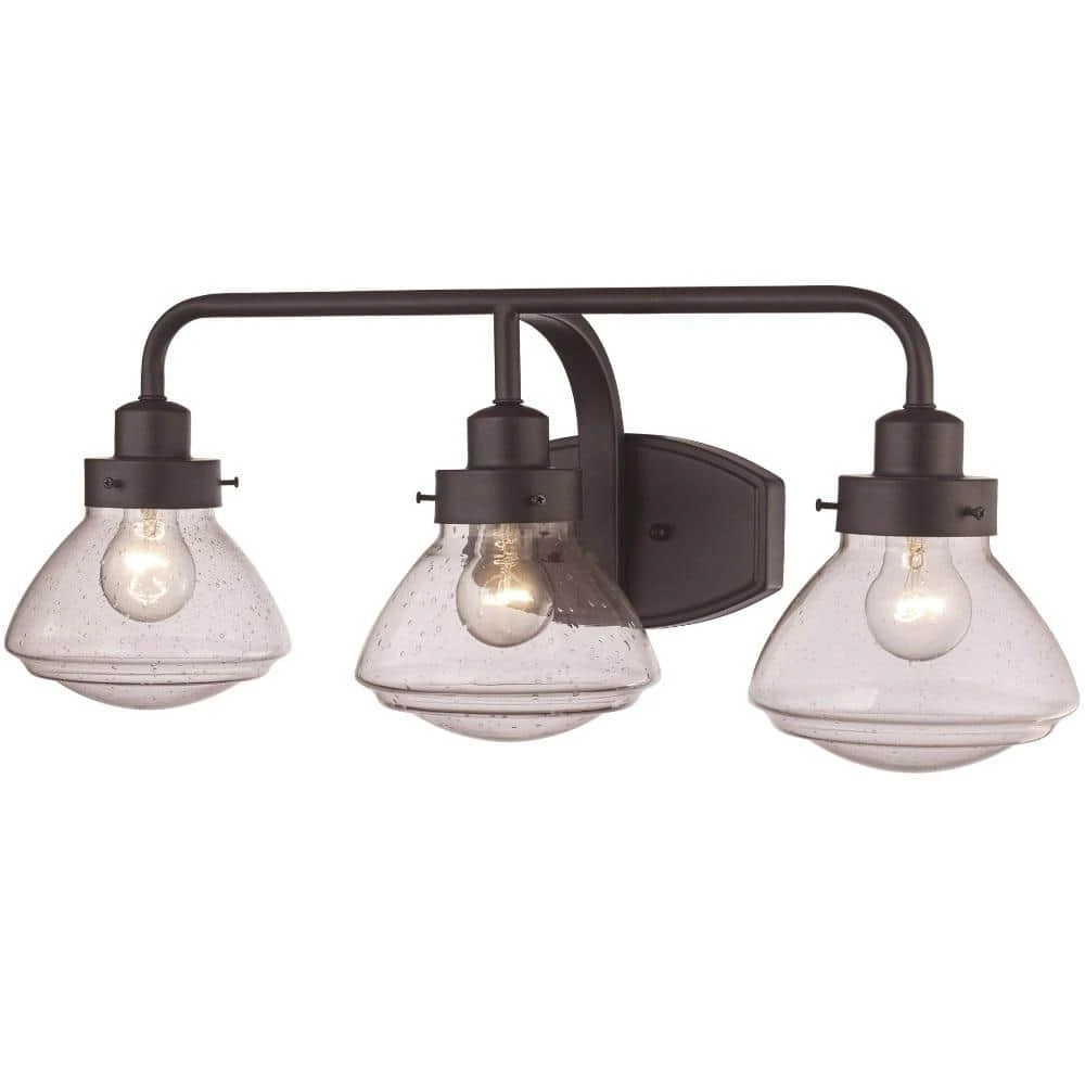 This vanity collection from Bel Air exhibits transitional bathroom lighting designed to suit a variety of home decor styles from industrial to modern. The 26.5-inch vanity fixture is a decorative wall light that works well in bathrooms and powder rooms. Use as a single unit in smaller to medium sized spaces or use as a set over a double sink or vanity mirror in larger areas. The fixture is constructed of rubbed oil bronze-finished metal and includes an elongated linear wall plate with a central curved arm that holds the glass shades in place. The clear glass shades have a fully enclosed design, house a single light bulb each, and feature a decorative seeded texture to add a unique appearance to the piece. The transparent glass allows for ample illumination from the bulbs, providing both task and area lighting. Shop the collection for additional finishes and light count options.