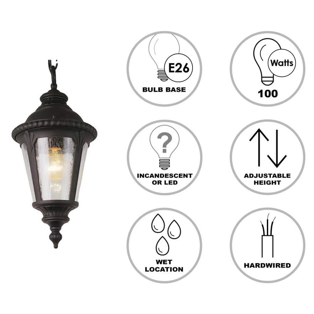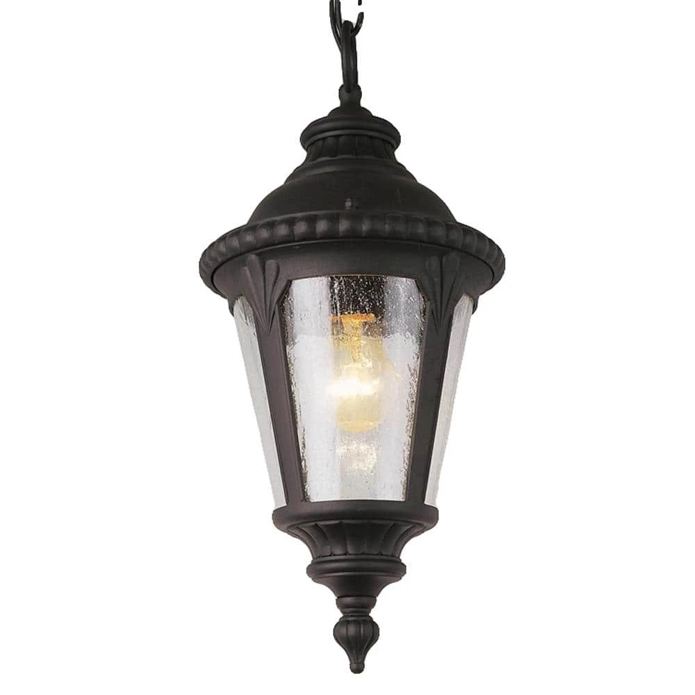 The Commons Collection features classic American style outdoor lighting with braided trim edges and feather-leaf accent details that give each fixture in the family a craftsman appeal. The Commons 8 inch round outdoor pendant is finished in black with seeded glass panes on all four sides. The clear glass ensures maximum light output from the 100-watt bulb inside, while the seeded texture adds style and interest to the piece and casts soft reflections in exterior spaces. The lantern hangs from a matching black chain, which offers an adjustable height and sloped ceiling compatibility. This medium sized pendant is ideal for lighting up porches and exterior entryways.