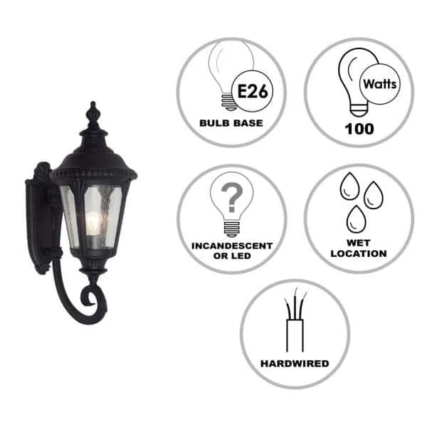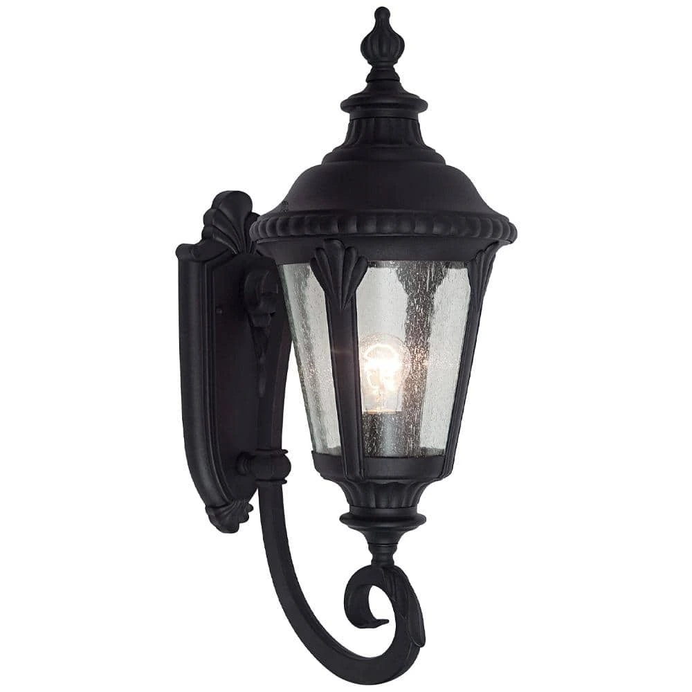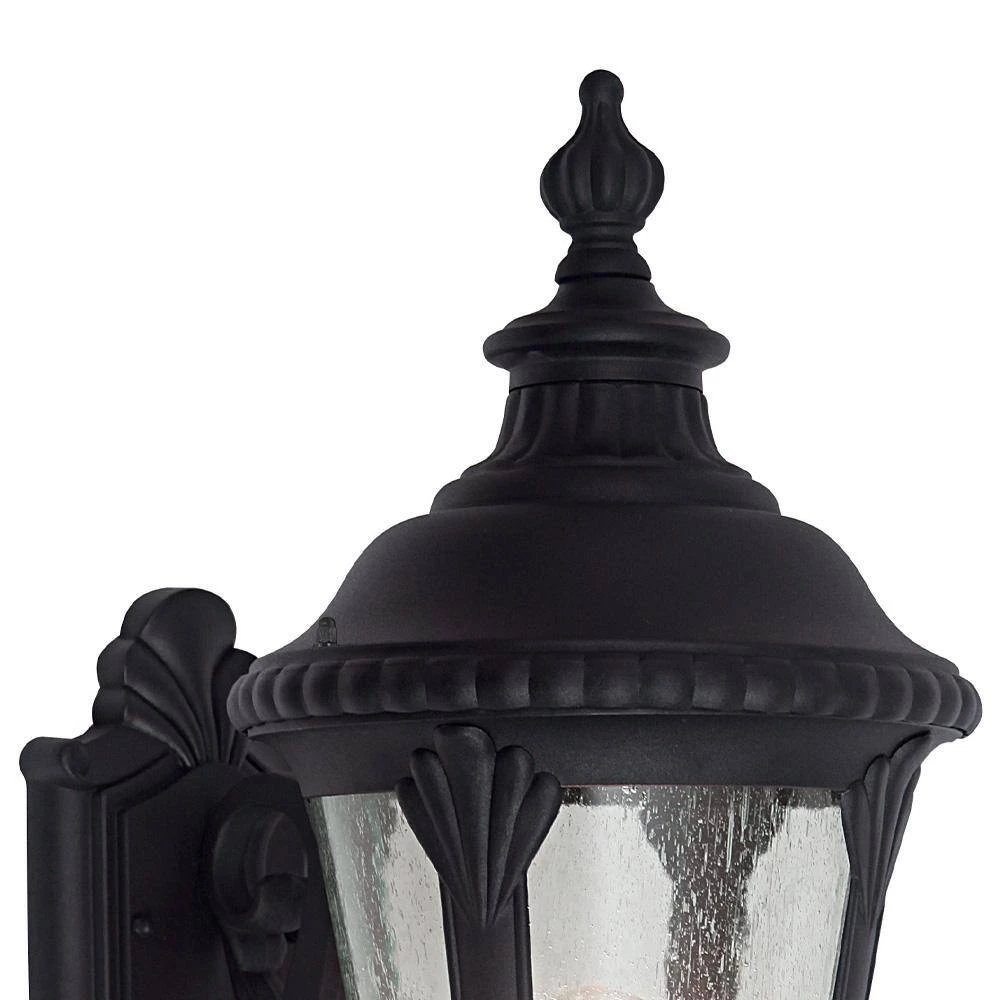 The Commons Collection features classic American style outdoor lighting with braided trim edges and feather-leaf accent details that give each fixture in the family a craftsman appeal. The Commons 19 inch tall outdoor wall light is finished in black with seeded glass panes on all four sides. The clear glass ensures maximum light output from the 100-watt bulb inside, while the seeded texture adds style and interest to the piece and casts soft reflections in exterior spaces. This coach light features a decorative scroll arm holding the lantern up, and a carved final on top that coordinates with the rest of the collection. This light affixes firmly to any wall of your home with a matching backplate. This 19 inch sconce is the smallest coach light in the collection, and lends itself well to illuminating porches, backyard areas, and smaller driveways.