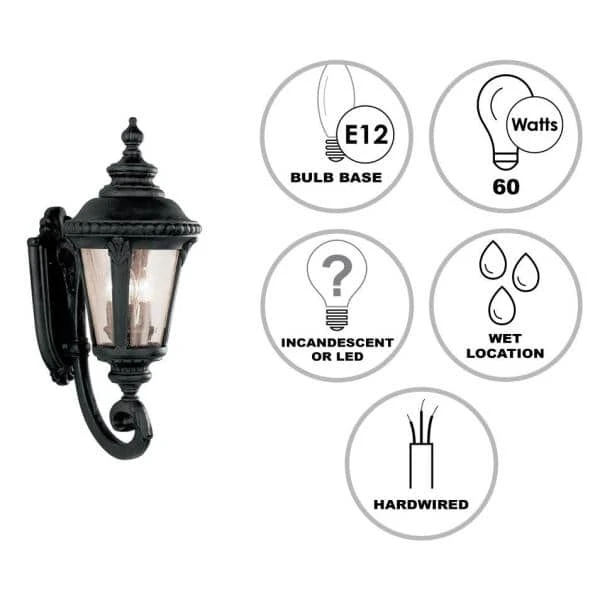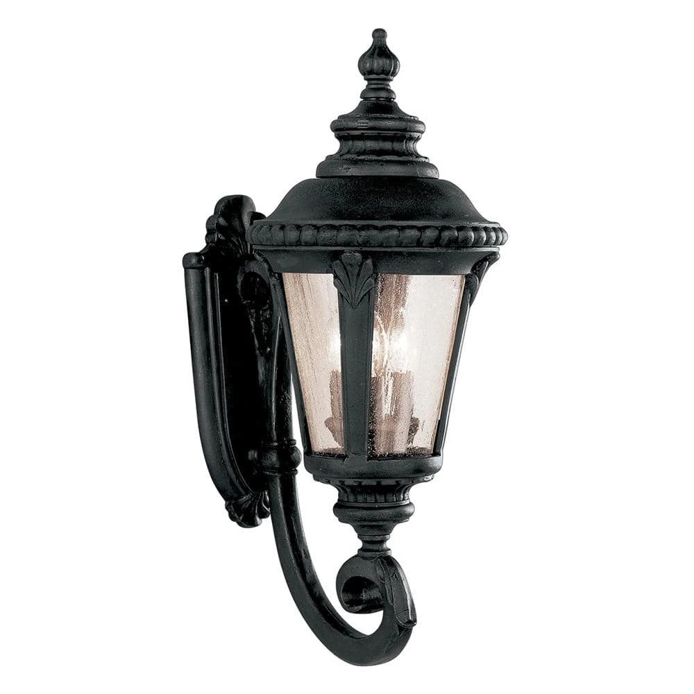The Commons Collection features classic American style outdoor lighting with braided trim edges and feather-leaf accent details that give each fixture in the family a craftsman appeal. The Commons 25 inch tall outdoor wall light is finished in black with seeded glass panes on all four sides. The clear glass ensures maximum light output from the three candelabra bulbs inside, while the seeded texture adds style and interest to the piece and casts soft reflections in exterior spaces. This coach light features a decorative scroll arm holding the lantern up, and a carved final on top that coordinates with the rest of the collection. This sconce lends itself well to illuminating porches, backyard deck areas, and driveways. The fixture affixes firmly to any wall of your home with a matching shaped backplate.