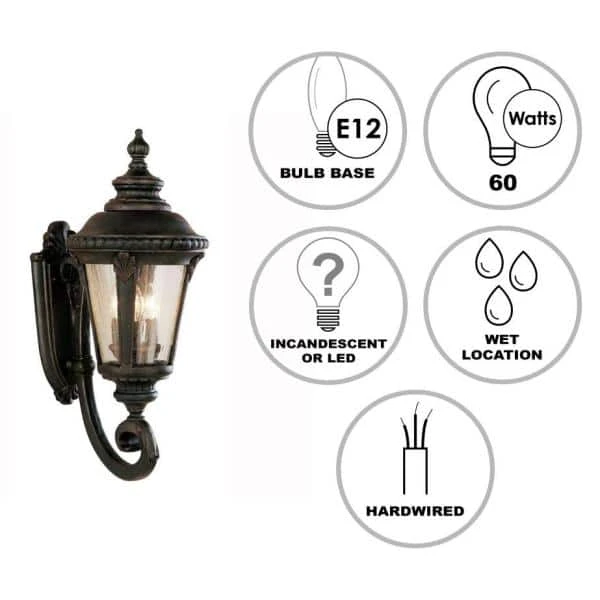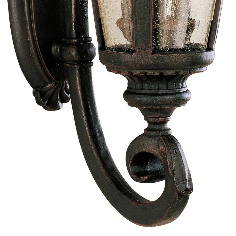 The Commons Collection features classic American style outdoor lighting with braided trim edges and feather-leaf accent details that give each fixture in the family a craftsman appeal. The Commons 25 inch tall outdoor wall light is finished in rust-brown with seeded glass panes on all four sides. The clear glass ensures maximum light output from the three candelabra bulbs inside, while the seeded texture adds style and interest to the piece and casts soft reflections in exterior spaces. This coach light features a decorative scroll arm holding the lantern up, and a carved final on top that coordinates with the rest of the collection. This sconce lends itself well to illuminating porches, walkways, and driveways. The fixture affixes firmly to any wall of your home with a matching shaped backplate.