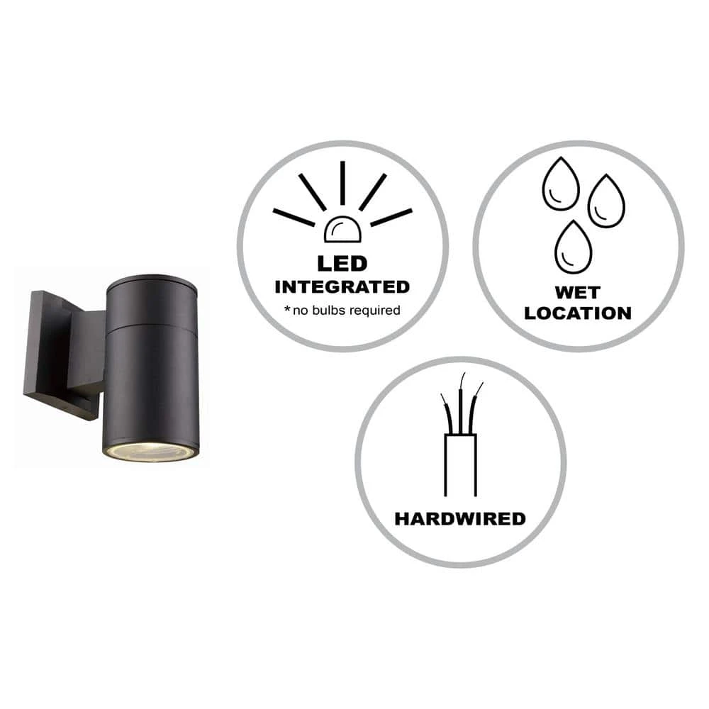 The Compact Collection from Bel Air exhibits outdoor cylinder lights that stress modern minimalism and durability. The collection, named so for its compact design, offers ample illumination in a small package. The 6.5 inch tall wall sconce is a cylindrical fixture finished in black that is connected to the wall with a matching square backplate. The body of the sconce houses a low maintenance integrated LED module that emits 600 lumens of light. With integrated LED technology, you will never need to replace light bulbs for the life of the fixture. A clear glass lens on the bottom of the sconce allows the light to shine directionally upwards or downwards depending on your home’s lighting needs. The compact style is ideal for smaller spaces where larger wall lanterns are not an option. Mount along outdoor walkways, in porch areas, or on either side of a garage door to illuminate a driveway.