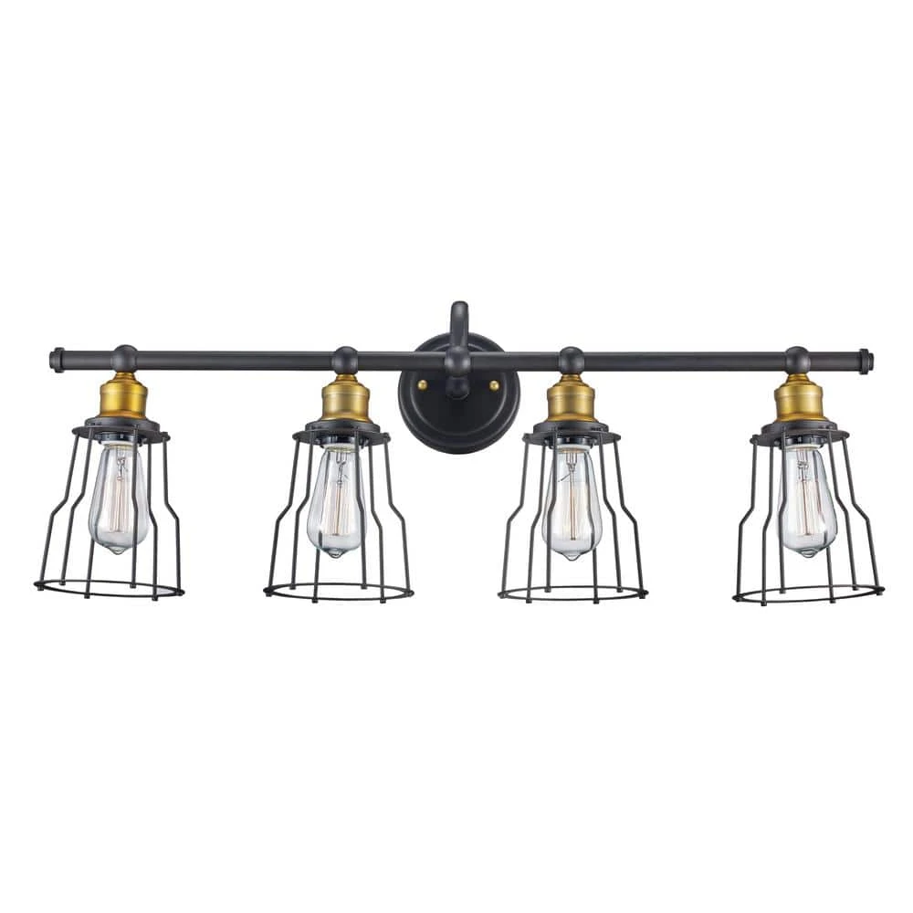 The Constitution 31 inch wide vanity light from Bel Air Lighting exhibits a rustic, industrial style highlighted by the all-metal design and bronze finish. The fixture is a decorative and functional way to bring light into your bathroom and powder room spaces, and blends well with farmhouse and modern decor styles. A straight metal arm extends out from the round wall plate, holding four metal bell-shaped shades in place. Each shade holds a single 60-watt bulb, and vintage Edison filament bulbs are recommended to capitalize on the industrial tone. The rubbed oil bronze finish is contrasted with antique gold socket details for added style and interest. This fixture can be mounted with the shades facing up or down for a customized look.
