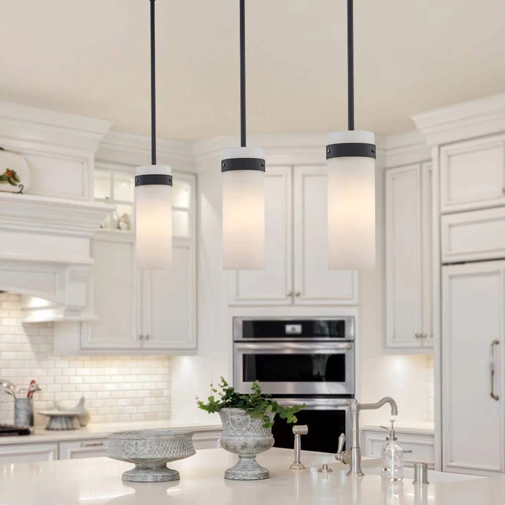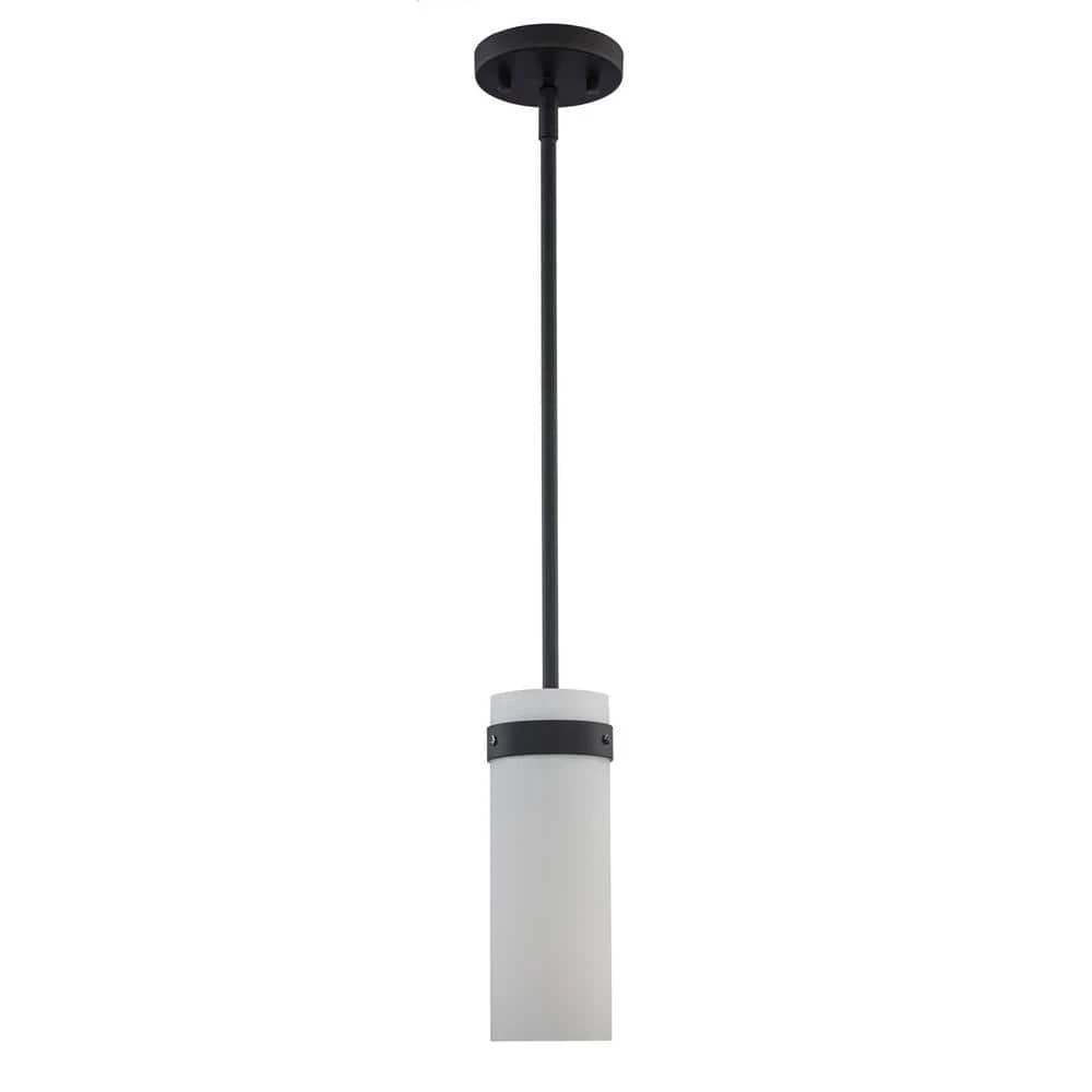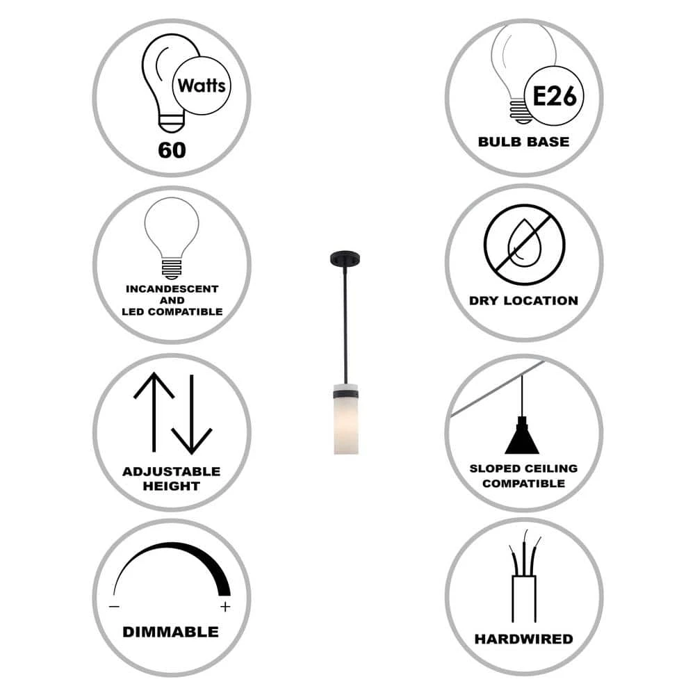 The Crosby contemporary pendant collection from Bel Air combines style with functionality for a set of interior lights that are truly unique and suitable for a wide range of home decor styles. The Crosby mini pendant works well hung as a single unit or when installed as a set along a linear kitchen island or bar table. It includes a frosted glass cylindrical shade with an open bottom, allowing for easy bulb access and for directional illumination in the space below. A decorative black band of metal at the top of the glass matches the black finish on the included extension rods and round ceiling plate. The contemporary tone is highlighted by clean and simple lines present throughout the piece, making this collection easy to coordinate with traditional, modern and transitional decor styles.