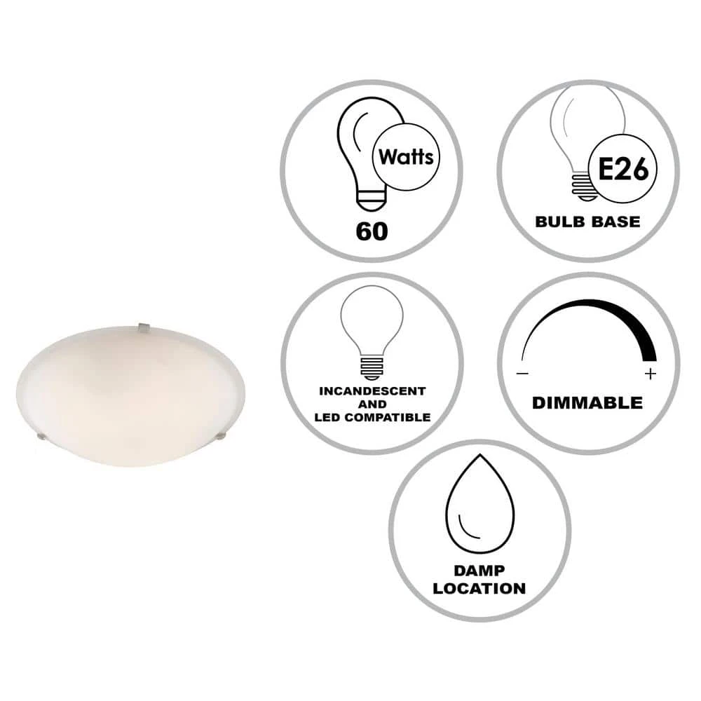 The Cullen Collection from Bel Air exhibits low profile ceiling lights, designed to fit in any room of the home. The hallmark of the Cullen collection is minimalism, highlighted by the simple frosted glass dish-style shades and metal support clips to hold the glass in place. The 15 inch round flush mount is the medium sized piece in the collection, extending just five inches from the ceiling and offering ample illumination from the three-light design. The bulbs are hidden inside the wide shade, and are easily accessible by pulling back the three spring-loaded metal support clips and removing the glass. The brushed nickel finish on the clips will coordinate easily with existing decor styles and other fixtures throughout the home. The Cullen family is suitable for use in damp areas, and can be mounted in bathrooms, living rooms, kitchens, or anywhere additional light is needed.