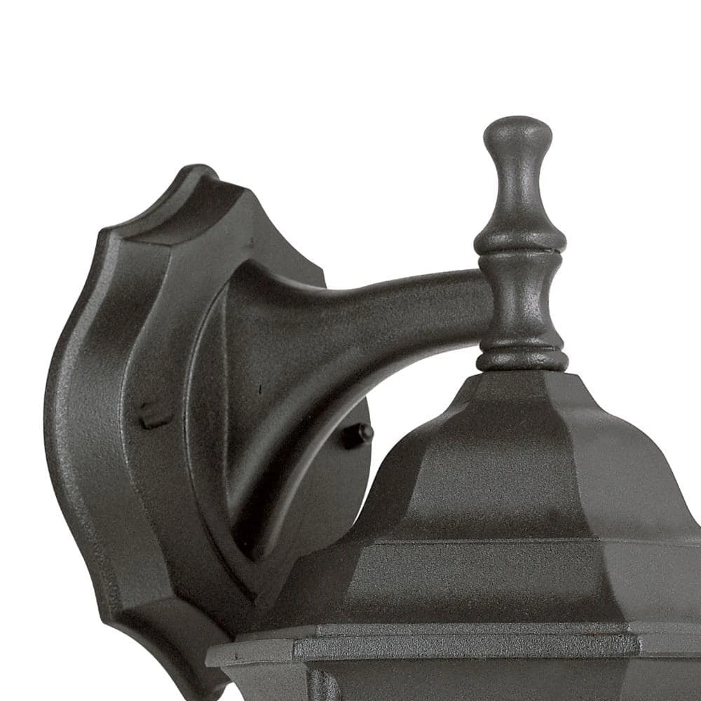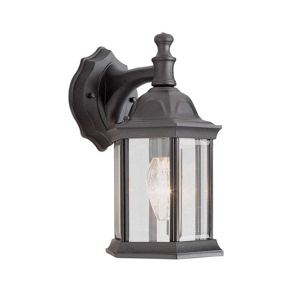The Cumberland Collection exhibits craftsman style outdoor wall lighting with hexagon shaped frames, clear beveled glass sides, and matching decorative wall plates. The Cumberland 12.5 inch tall wall sconce is featured in a classic black finish and houses a single down-light bulb. The bottom of the fixture is open to allow easy access to change the bulb, and to provide directional lighting. The lantern frame is held firmly in place by a curved, reaching arm that mounts to the backplate. This wall lantern is a beautiful area light piece for porches, back patios, and exterior entryways.