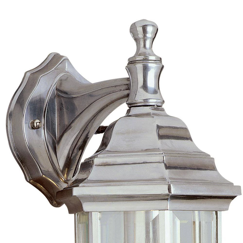 The Cumberland Collection exhibits craftsman style outdoor wall lighting with hexagon shaped frames, clear beveled glass sides, and matching decorative wall plates. The Cumberland 12.5 inch tall wall sconce is featured in a metallic brushed nickel finish and houses a single down-light bulb. The bottom of the fixture is open to allow easy access to change the bulb, and to provide directional lighting. The lantern frame is held firmly in place by a curved, reaching arm that mounts to the backplate. This wall lantern is a beautiful area light piece for porches, back patios, and exterior entryways.