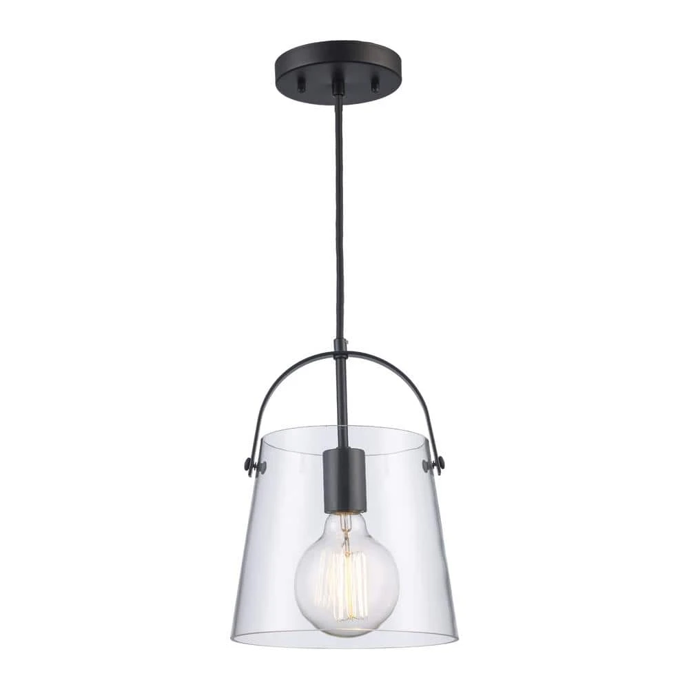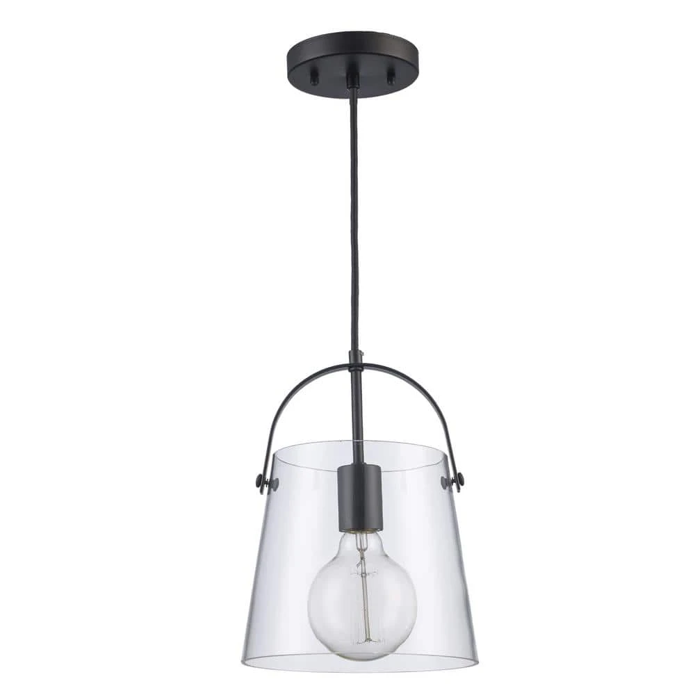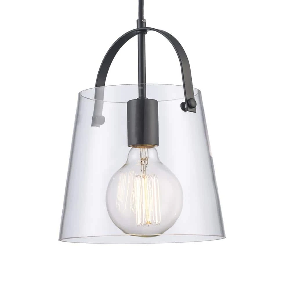The Curry Collection from Bel Air exhibits transitional indoor lighting designed to suit a variety of home decor styles from industrial to modern. The Curry lantern-inspired mini pendant is a decorative hanging light that works well in dining areas, kitchens, and foyer entrances. Use as a single unit over a dining room table, or install as a set over a linear kitchen island or bar table for additional illumination in larger spaces. The fixture is constructed of black-finished metal and includes a circular ceiling plate and a clear glass cone shade that appears to ‘hang’ from a curved ribbon of metal, mimicking the look of a lantern handle. The clear glass is open at the bottom for easy access to change the bulb. The pendant body hangs from a black wire which offers height adjustability and sloped ceiling compatiblity. Shop the Curry Collection for additional finishes and size options.