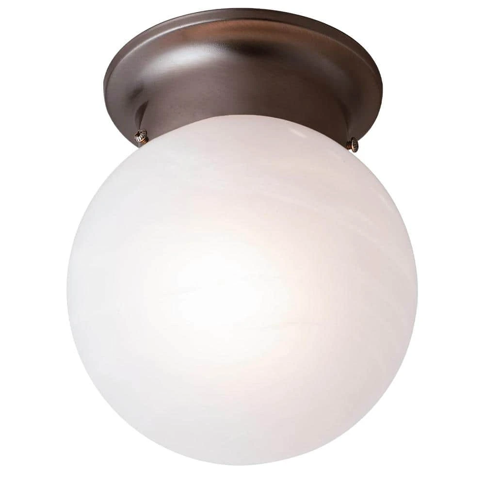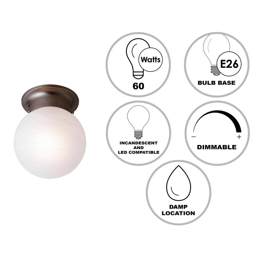 The Dash Collection from Bel Air presents functional interior ceiling fixtures, designed to provide utilitarian task lighting to closet spaces, hallways, and garages. The Dash 6 inch round globe-style flush mount is the smallest in the family. The white marbleized glass shade is reminiscent of midcentury modern styling, and diffuses the light from the single 60-watt bulb inside. The rubbed oil bronze metal frame will coordinate seamlessly with existing hardware and other light fixtures. The Dash collection offers a cost-effective way to upgrade outdated lighting throughout the home.