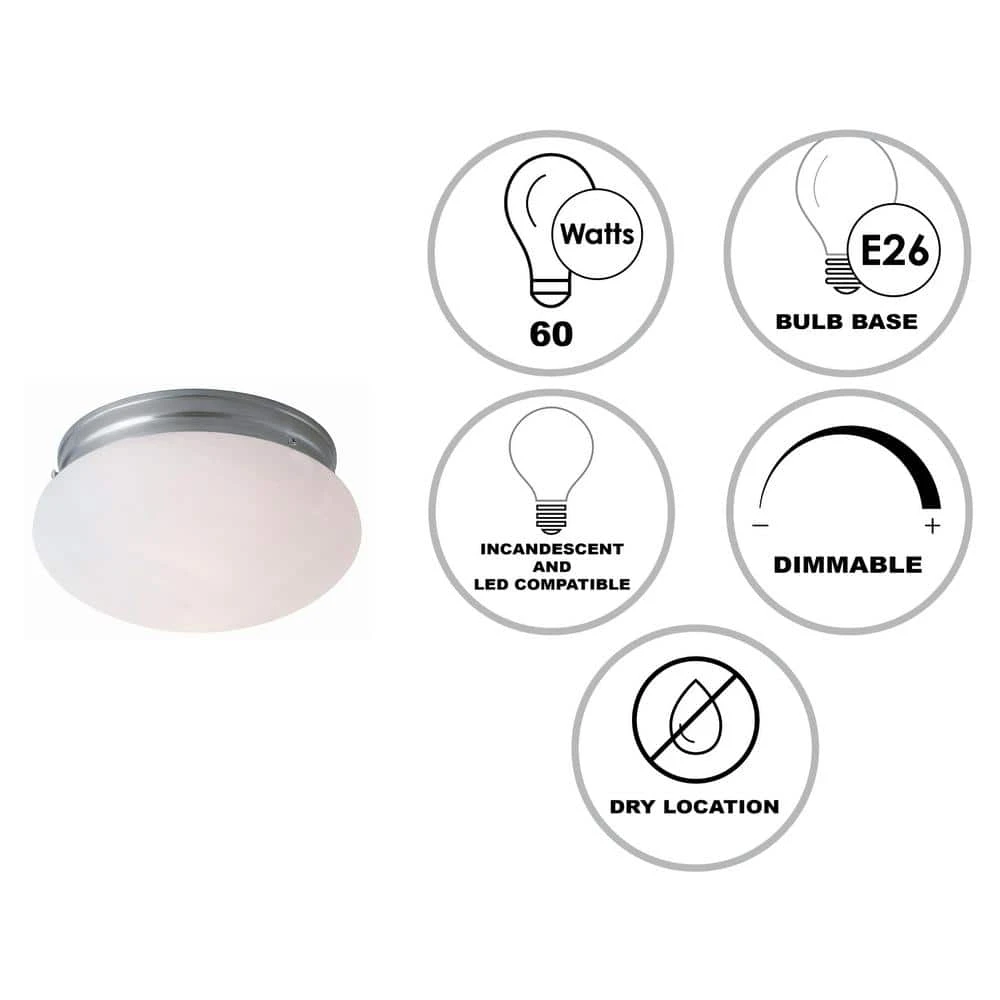The Dash Collection from Bel Air presents functional interior ceiling fixtures, designed to provide utilitarian task lighting to closet spaces, hallways, and garages. The Dash 8 inch round mushroom-style flush mount is one of the smallest in the family. The white marbleized glass shade is reminiscent of midcentury modern styling, and diffuses the light from the single 60-watt bulb inside. The metallic brushed nickel frame will coordinate seamlessly with existing hardware and other light fixtures. The Dash collection offers a cost-effective way to upgrade outdated lighting throughout the home.