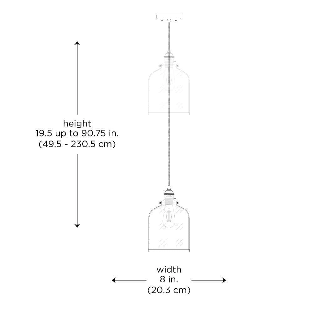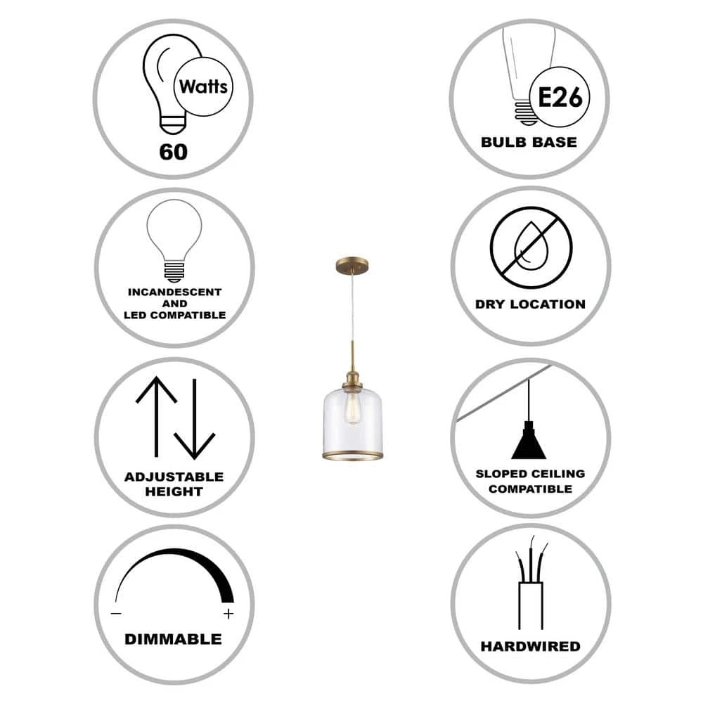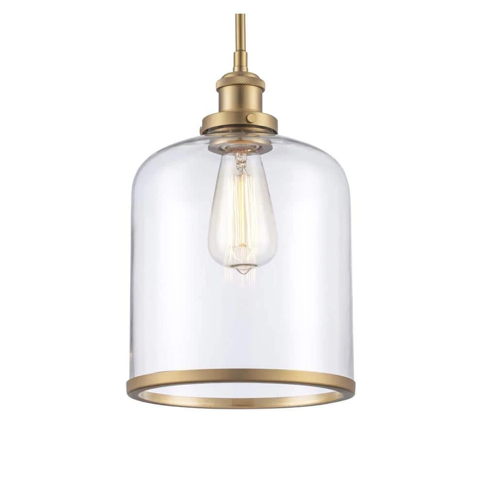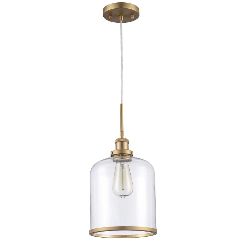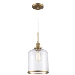 The Dorina Collection from Bel Air exhibits transitional indoor lighting designed to suit a variety of home decor styles from industrial to modern. The Dorina mason jar mini pendant is a decorative hanging light that works well in dining areas, kitchens and foyer entrances. Use as a single unit over a dining room table or install as a set over a linear kitchen island or bar table for additional illumination in larger spaces. The fixture is constructed of antique gold-finished metal and includes a circular ceiling plate and a decorative socket cover to hold the glass shade in place. The clear glass shade features a rounded cylinder shape, houses a single light bulb and is open at the bottom for easy access to change the bulb. A ring of gold metal at the bottom of the glass highlights a midcentury style and matches the antique gold finish throughout the piece. The pendant body hangs from a wire which offers height adjustability and sloped ceiling compatiblity.