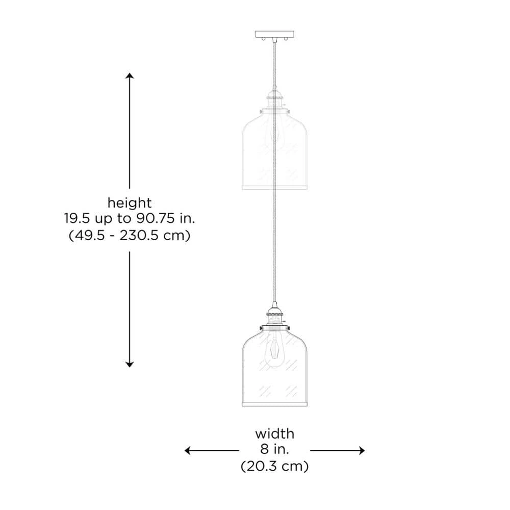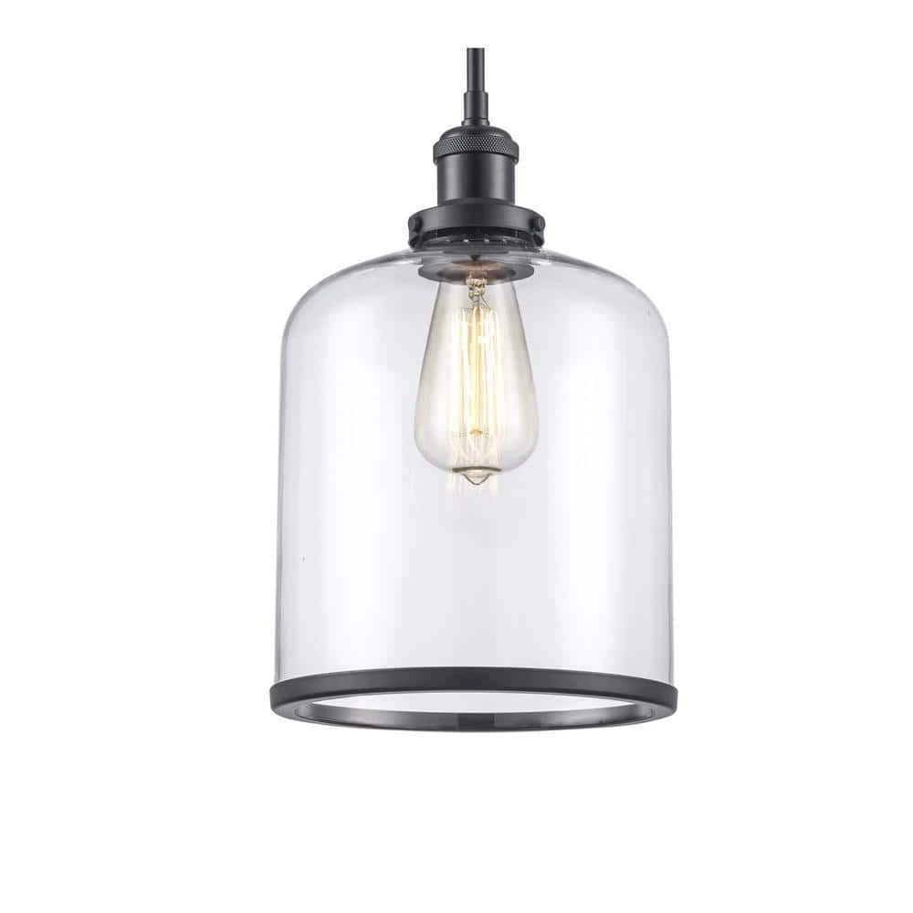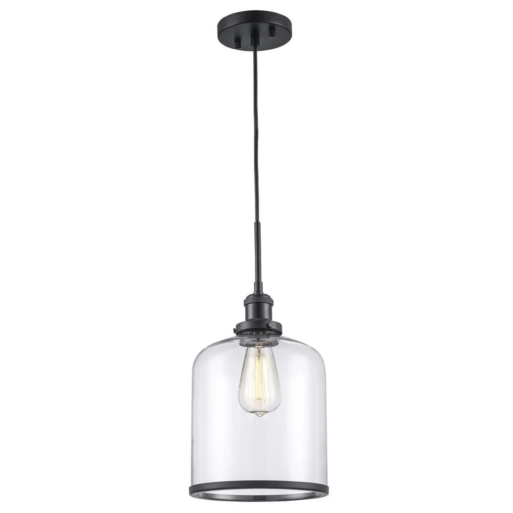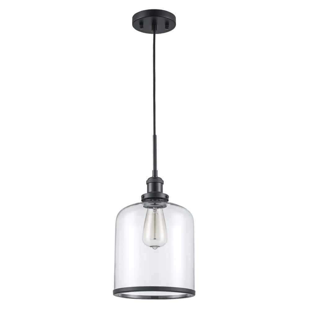 The Dorina Collection from Bel Air exhibits transitional indoor lighting designed to suit a variety of home decor styles from industrial to modern. The Dorina mason jar mini pendant is a decorative hanging light that works well in dining areas, kitchens and foyer entrances. Use as a single unit over a dining room table or install as a set over a linear kitchen island or bar table for additional illumination in larger spaces. The fixture is constructed of black-finished metal and includes a circular ceiling plate and a decorative socket cover to hold the glass shade in place. The clear glass shade features a rounded cylinder shape, houses a single light bulb and is open at the bottom for easy access to change the bulb. A ring of black metal at the bottom of the glass highlights the transitional style and matches the black finish throughout the piece. The pendant body hangs from a wire which offers height adjustability and sloped ceiling compatiblity.