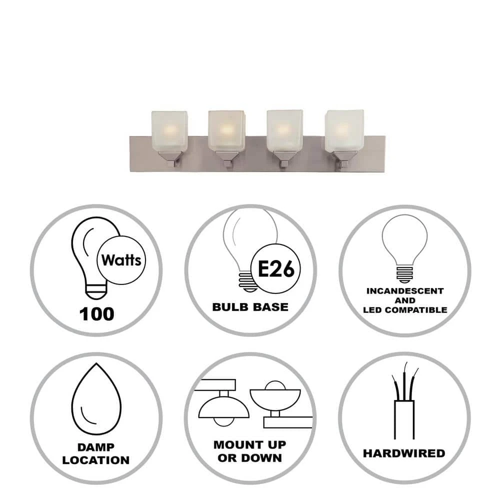 The Edwards Collection from Bel Air offers vanity lights with a sleek, transitional look and high quality finishes. The Edwards 30 in. W vanity bar provides ample task lighting and area lighting for medium to larger sized bathrooms and powder rooms. The piece features a simple rectangular wall plate that holds four frosted glass shades in place. Each of the square shades is open at the top to allow for easy access to change the bulb, and for directional illumination either above or below as the fixture can be mounted with the shades facing up or down. This vanity light offsets the frosted glass with a metallic pewter finish, adding a contemporary feel and allowing the piece to blend seamlessly with chrome and nickel bathroom hardware.