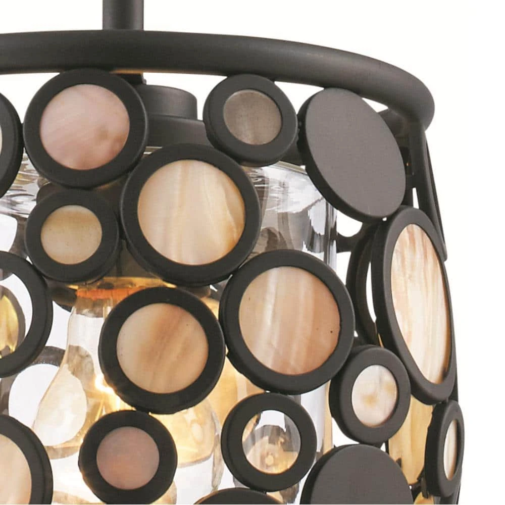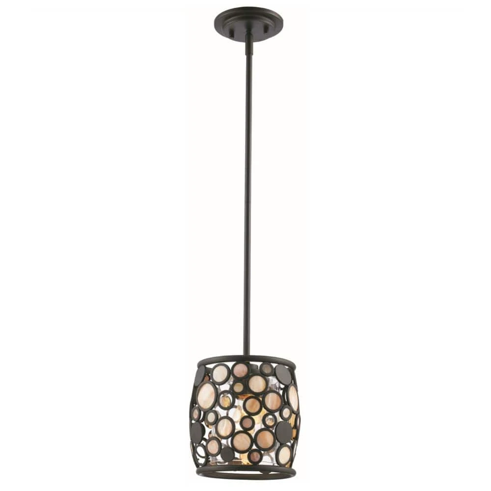 The Fisher Collection from Bel Air lighting was designed to serve as a functional focal point for your home’s kitchen and dining room spaces, providing ample illumination and a beautiful statement piece to complement existing decor. Its rubbed oil bronze finish adds a tasteful touch of warmth and lighting to your interior design. Contemporary at heart, this pendants open outer shade is highlighted by a series of artistic circles fashioned from multicolored and multi-textured stones. A clear glass inner shade protects the bulb without interfering with the illumination output. The Fisher collection will compliment a variety of decor styles, from transitional to modern, and is ideal for adding a warm glow above counters and kitchen islands.
