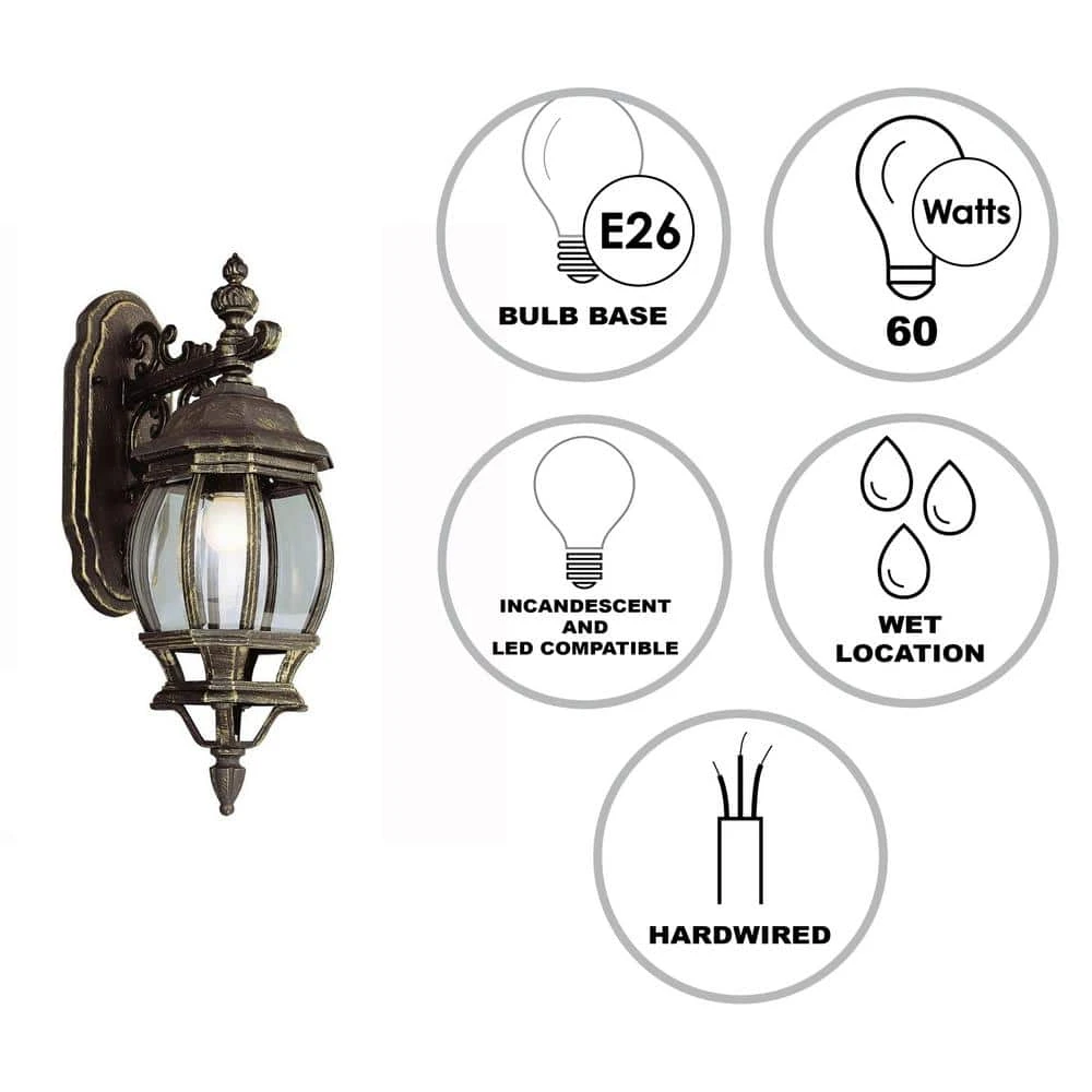 The Francisco Collection from Bel Air adds a taste of Tuscany to your home’s exterior. The outdoor wall lights are a perfect complement for French architecture, designed to match the look and feel of your home and crafted to deliver years of reliable performance. The Francisco 18 inch tall sconce features a hanging lantern design with the onion style glass shade ‘hanging’ on a decorative arm adorned with scroll features, an element present throughout the Francisco family of outdoor lights. The piece is finished in black, designed to coordinate with existing fixtures. A single 60-watt bulb is housed behind the clear glass, offering ample illumination in porch entryways, patios, driveways, and decks. The bulb can be easily accessed by removing the glass and bottom of the fixture from the decorative top, held in place by two hex nuts. With its classic design and multiple finish choices to choose from, the Francisco 18 inch sconce makes a great choice to highlight a wide range of home styles. Mount as a single unit, or pair in multiples on either side of a garage door or grand entryway.