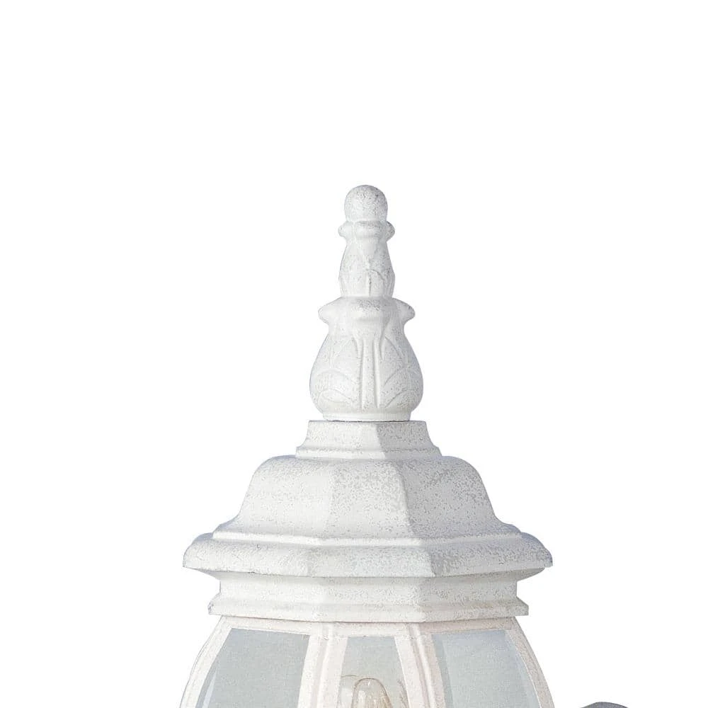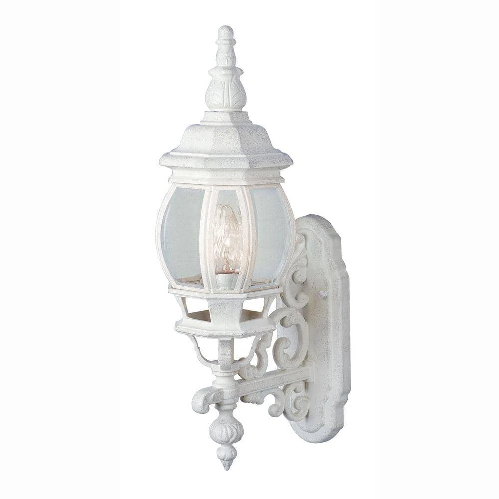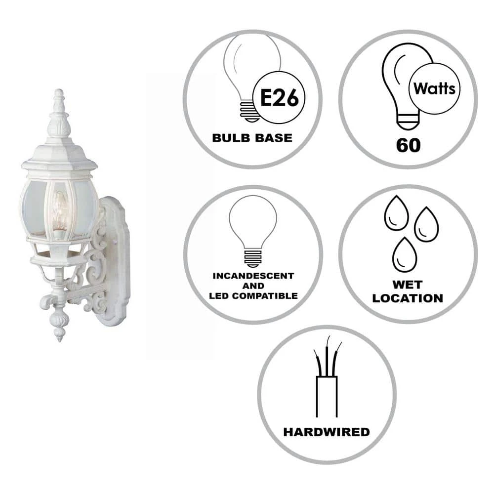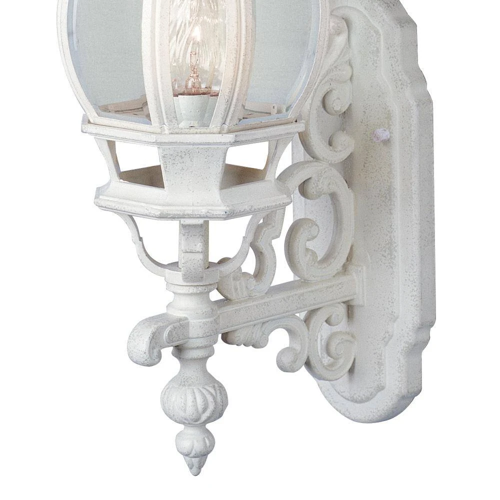 The Francisco Collection from Bel Air adds a taste of Tuscany to your home’s exterior. The outdoor wall lights are a perfect complement for French architecture, designed to match the look and feel of your home and crafted to deliver years of reliable performance. The Francisco 19.5 inch tall wall lantern features a coach light “up” mount design with the onion style glass shade sitting on a decorative arm adorned with scroll features, an element present throughout the Francisco family of outdoor lights. The piece is finished in white, designed to coordinate with existing fixtures. A single 60-watt bulb is housed behind the clear glass, offering ample illumination in porch entryways, patios, driveways, and decks. The bulb can be easily accessed by removing the decorative top, held in place by two hex nuts. With its classic design and multiple finish choices to choose from, the Francisco 19.5 inch sconce makes a great choice to highlight a wide range of home styles. Mount as a single unit, or pair in multiples on either side of a garage door or grand entryway.