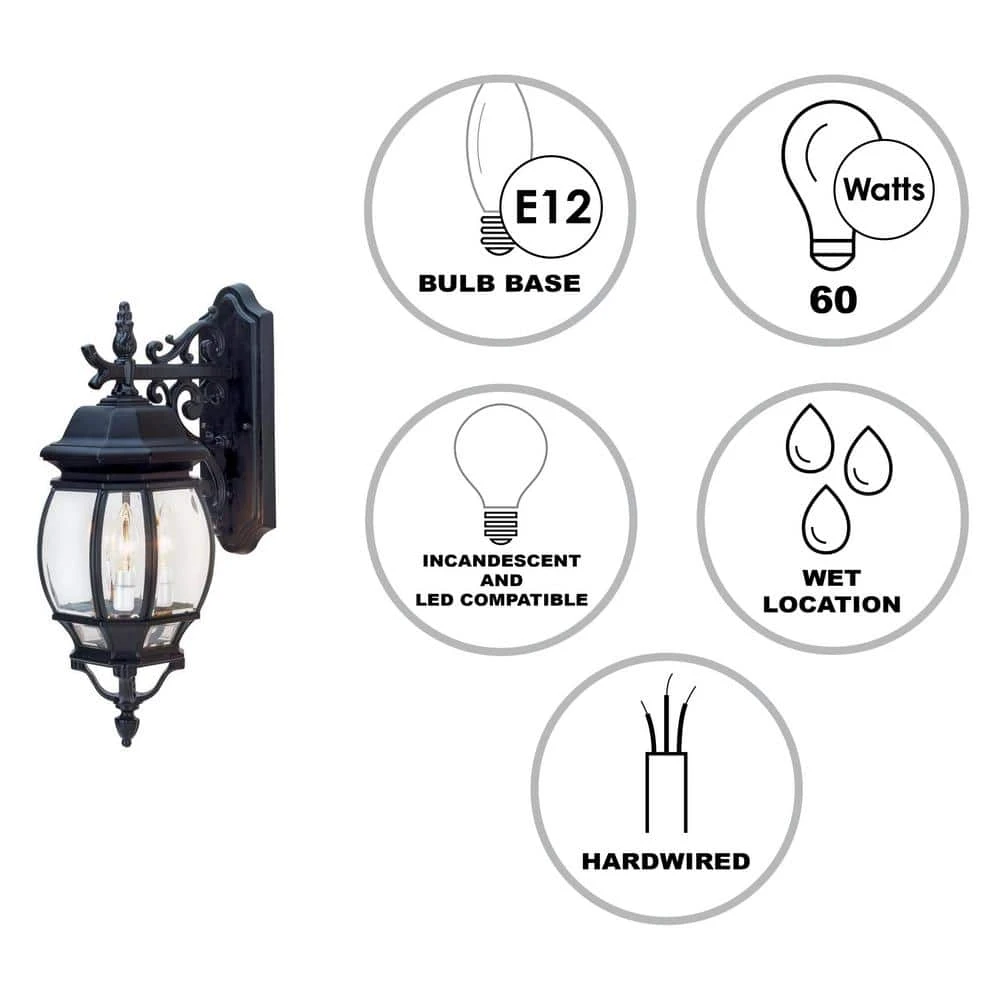 The Francisco Collection from Bel Air adds a taste of Tuscany to your home’s exterior. The outdoor wall lights are a perfect complement for French architecture, designed to match the look and feel of your home and crafted to deliver years of reliable performance. The Francisco 21 inch tall sconce features a hanging lantern design with the onion style glass shade ‘hanging’ on a decorative arm adorned with scroll features, an element present throughout the Francisco family of outdoor lights. The piece is finished in black, designed to coordinate with existing fixtures. Three 60-watt candelabra bulbs are housed behind the clear glass, offering ample illumination in porch entryways, patios, driveways, and decks. The bulbs can be easily accessed by removing the bottom of the fixture from the decorative top, held in place by two hex nuts. With its classic design and multiple finish choices to choose from, the Francisco 21 inch sconce makes a great choice to highlight a wide range of home styles. Mount as a single unit, or pair in multiples on either side of a garage door or grand entryway.
