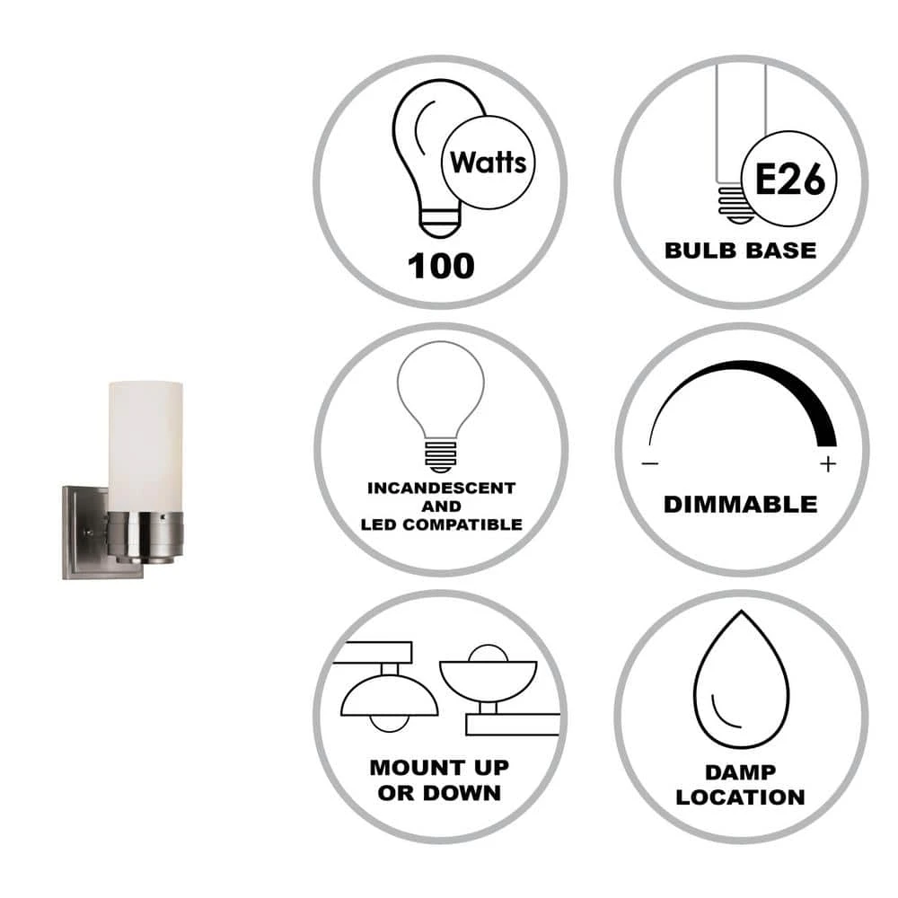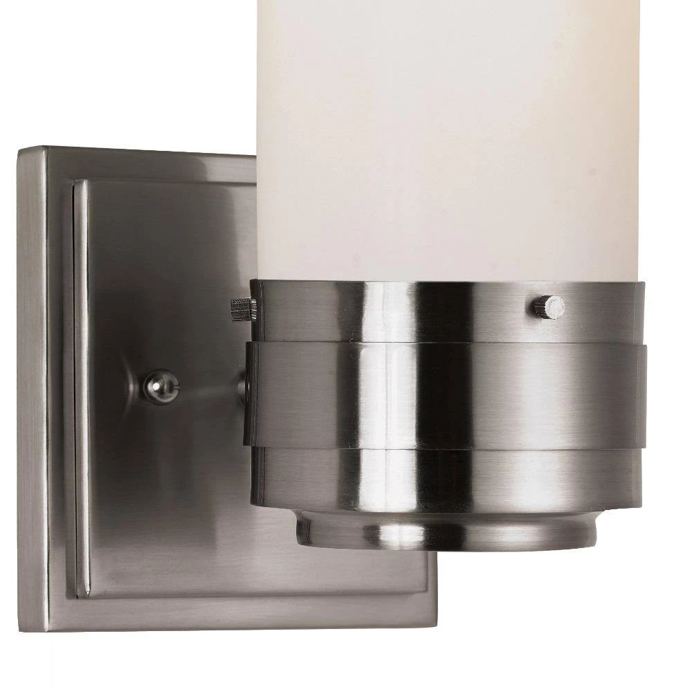 The Fusion Collection from Bel Air exhibits contemporary style interior lighting, designed to coordinate well with a variety of interior decor styles from transitional to modern. The Fusion wall sconce accepts a single 100-watt light bulb, offering both accent lighting and task lighting for hallways, bathrooms, powder rooms, and more. The white frosted glass cylinder compliments the metallic brushed nickel finish and is open at the top to allow easy access to change the bulb when needed. This wall light can be mounted up or down for a customized look and directional lighting. Shop the Fusion Collection for additional vanity styles, and coordinating indoor lighting for the rest of the home.