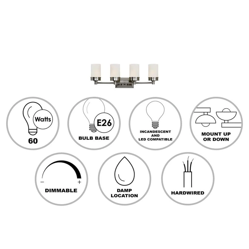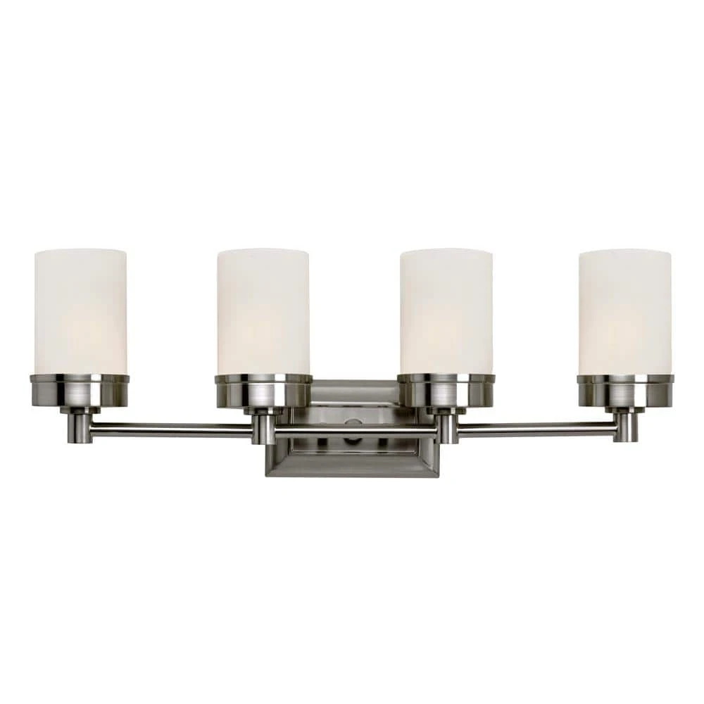 The Fusion Collection from Bel Air exhibits modern vanity lighting that works well in updated traditional, transitional, and contemporary decor styles. The Fusion 27.5 inch wide vanity bar is a decorative way to bring task lighting into your bathroom and powder rooms areas. The polished chrome finish will coordinate with existing chrome fixtures and bathroom hardware while the crisp white cylindrical shades add a contemporary feel to the piece. Each of the four shades is open at the top to allow easy access to the bulbs, and to allow for directional lighting either above or below the fixture as it can be mounted facing up or down. This 4-light fixture has simple clean lines with a rectangular wall mounting plate and matching chrome hardware. Shop the Fusion Collection for additional finishes and coordinating bathroom lighting.