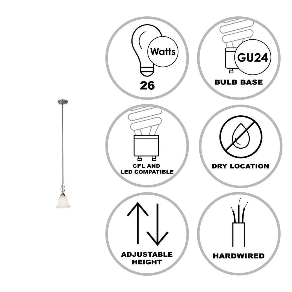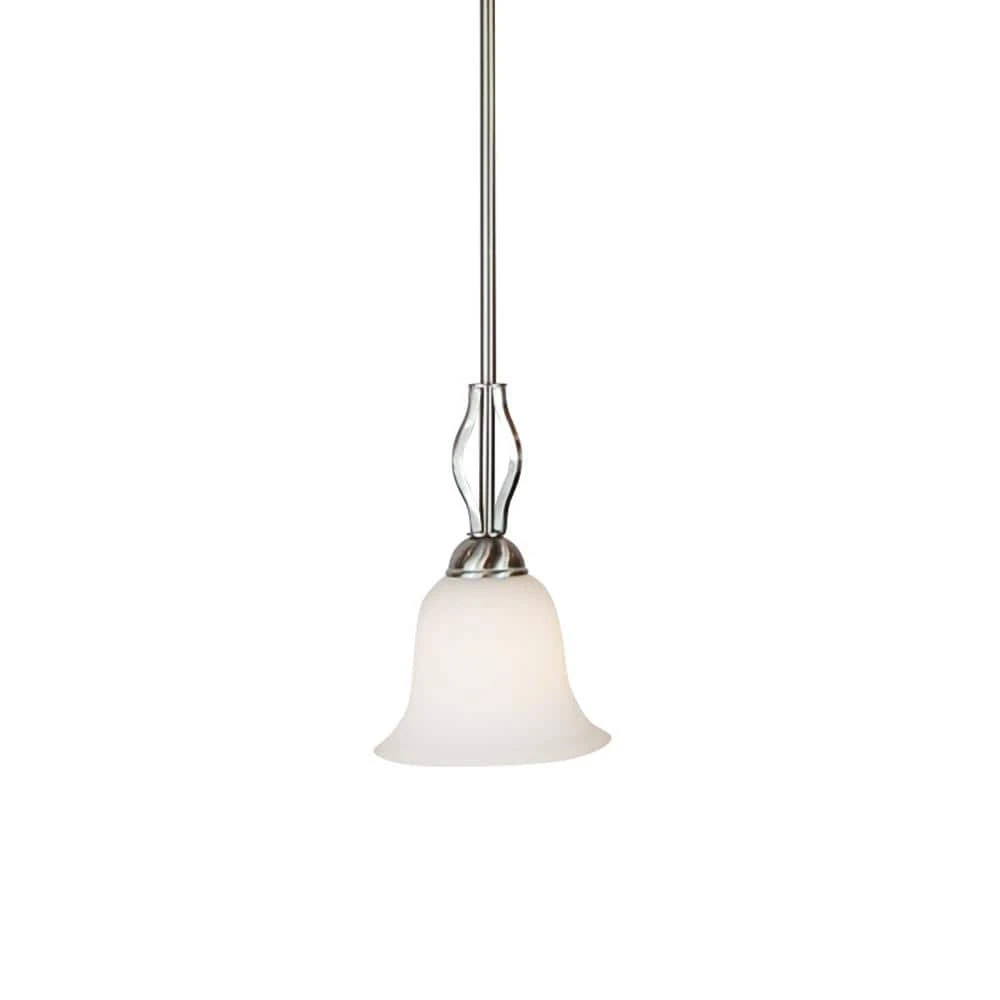 The Glasswood Collection from Bel Air exhibits transitional indoor lighting designed to suit a variety of home decor styles from traditional to modern. The Glasswood mini pendant is a decorative hanging light that works well in dining areas, kitchens, and other compact spaces where focused light is needed. Use as a single unit, or install as a set over a linear kitchen island or bar table for additional illumination in larger spaces. The fixture is constructed of brushed nickel finished metal and includes a circular ceiling plate and a delicately curved support structure that matches accents present throughout the Glasswood family. The white frosted glass shade features a bell shape, houses a single CFL light socket, and is open at the bottom for easy access to change the bulb. The pendant body hangs from extension rods, of which multiple extra rods are included for an adjustable height. Shop the Glasswood Collection for coordinating interior lighting for the whole house.