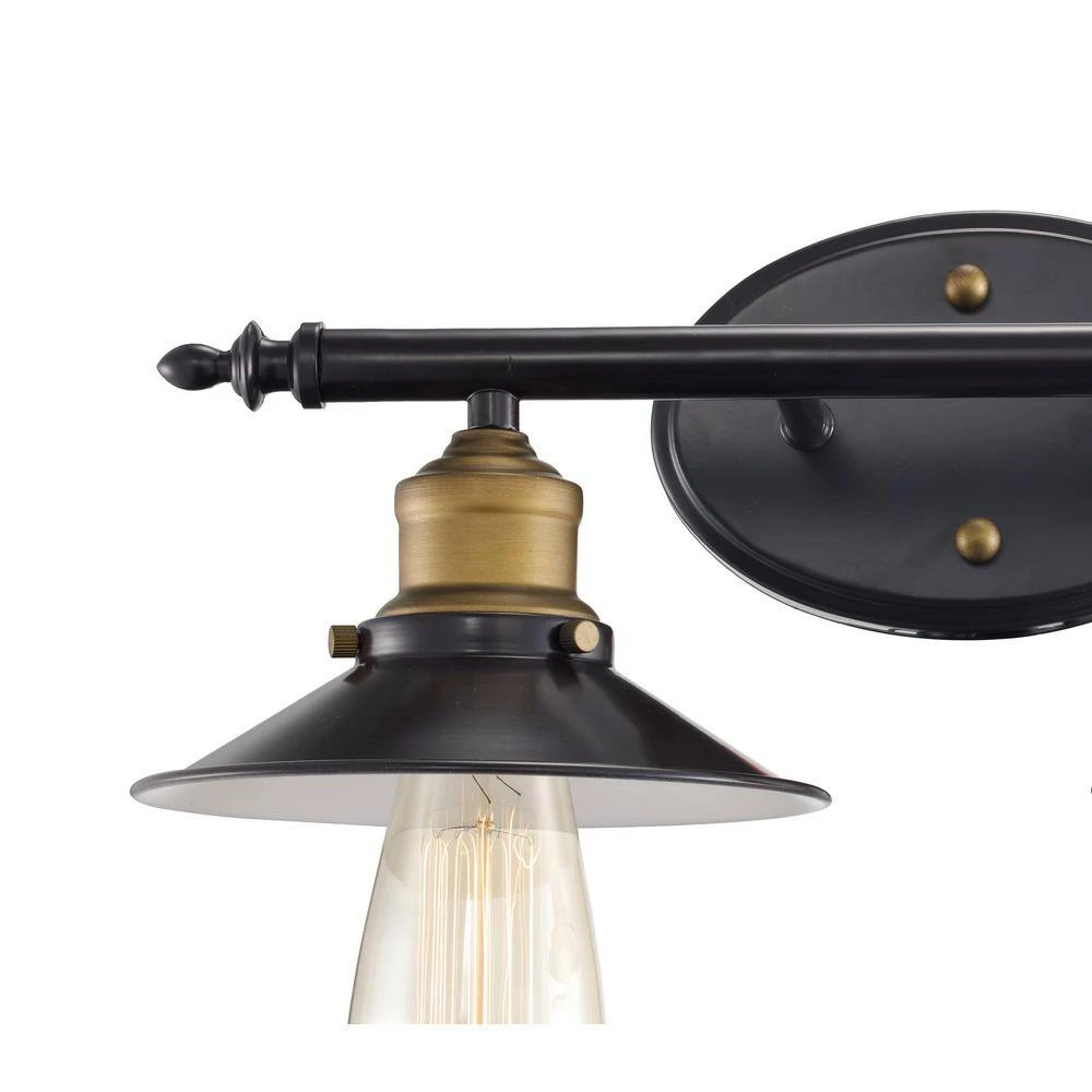 The Griswald Collection features industrial style interior lighting designed to coordinate well with a variety of interior decor styles, from farmhouse to modern. The Griswald 2 light vanity bar is offered in a trendy, two-toned bronze and brass finish. Two metal dome shades are held in place by a matching bronze straight arm with carved finial detail on the ends. Two bulbs hang down below the shades, and vintage style Edison bulbs are recommended to capitalize on the retro industrial style of the piece. The Griswald vanity family is a decorative way to bring light into your bathroom and powder room areas. Shop the collection for additional finishes and light counts.