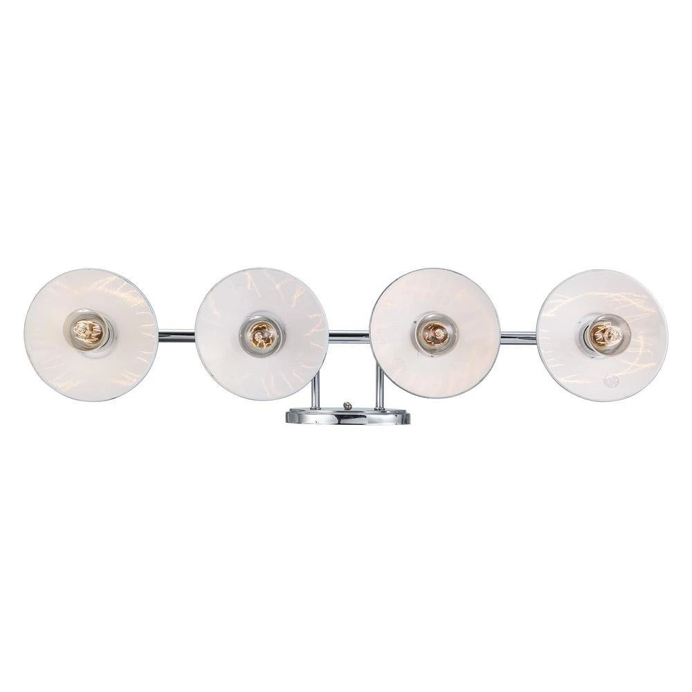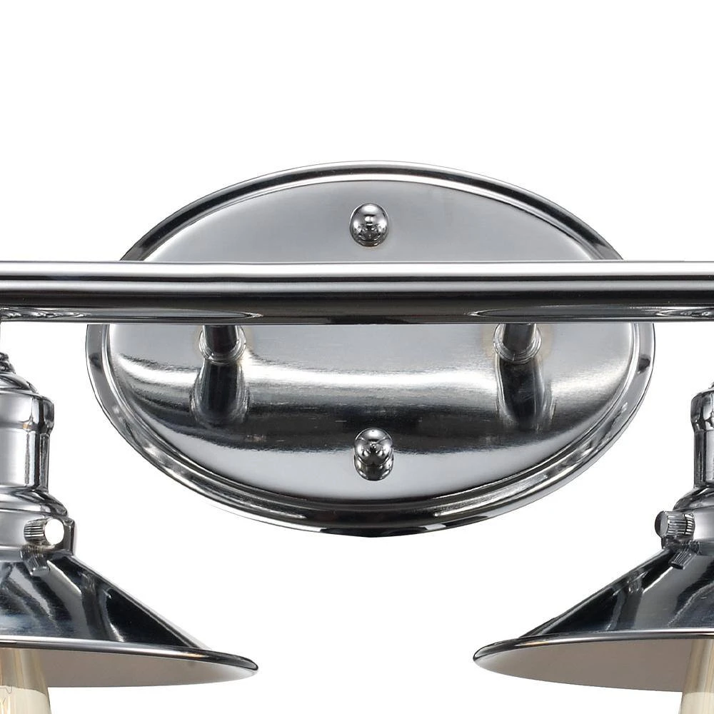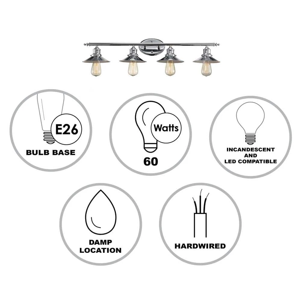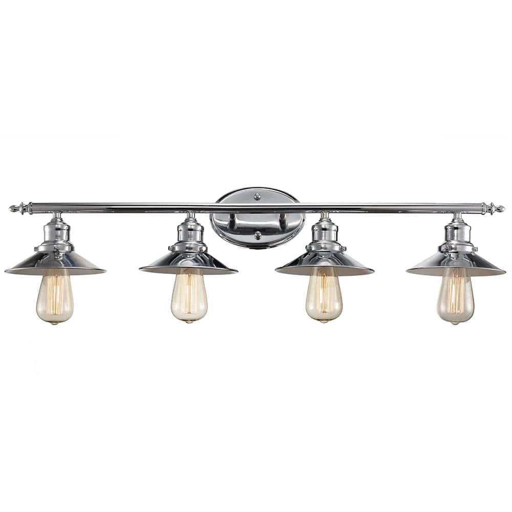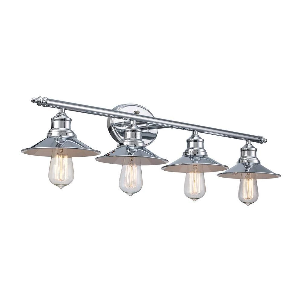 The Griswald Collection features industrial style vanity lighting designed to coordinate well with a variety of bathroom and powder room decor styles, from farmhouse to modern. The Griswald 4 light vanity bar is offered in a sleek polished chrome finish designed to coordinate with existing bathroom hardware. Four metal dome shades are held in place by a matching chrome straight arm with carved finial detail on the ends. The bulbs hang down below the shades, and vintage style Edison bulbs are recommended to capitalize on the retro industrial style of the piece. The Griswald vanity family is a decorative way to bring light into your bathroom and powder room areas. Shop the collection for additional finishes and light counts.