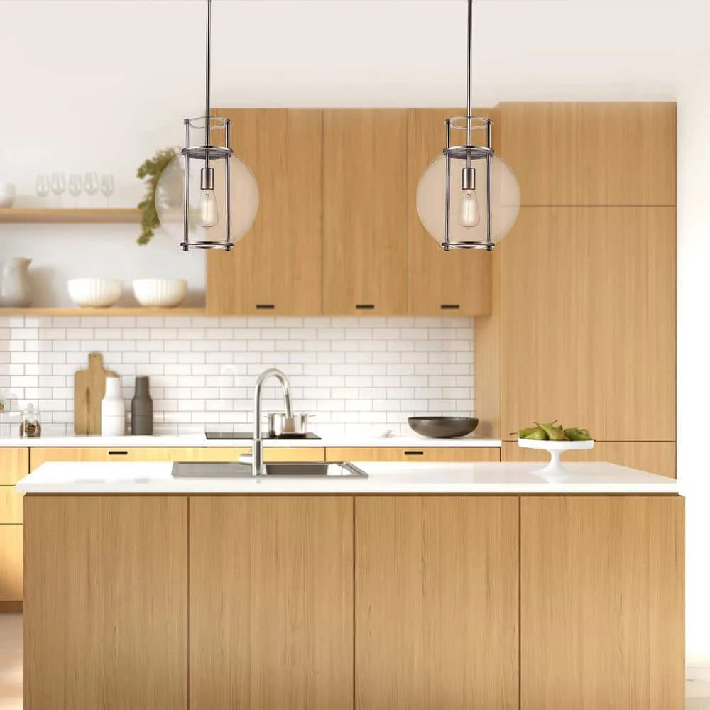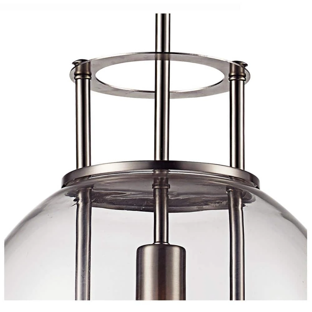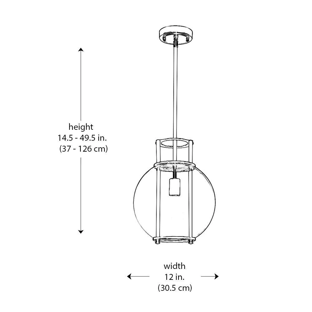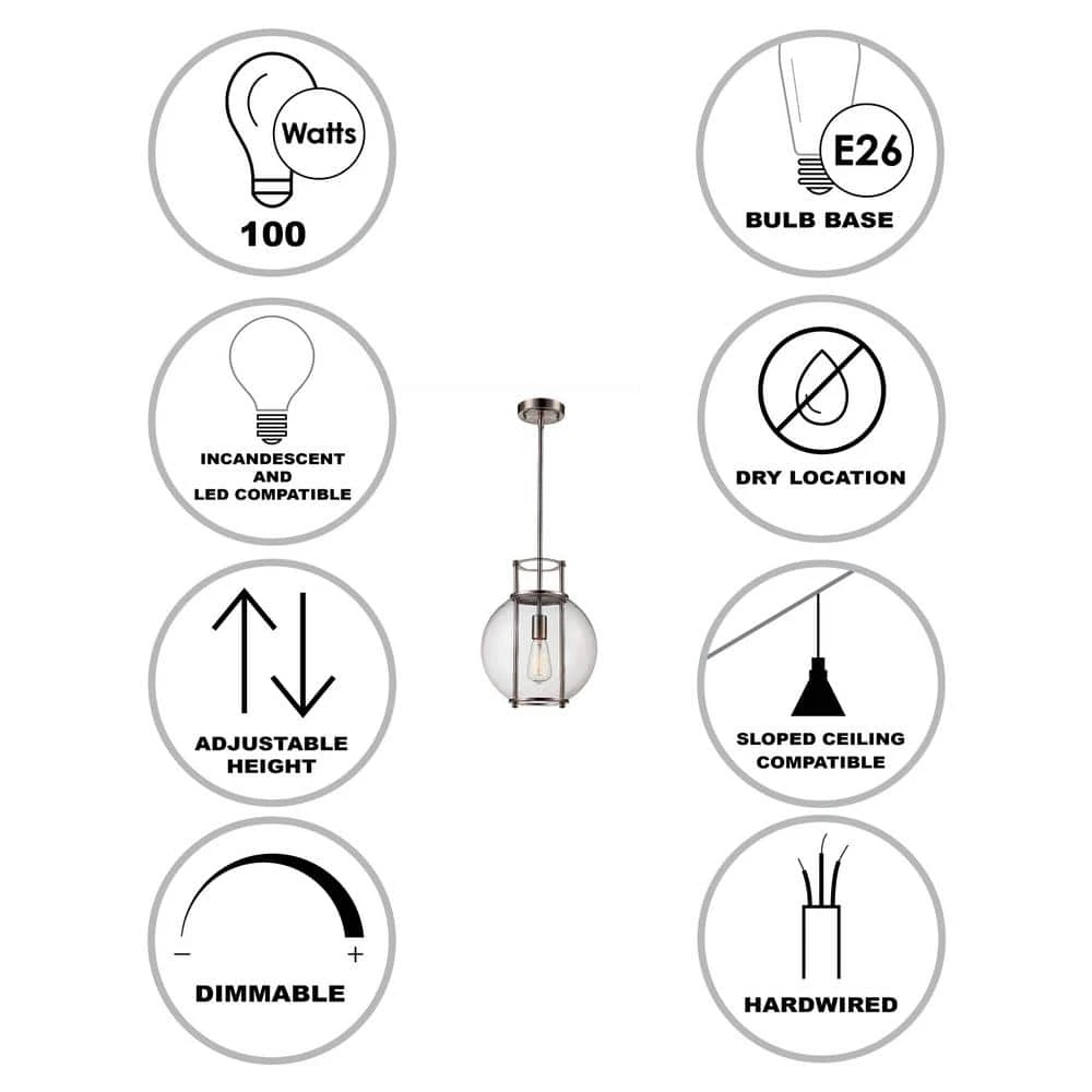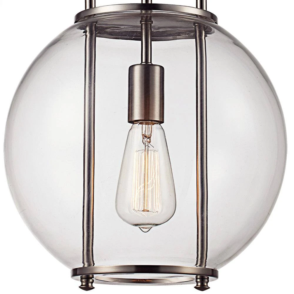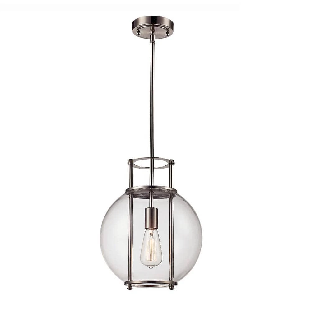The Grove Collection from Bel Air exhibits transitional pendant lighting ideal for use in foyer entryways, kitchen areas, and dining rooms. The Grove 12-inch pendant draws on industrial and midcentury design themes to create a pendant that is truly unique. The midcentury inspired glass globe shade includes a cylindrical metal detail providing support above, below, and inside the glass. A decorative socket hangs down inside the glass, accepting a single 100-watt incandescent or LED equivalent light bulb. A vintage Edison style filament bulb is recommended to highlight the industrial tone of the piece. The metal fixture is finished in brushed nickel and includes various lengths of matching extension rods to support the pendant body. A round ceiling plate is included and, when used with the extension rods, allows for an adjustable height and sloped ceiling compatiblity. Mount the Grove pendant as a single unit, or use as a set along a linear kitchen island or bar table.