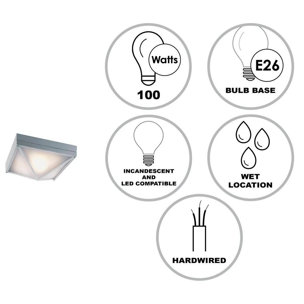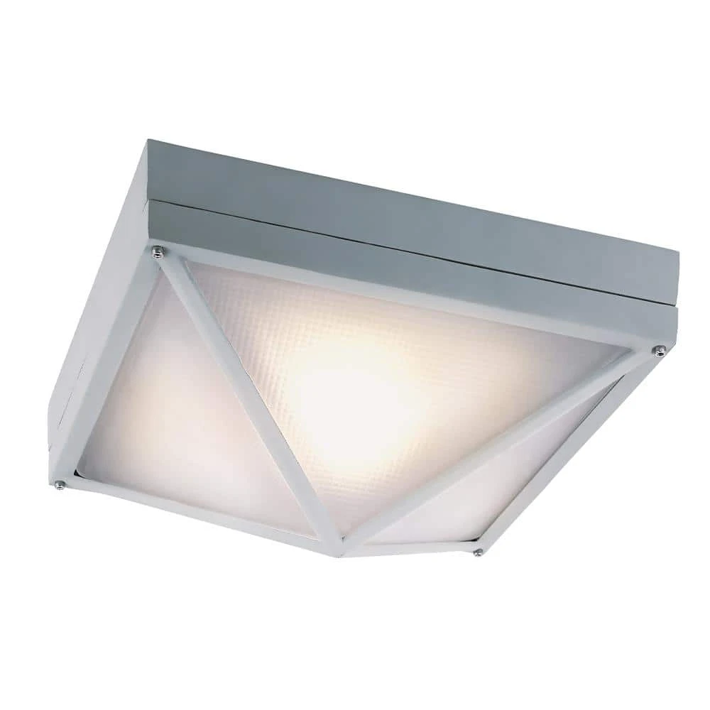 The Harland Collection from Bel Air exhibits outdoor ceiling lights with utilitarian appeal, ideal for use in garage spaces, utility closets, outdoor stairwells and covered walkways. The simple design is highlighted by a square metal frame and inverted pyramid shaped shade that extends down from the ceiling. The frosted glass shade is textured with a hobnail pattern and includes a metal support cage over top to protect the glass from breakage and add a unique touch to the fixture. The Harland flush mount is low profile, allowing it to be used in areas with low ceiling clearance. Hardware and instructions are included for an easy installation.