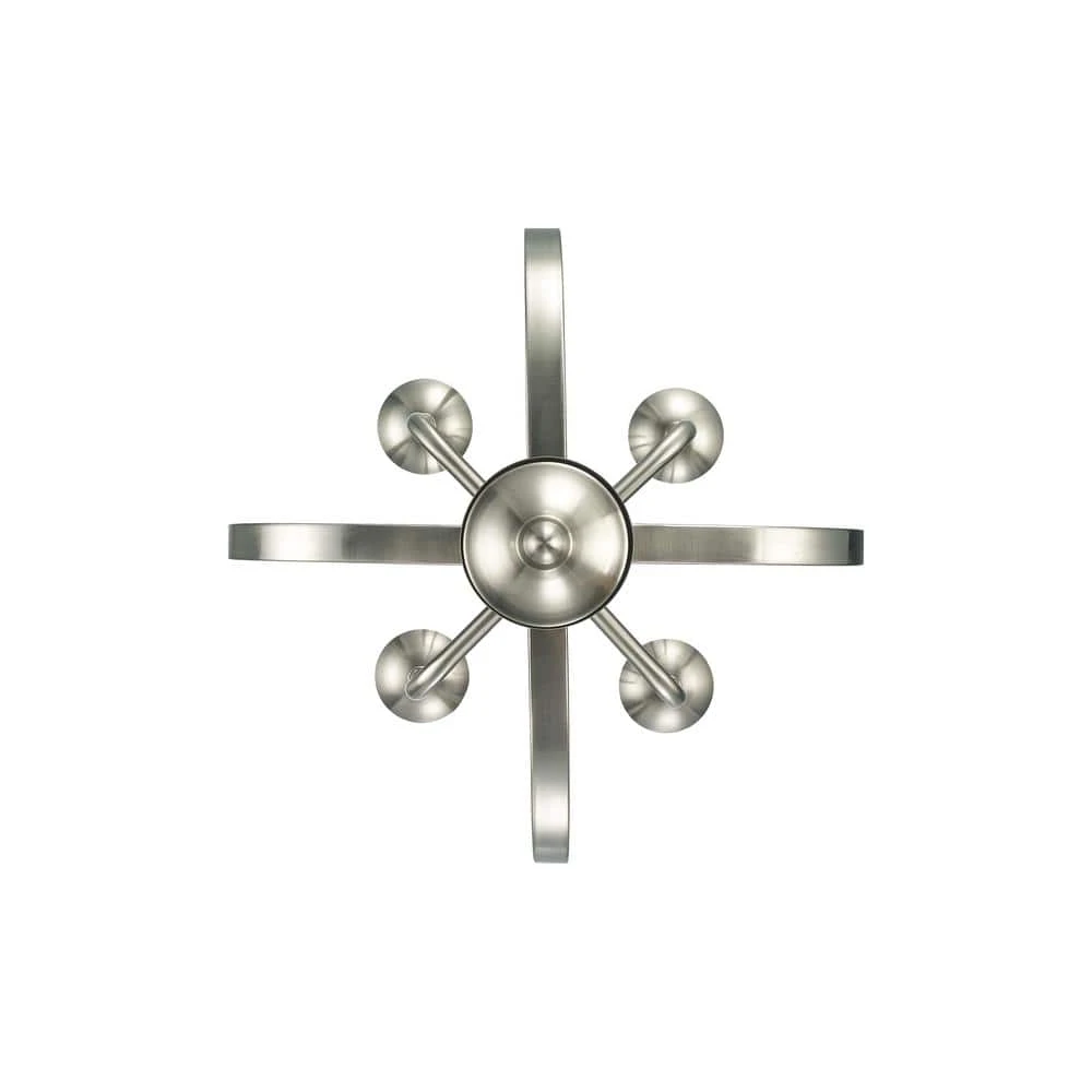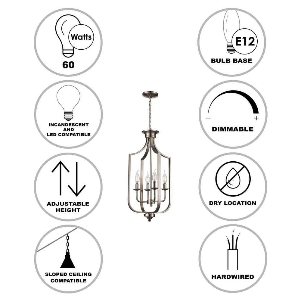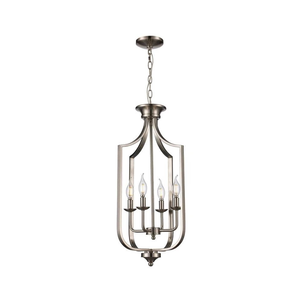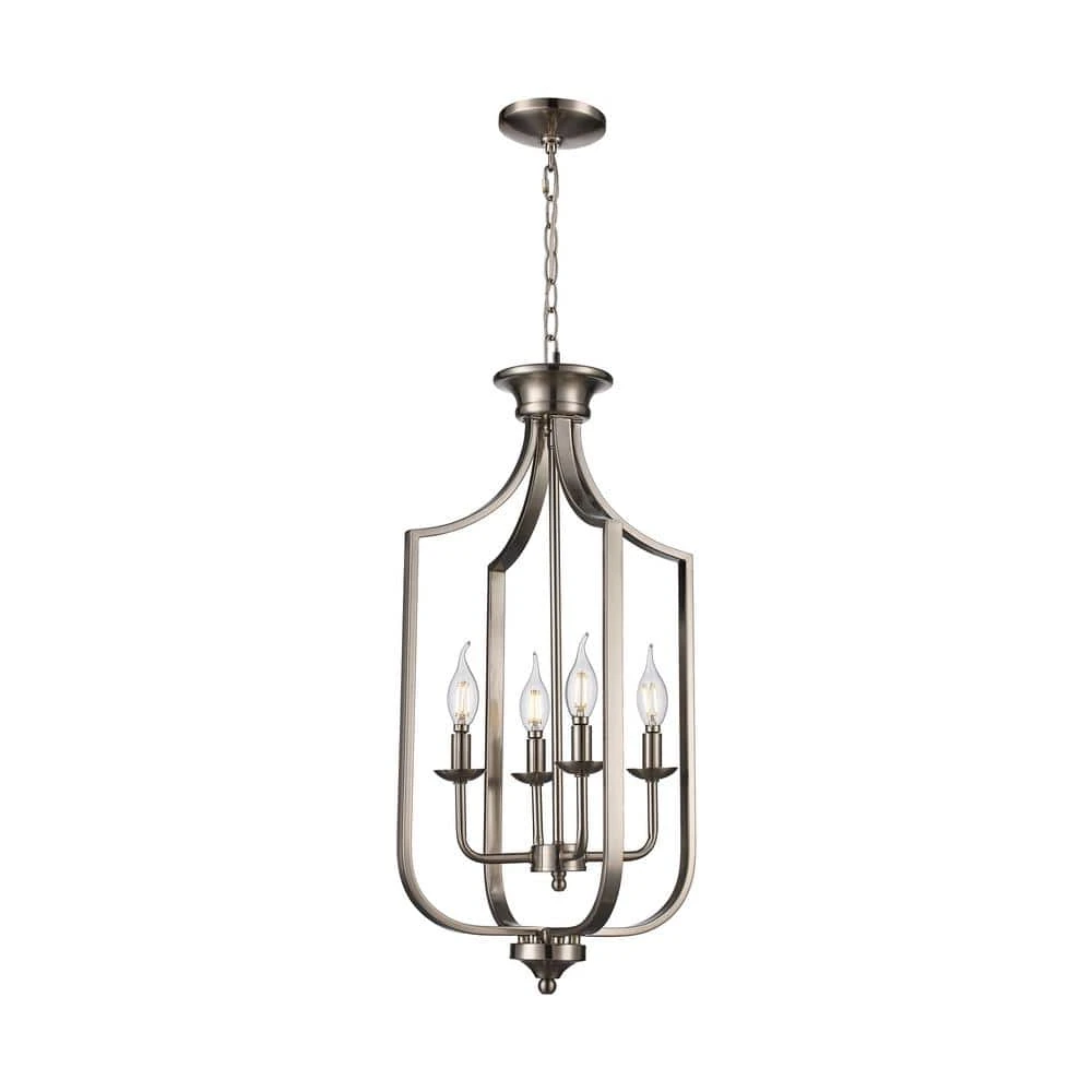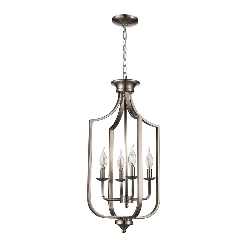 Enhance your kitchen, dining room, or foyer entryway with the classic styling of this four-light pendant from Bel Air Lighting. The sleek and gracefully curved metal cage highlights a rustic, industrial appeal while the exposed candelabra candle-stick style bulbs give it a traditional feel. The metallic brushed nickel finish will coordinate with a variety of interior decor styles, and is designed to blend seamlessly with existing light fixtures. The vertical pendant body hangs from a matching nickel chain and round ceiling canopy, offering height adjustability and sloped ceiling compatibility. With a variety of colors and size options to choose from, this stylish pendant series will put the finishing touch in any room of the home.