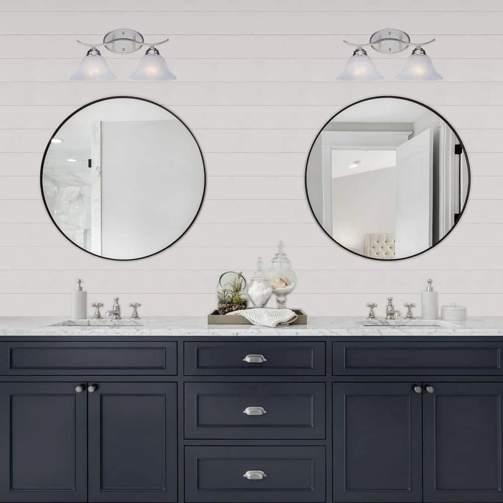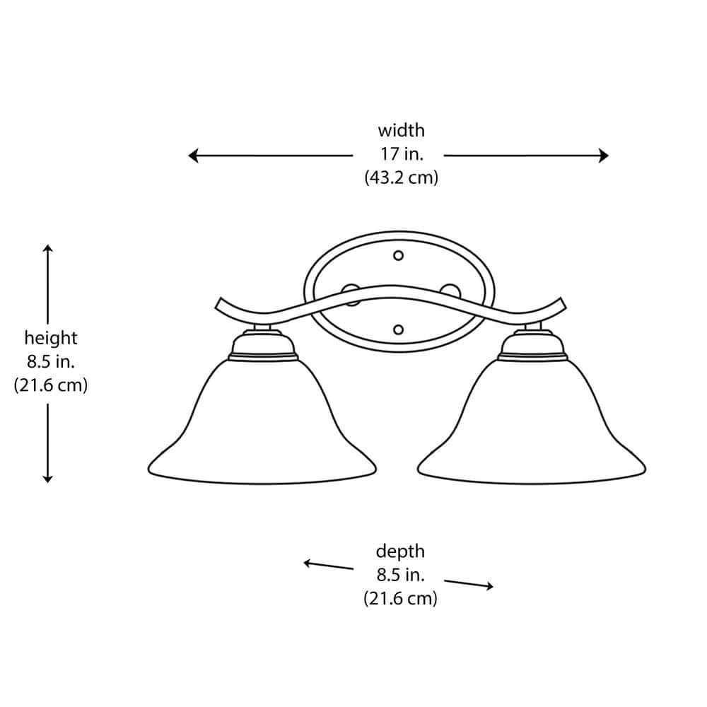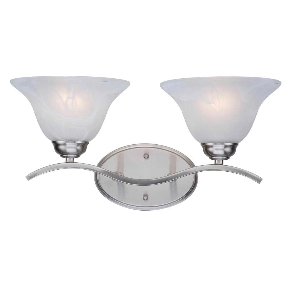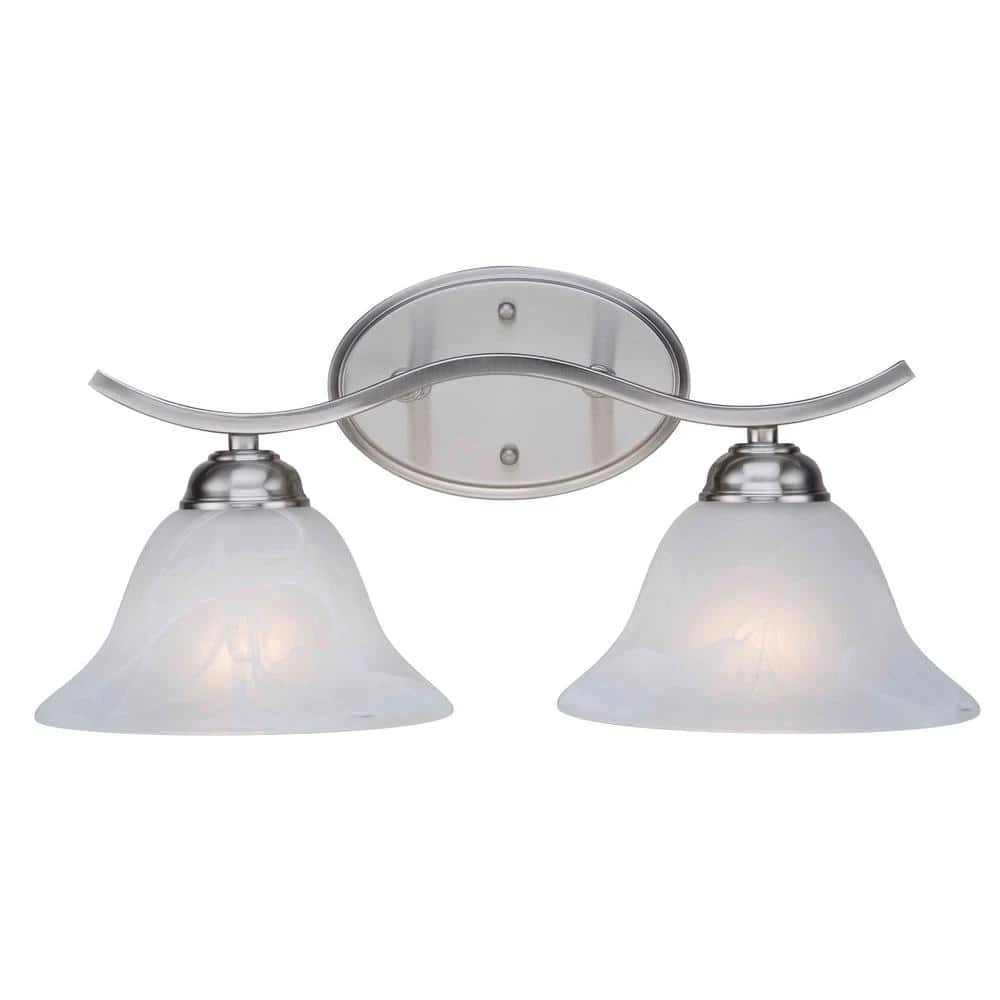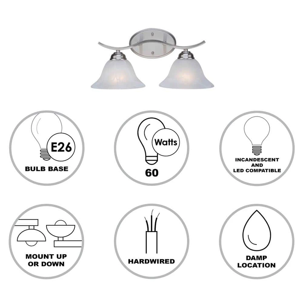 The Hollyslope Collection from Bel Air Lighting exhibits contemporary vanity lighting, designed to coordinate with a variety of bathroom and powder room decor styles from traditional to modern. The Hollyslope 17 inch wide vanity fixture is offered in an elegant, brushed nickel finish that will blend seamlessly with existing hardware. The two distinctive, marbleized glass bell-shaped shades add contemporary charm to your home while providing ample task lighting where needed most. Each of the shades is open at the bottom to provide easy access to the 60-watt bulb inside. The shades are held in place by a decorative wave arm and matching oval wall plate. The Hollyslope Collection is reversible, and can be mounted upwards or downwards for a customized look and directional lighting.