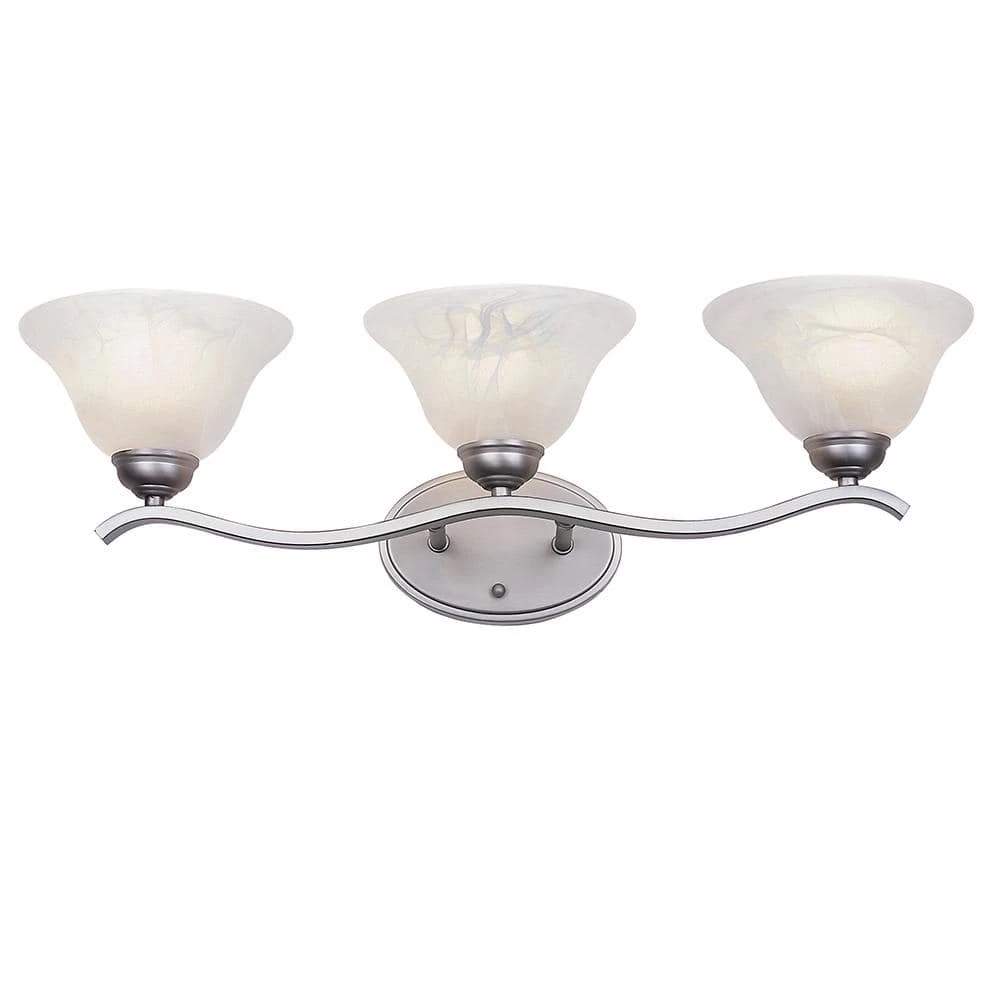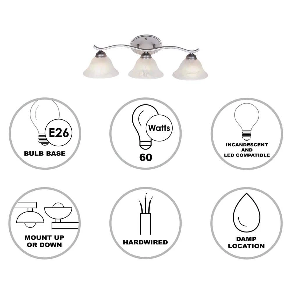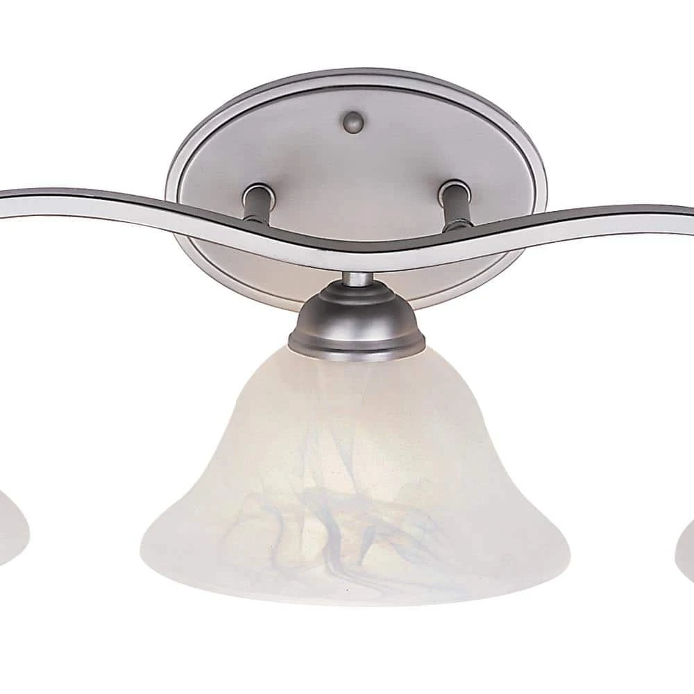 The Hollyslope Collection from Bel Air Lighting exhibits contemporary vanity lighting, designed to coordinate with a variety of bathroom and powder room decor styles from traditional to modern. The Hollyslope 26 inch wide vanity fixture is offered in an elegant, brushed nickel finish that will blend seamlessly with existing hardware. The three distinctive, marbleized glass bell-shaped shades add contemporary charm to your home while providing ample task lighting where needed most. Each of the shades is open at the bottom to provide easy access to the 60-watt bulb inside. The shades are held in place by a decorative wave arm and matching oval wall plate. The Hollyslope Collection is reversible, and can be mounted upwards or downwards for a customized look and directional lighting.