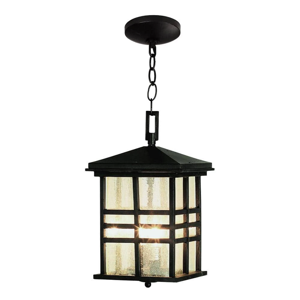 The Huntington Collection from Bel Air exhibits rustic style outdoor lights with sharp lines and decorative craftsman accents. The Huntington 8.5 inch square outdoor pendant is designed to add charming character to your home’s covered spaces while providing ample, functional illumination. The lantern is finished in black and includes tinted seeded glass windows underneath a caged frame, allowing the light to filter out warmly. The bottom is open to offer directional lighting below. A round ceiling canopy and matching black chain is included for an adjustable hanging height. Hang this pendant in porch entryways, exterior foyers, or covered patios.