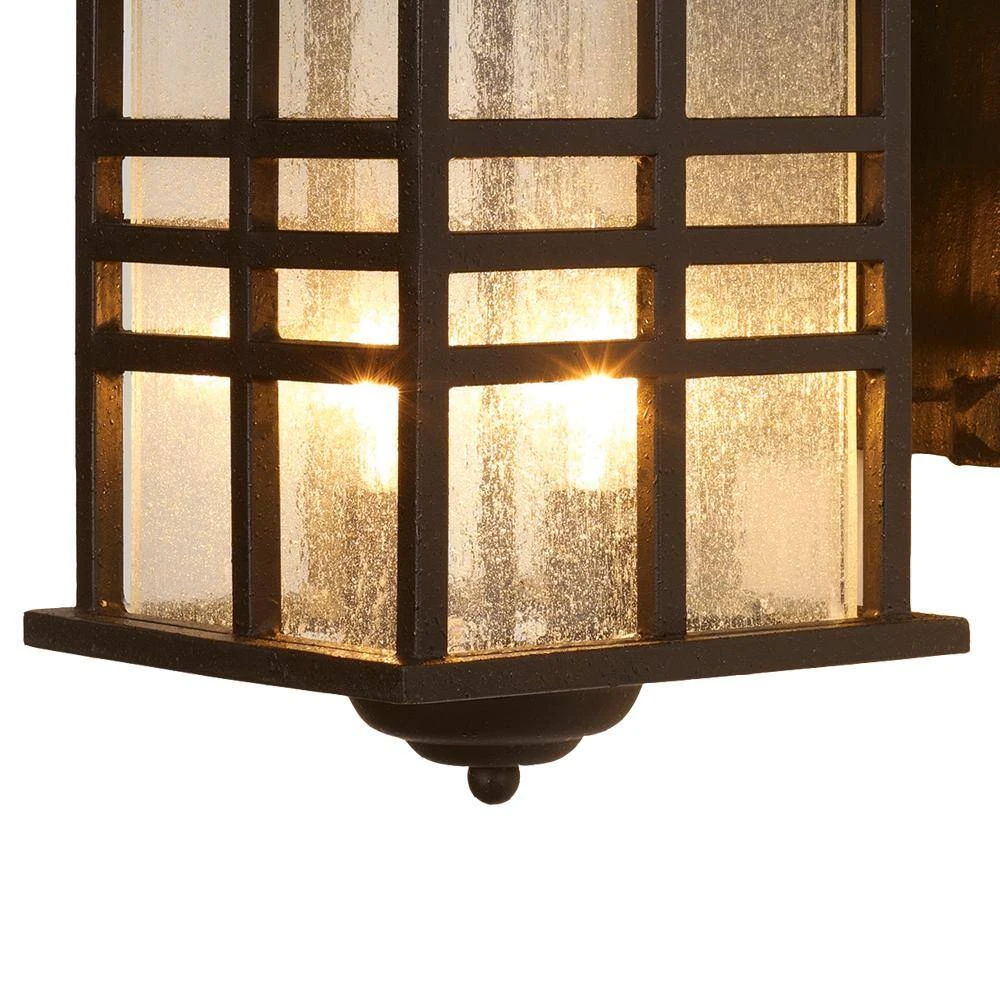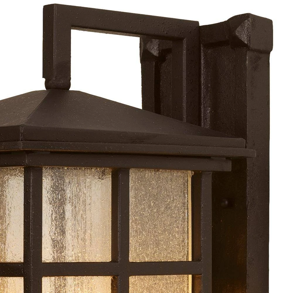The Huntington Collection from Bel Air exhibits rustic style outdoor lights with sharp lines and decorative craftsman accents. The Huntington 8.5 inch wide wall light is the medium sized sconce in the family, offering a two-light design that is open at the bottom for directional illumination below. The lantern is finished in weathered bronze and includes tinted seeded glass windows underneath a caged frame, allowing the light to filter out warmly. The square body is held in place by a simple, welded straight arm and matching rectangular wall plate. The smaller size and dual light design makes this a great option for smaller exterior spaces. Mount in porch areas, on either side of a front door or garage door, or along outdoor walkways and steps.