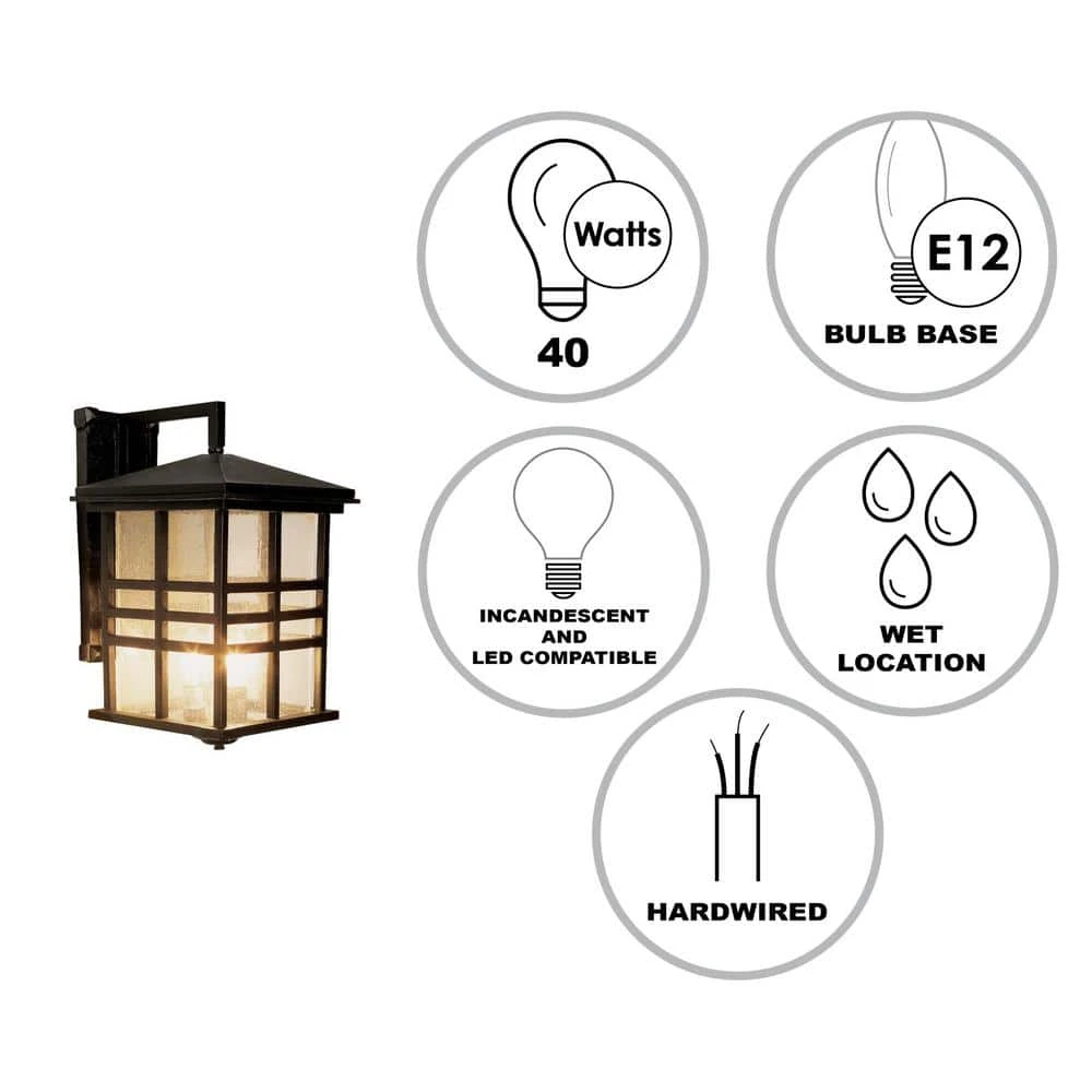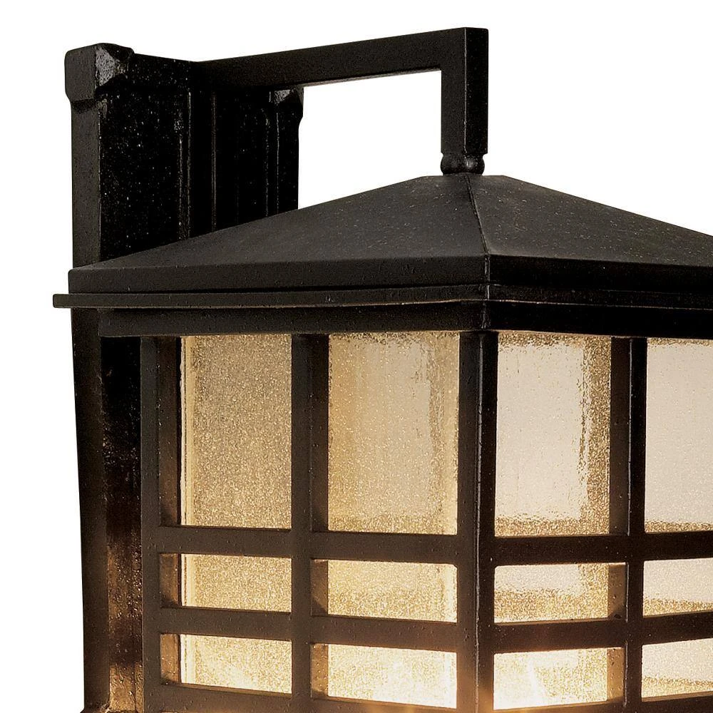 The Huntington Collection from Bel Air exhibits rustic style outdoor lights with sharp lines and decorative craftsman accents. The Huntington 10 inch wide wall light is the largest sconce in the family, offering a three-light design that is open at the bottom for directional illumination below. The lantern is finished in black and includes tinted seeded glass windows underneath a caged frame, allowing the light to filter out warmly. The square body is held in place by a simple, welded straight arm and matching rectangular wall plate. The larger size and three-light design makes this a great option for larger exterior spaces. Mount in porch areas, on either side of a front door or garage door, or along outdoor walkways and steps.