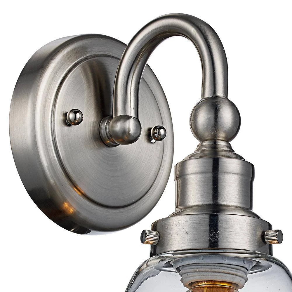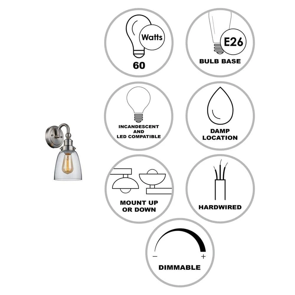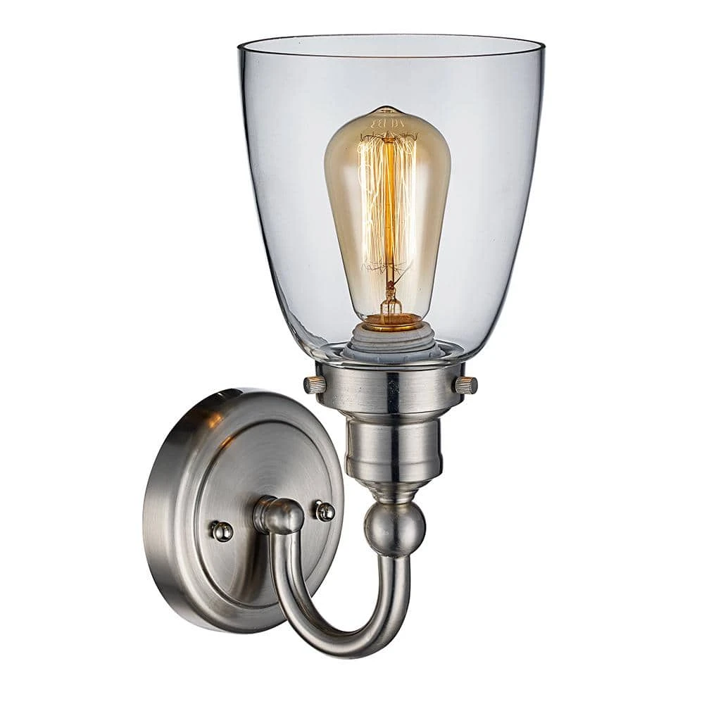 The Jennifer Collection from Bel Air combines industrial design themes with functionality, exhibiting unique wall lighting suitable for a variety of interior decor styles from farmhouse to modern. The Jennifer 12-inch wall light is finished in brushed nickel to coordinate with existing nickel fixtures and bathroom hardware. A single 60-Watt bulb is on display inside the clear glass bell shaped shade, making this the ideal wall fixture to display a vintage filament bulb for an added industrial touch. The sconce offers both accent lighting and supplemental area lighting as it stands out and showcases your home’s bathroom and powder room spaces. This wall light looks beautiful when mounted on either side of a mirror or vanity, or in a hallway or bedroom for additional lighting throughout the home. The Jennifer wall sconce can be mounted with the shade facing upwards or downwards for a customized look.