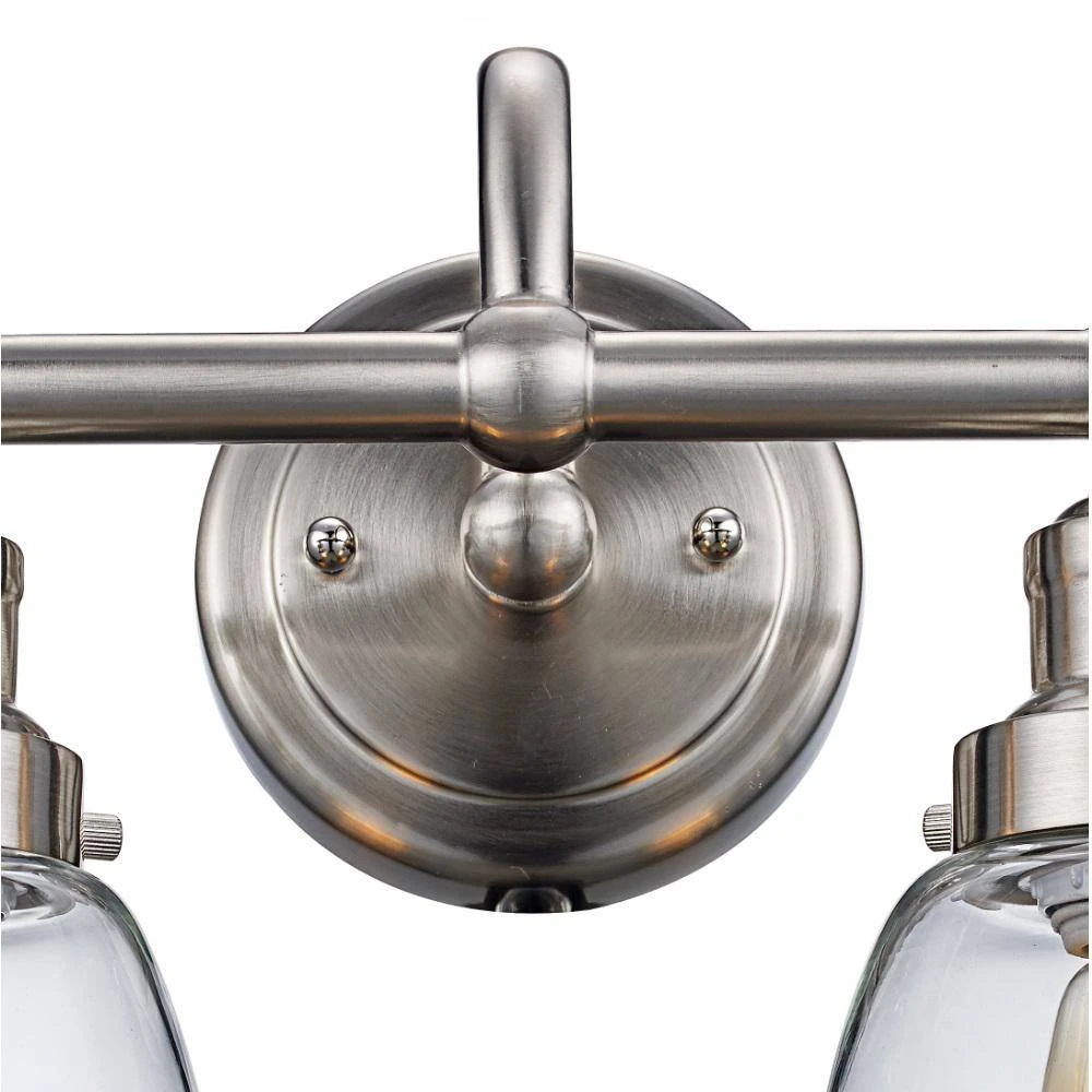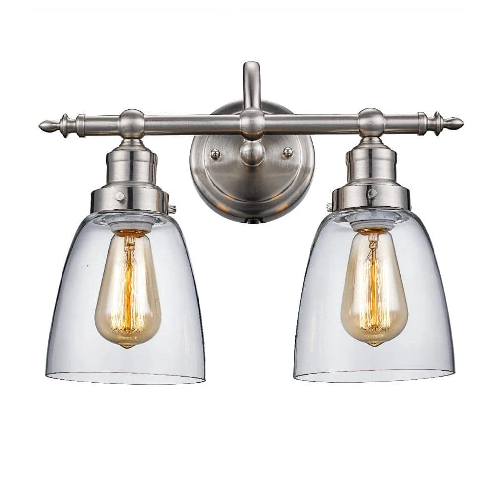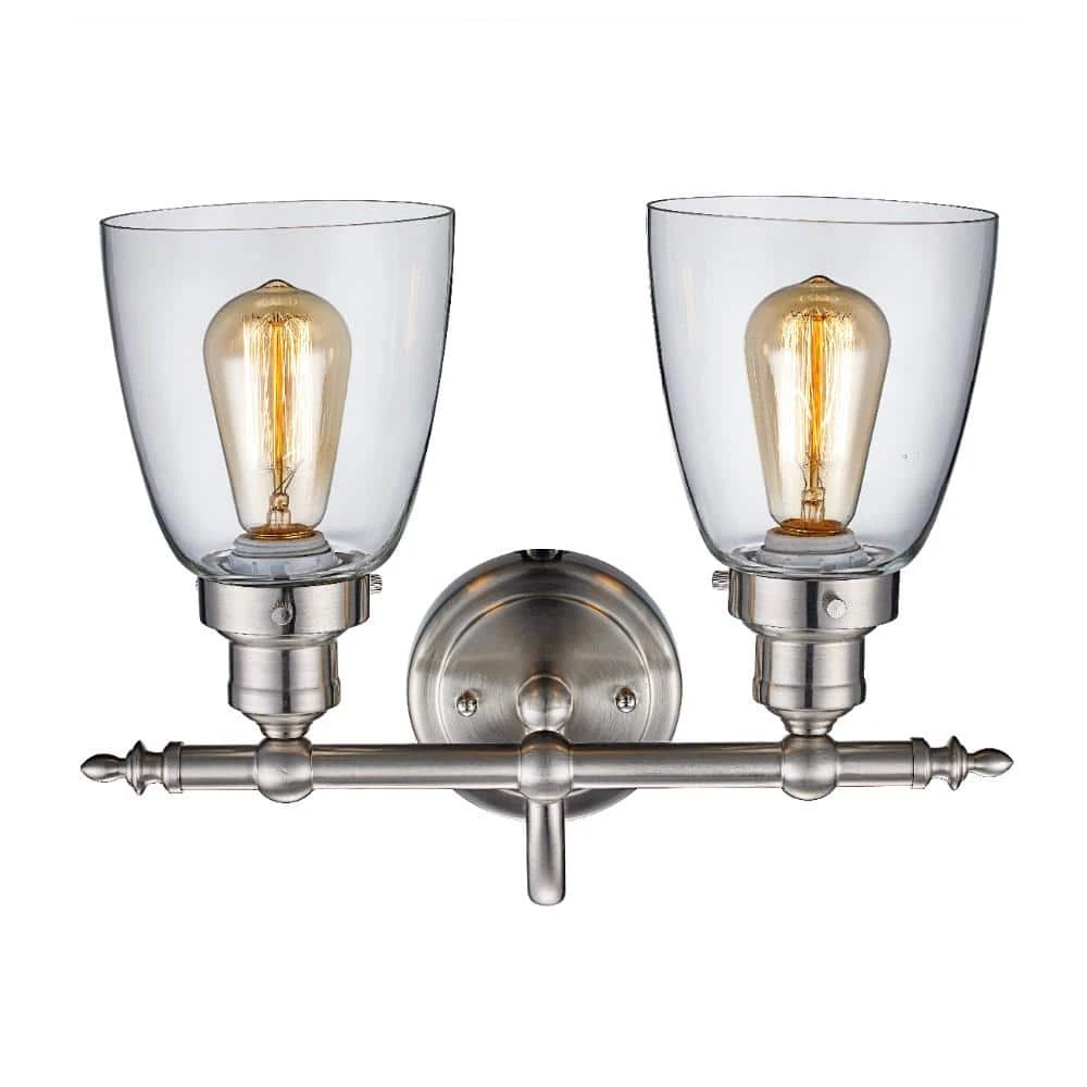 The Jennifer Collection from Bel Air combines industrial design themes with functionality, exhibiting unique bathroom lighting suitable for a variety of interior decor styles. The Jennifer 15-inch vanity light is finished in brushed nickel and includes clear glass shades, a combination that works well in rustic, industrial, and farmhouse designs. Two 60-Watt bulbs are on display inside the transparent glass bell shades, making this the ideal fixture to display vintage filament bulbs for an added industrial touch. The vanity fixture offers both accent lighting and supplemental area lighting as it stands out and showcases your home’s bathroom and powder room spaces. Mount with the shades facing up or down for a customized look.