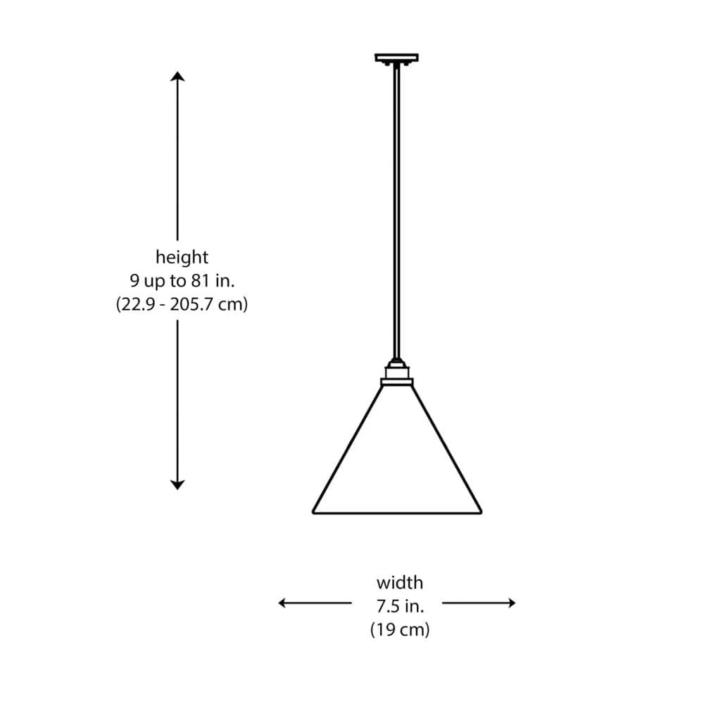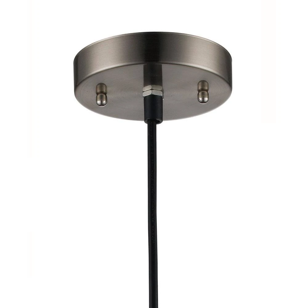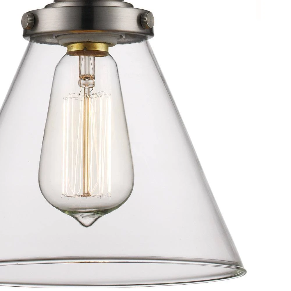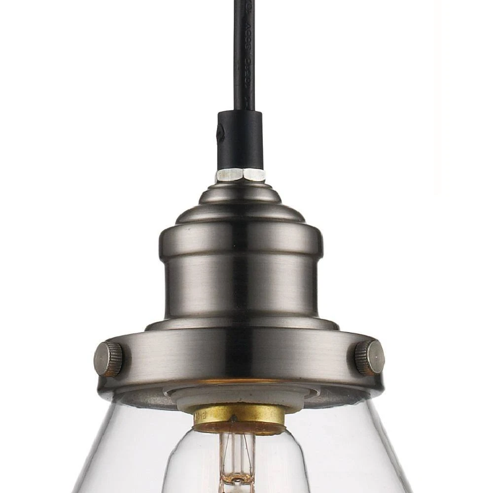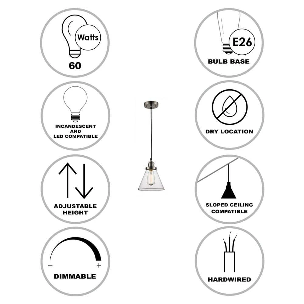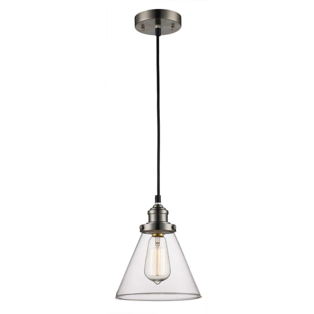This transitional mini pendant from Bel Air Lighting is designed to suit a variety of home decor styles from farmhouse to modern. The pendant is a decorative hanging light that works well in dining areas, kitchens, and other compact spaces where focused light is needed. Use as a single unit, or install as a set over a linear kitchen island or bar table for additional illumination in larger spaces. The fixture is constructed of brushed nickel metal and includes a circular ceiling plate and decorative exposed socket cover. The cone-shaped clear glass shade is open at the bottom for easy access to change the bulb. Your choice of bulb can be used in the fixture and can be dimmed when installed with a compatible dimmer switch. The pendant body hangs from a matching black wire that allows for sloped ceiling compatibility and height adjustability.
