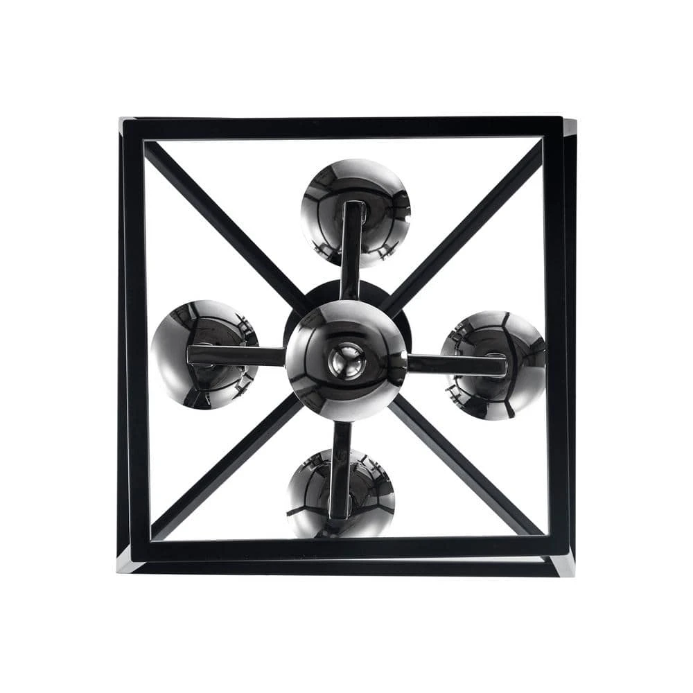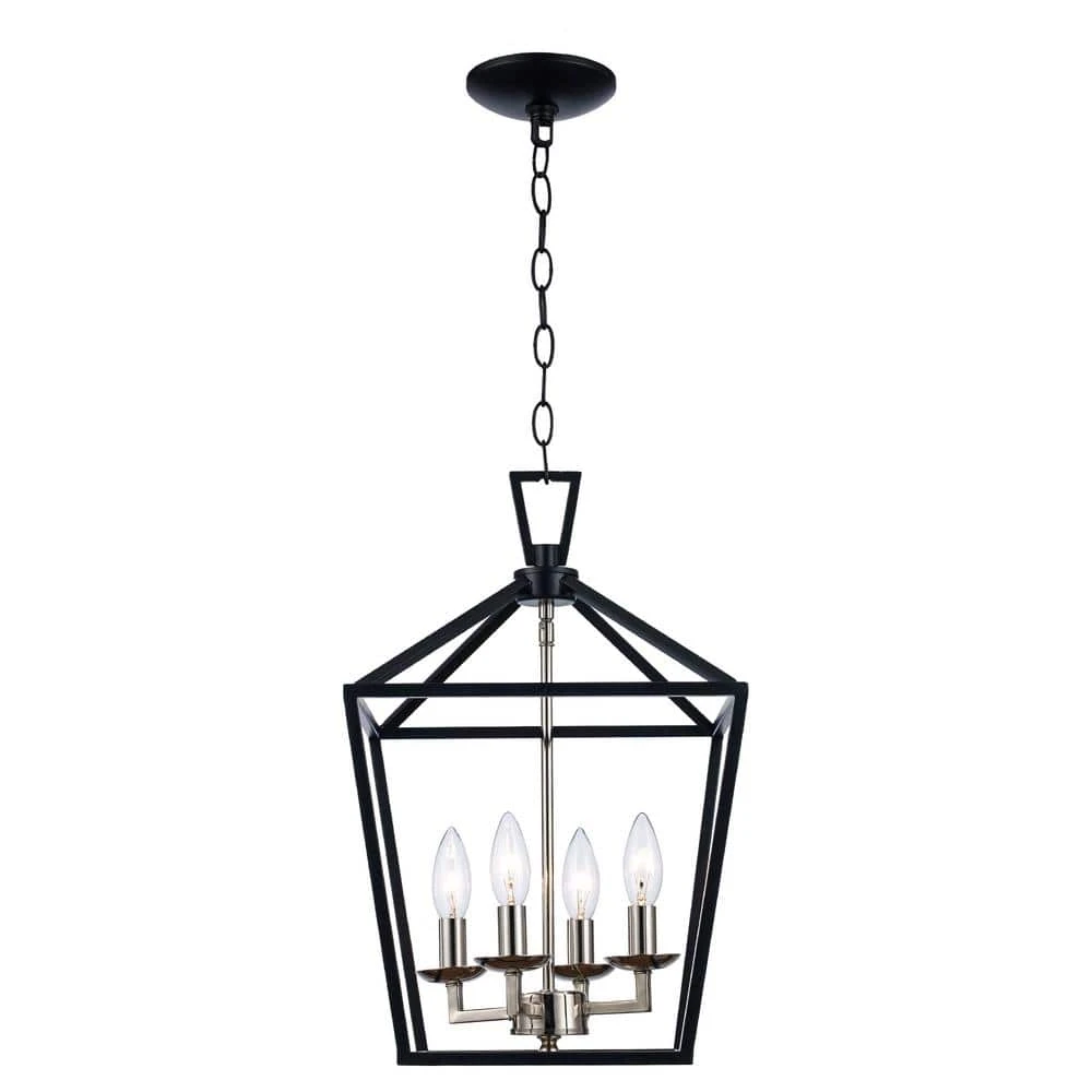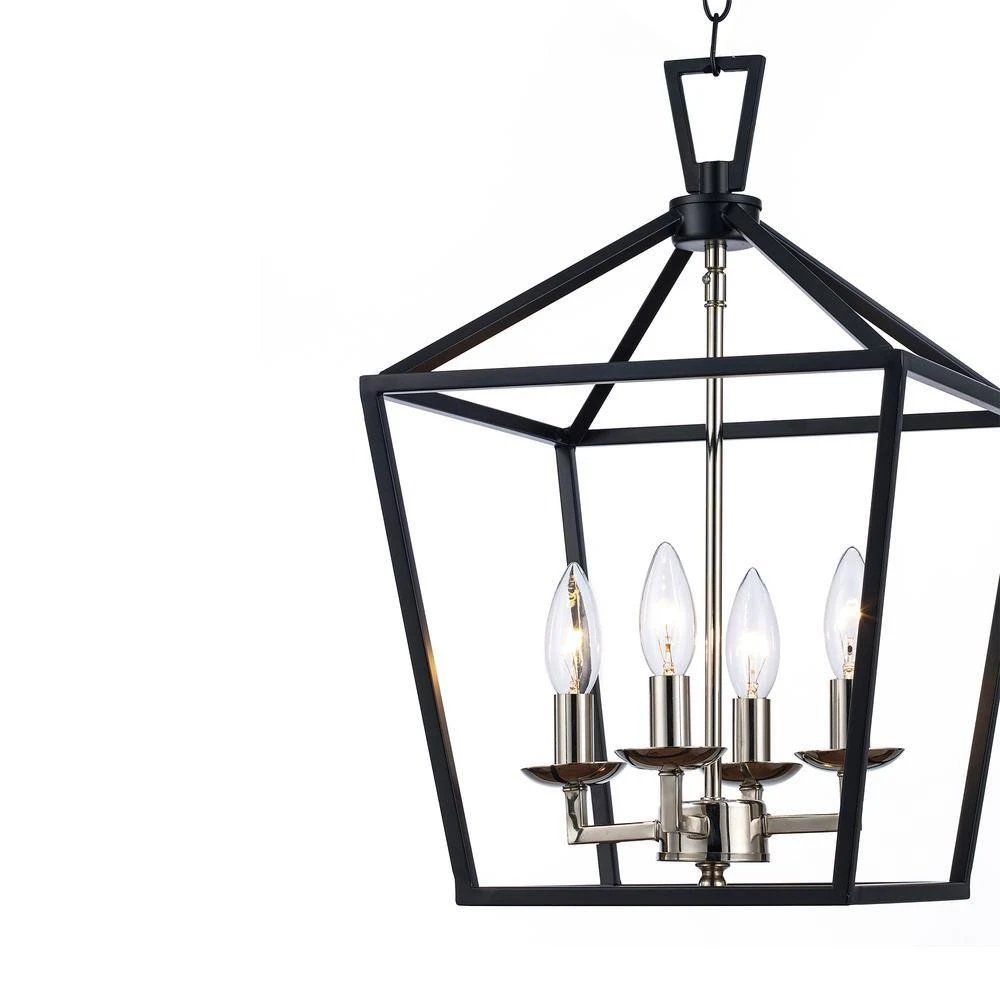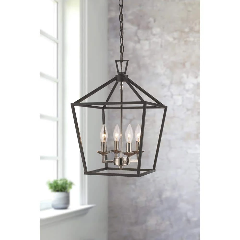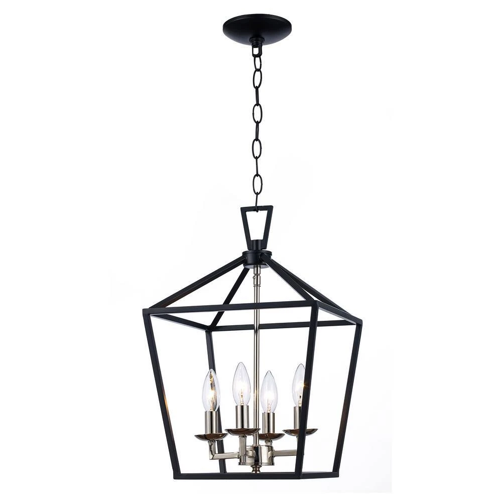 The Lacey Collection from Bel Air presents foyer, dining, and kitchen pendants designed to brighten your home’s spaces and provide stylish, farmhouse appeal to your decor. Each piece in the Lacey Collection features an open caged metal shade surrounding a cluster of candlestick-style bulb sockets. The Lacey 12 inch square pendant has a unique two-toned finish with the body of the chandelier in a striking metallic polished chrome and the metal cage finished in contrasting black. Four candelabra bulbs are visible inside the open frame of the pendant body, supplying ample illumination for a variety of uses. A chain is included for hanging, allowing for an adjustable height and sloped ceiling compatibility. Shop the Lacey Collection for additional sizes and finish options.